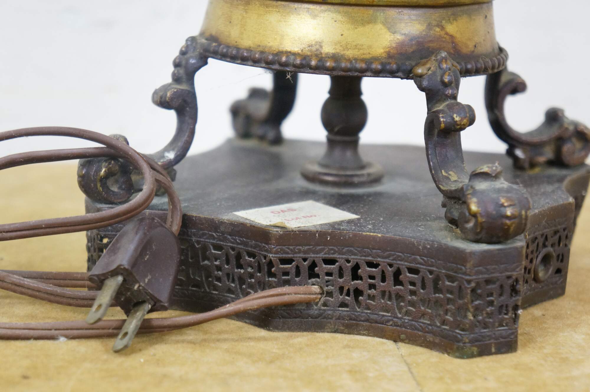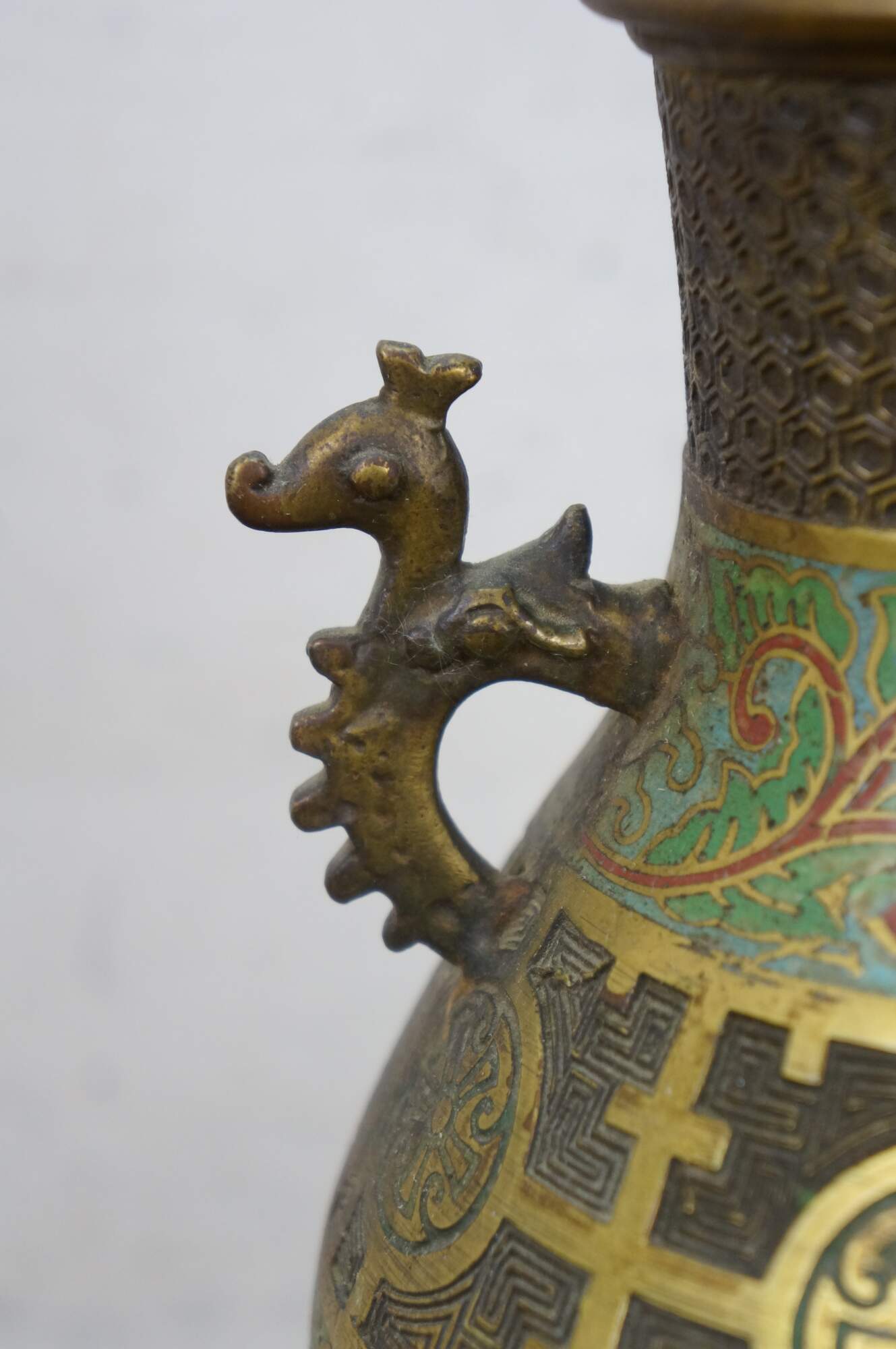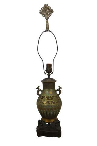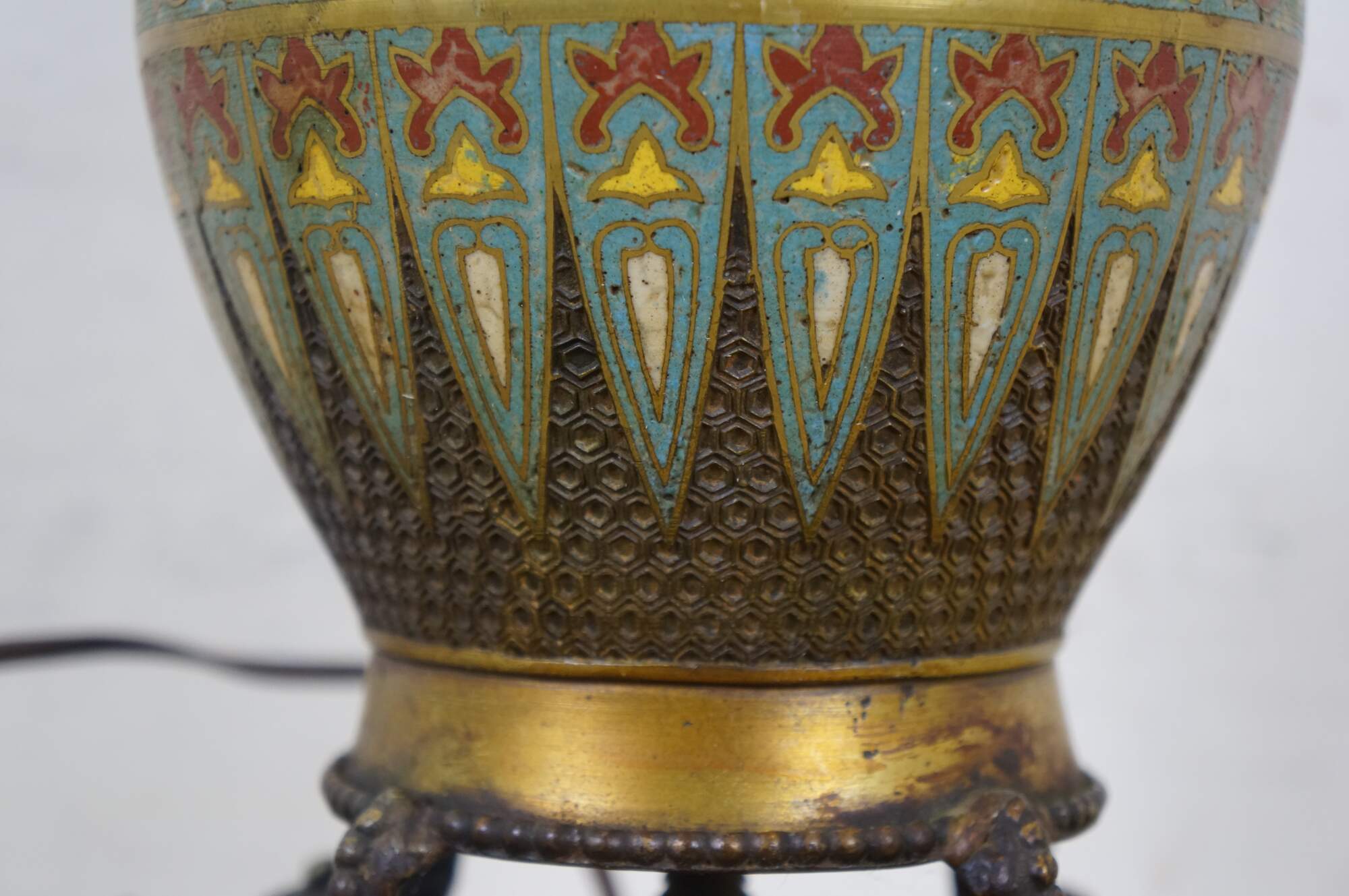 Antique Japanese champleve cloisonne enameled vase or urn, converted to a lamp mounted to a pierced / reticulated base with c scroll supports.