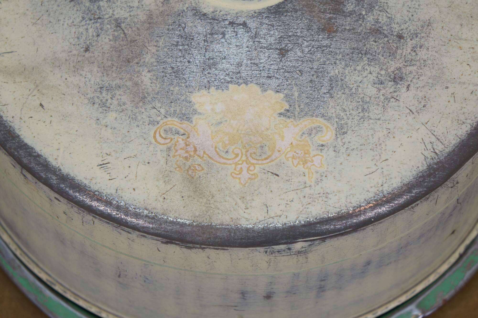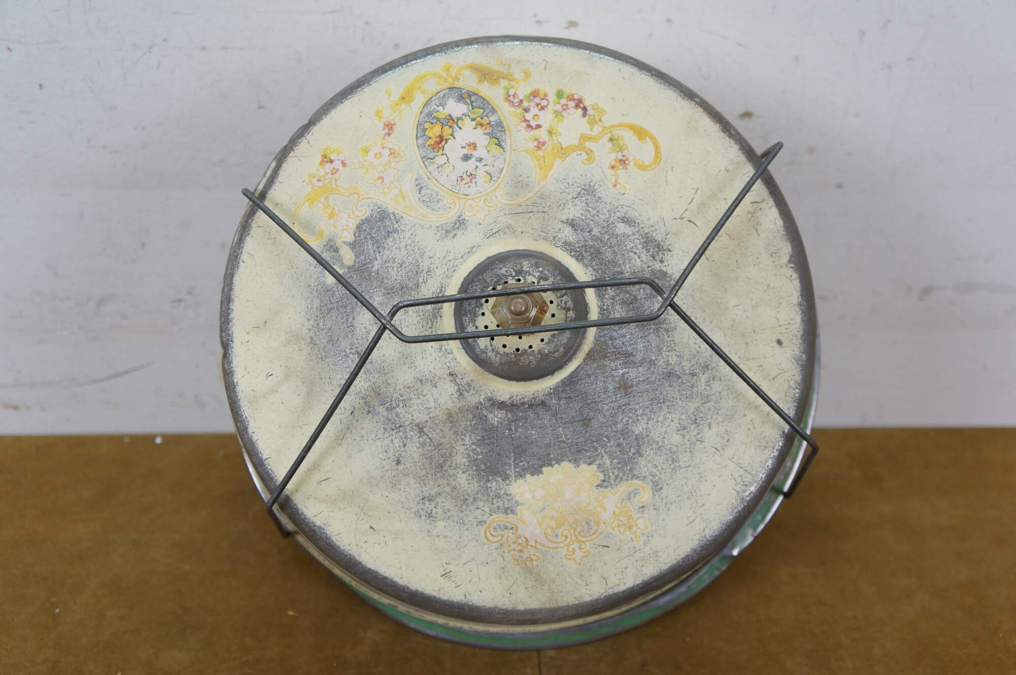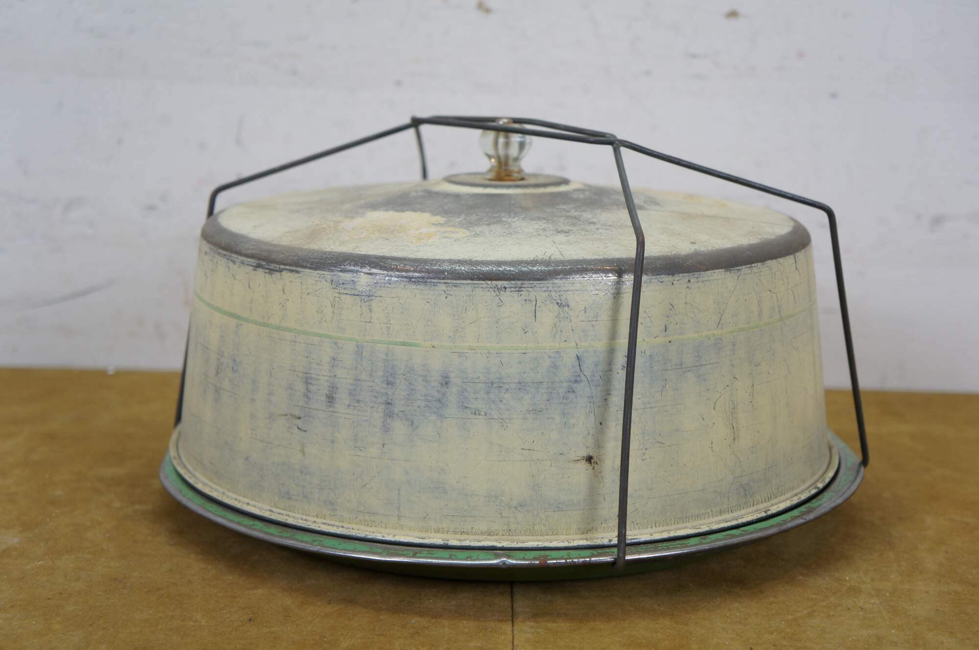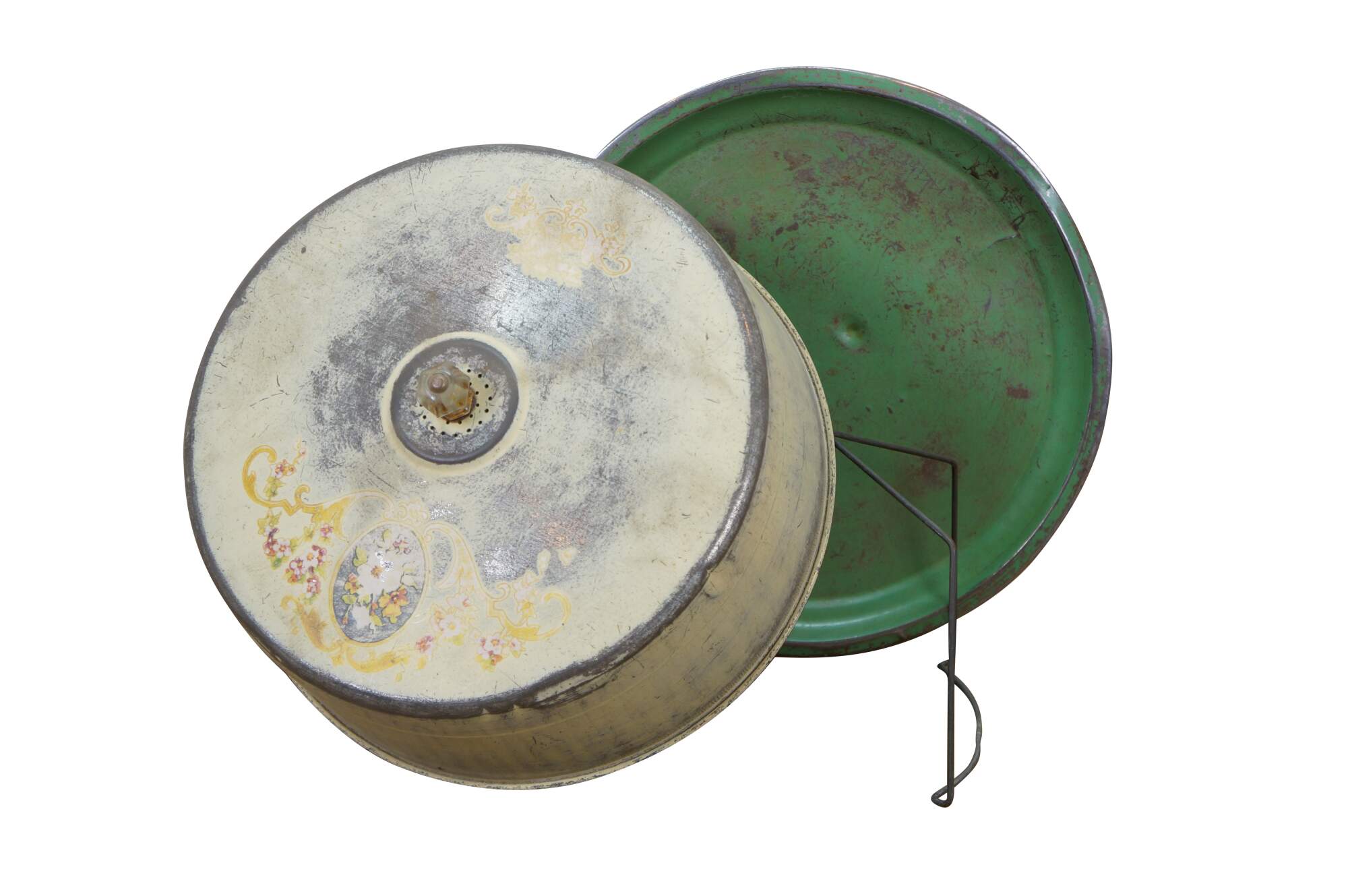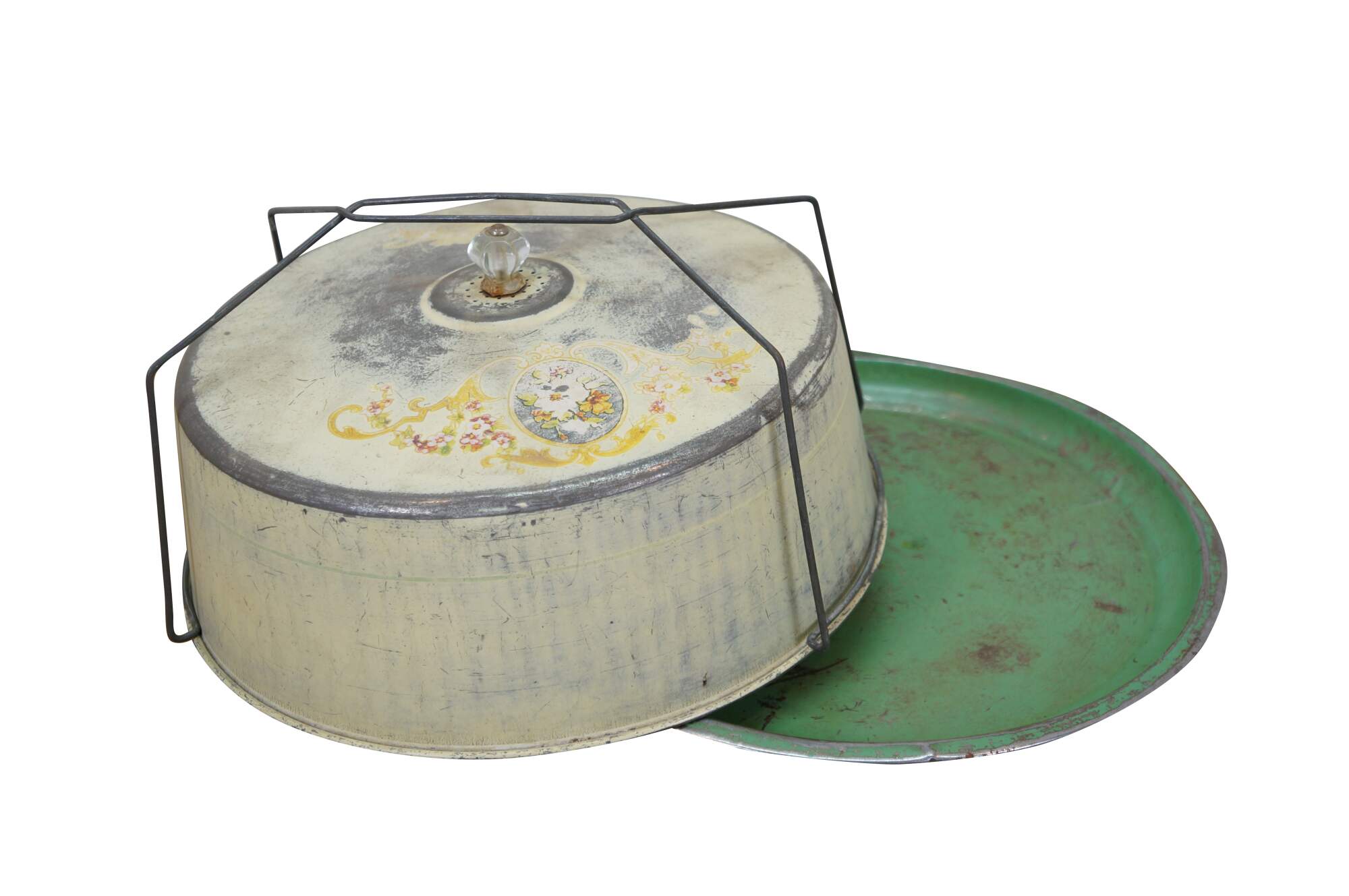 Early to mid-20th century painted metal cake carrier. Green underplate with cream-colored lid, accented with scrollwork and flowers. Vented with holes around the clear glass handle / finial. Includes wire frame to lock top and bottom together for secure transport.