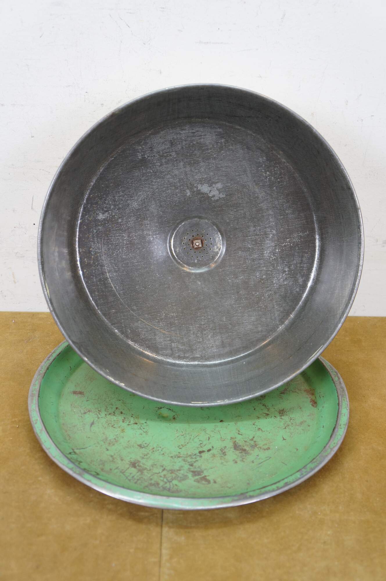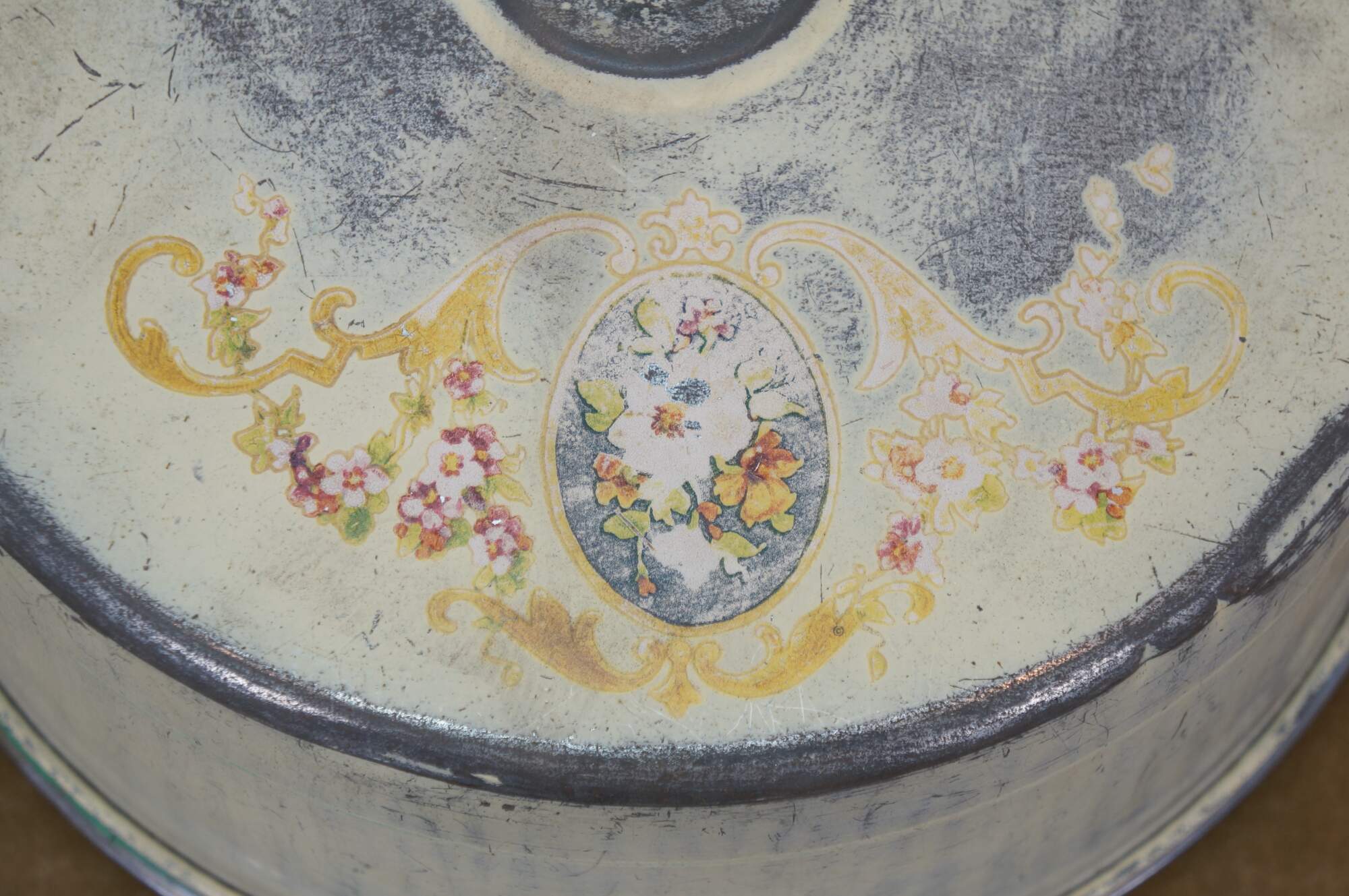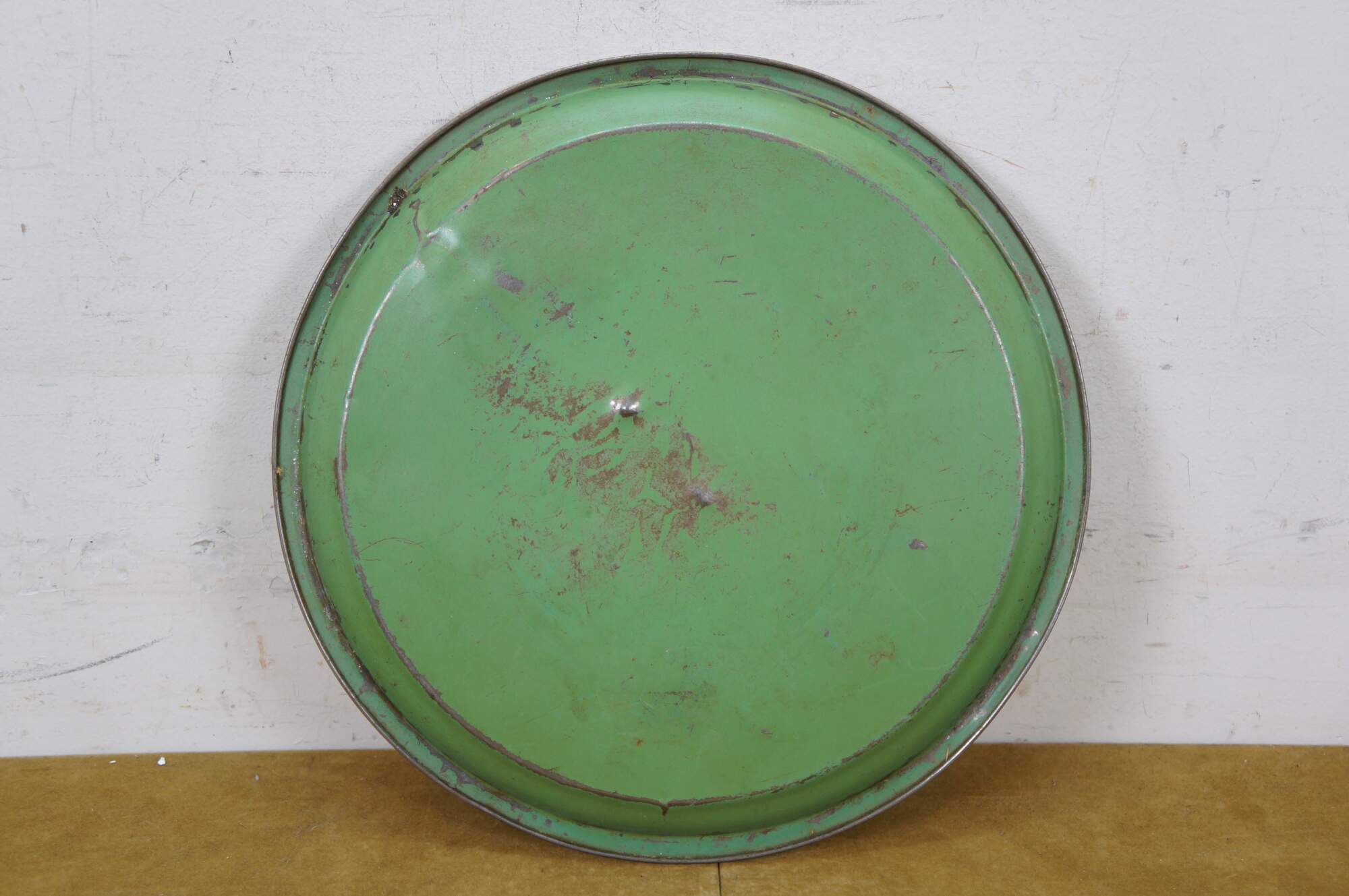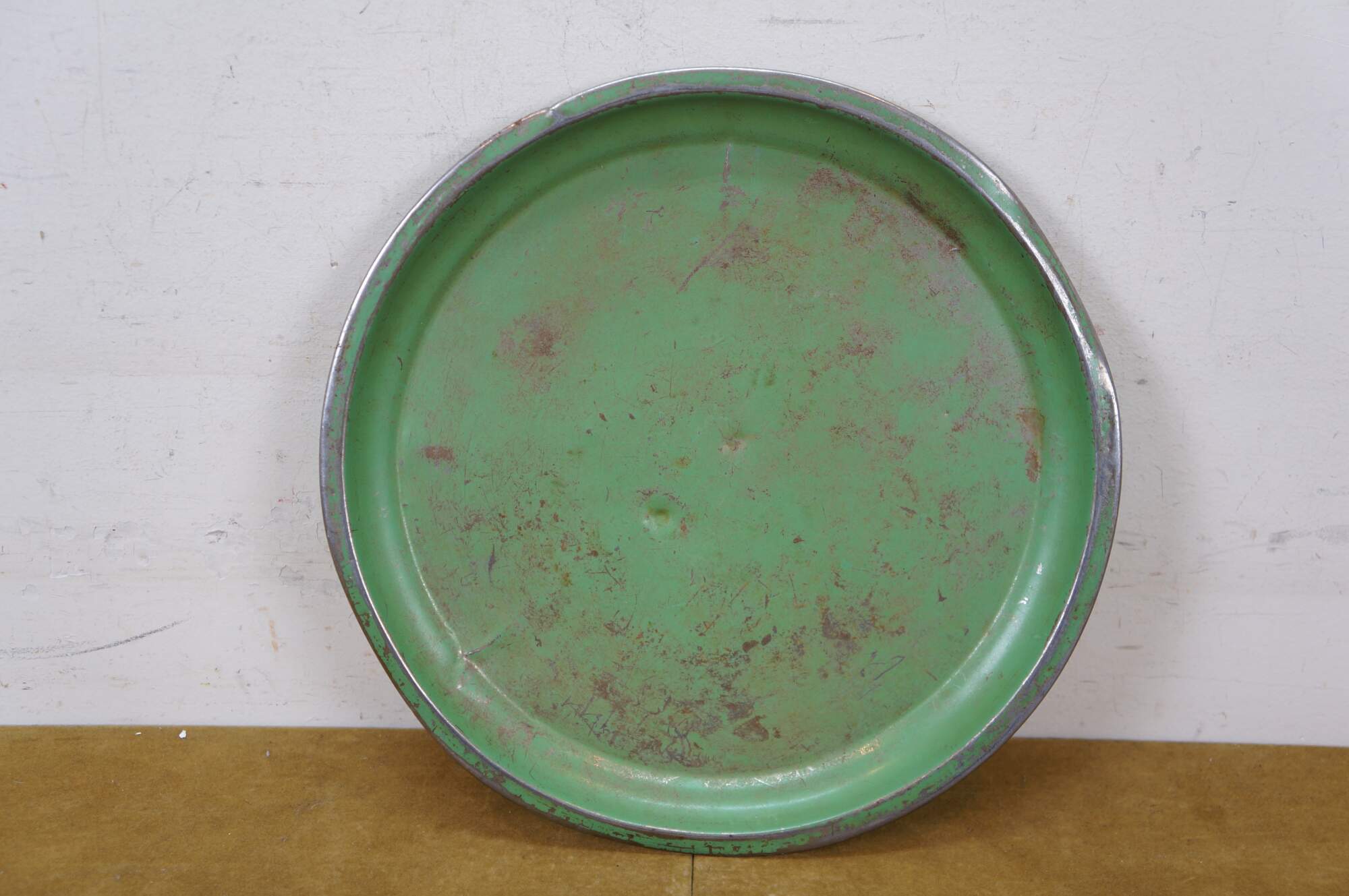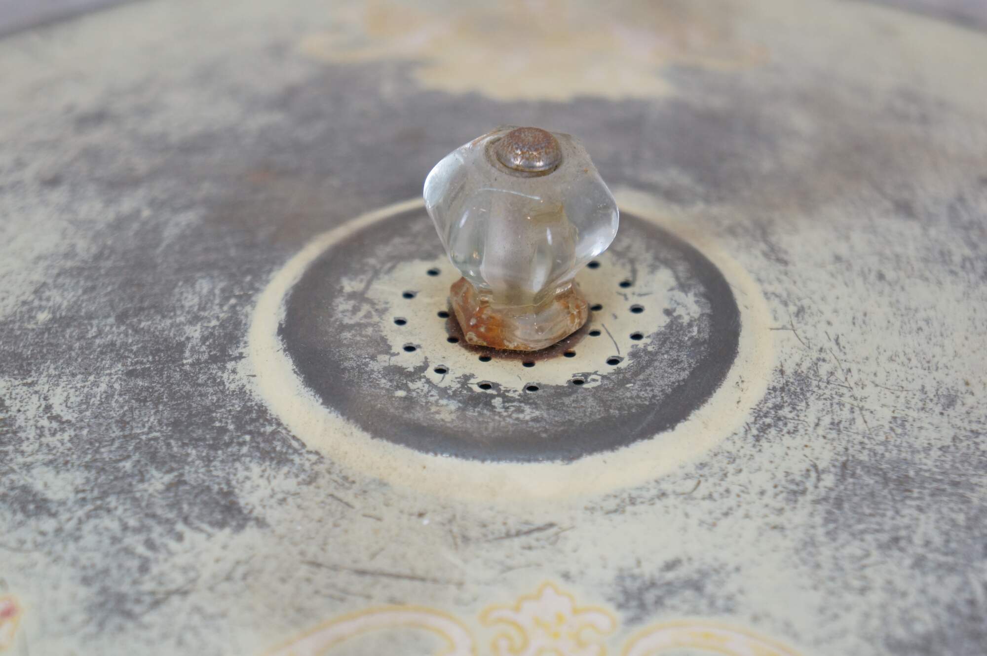 Early to mid-20th century painted metal cake carrier. Green underplate with cream-colored lid, accented with scrollwork and flowers. Vented with holes around the clear glass handle / finial. Includes wire frame to lock top and bottom together for secure transport.
