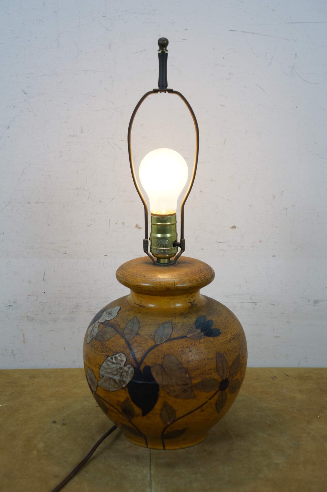 Mid to late 20th century ceramic table lamp in the shape of a round orange pot / urn, etched and decopaged in brown, black, and metallic silver with stems of flowers. Includes harp / finial.