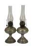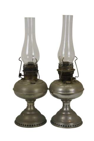 Antique Rayo nickel plated hurricane oil lanterns featuring a reticulated base and glass hurricane.