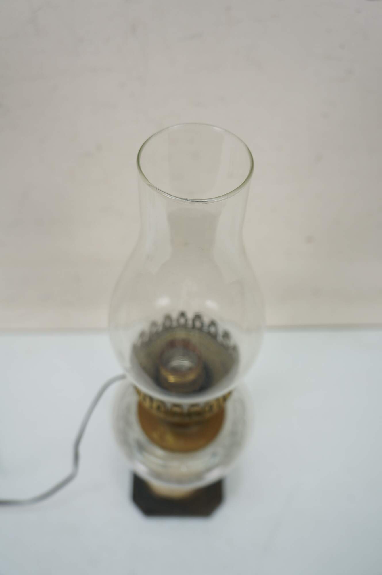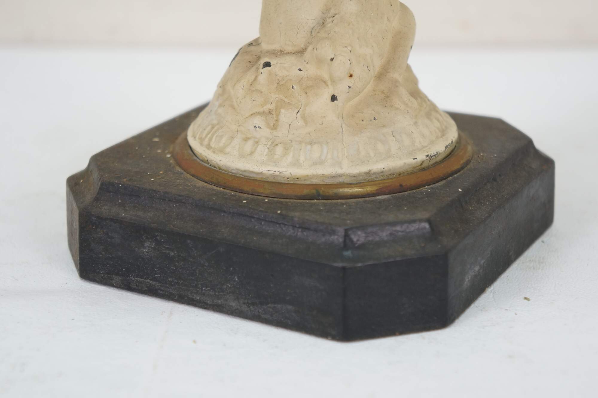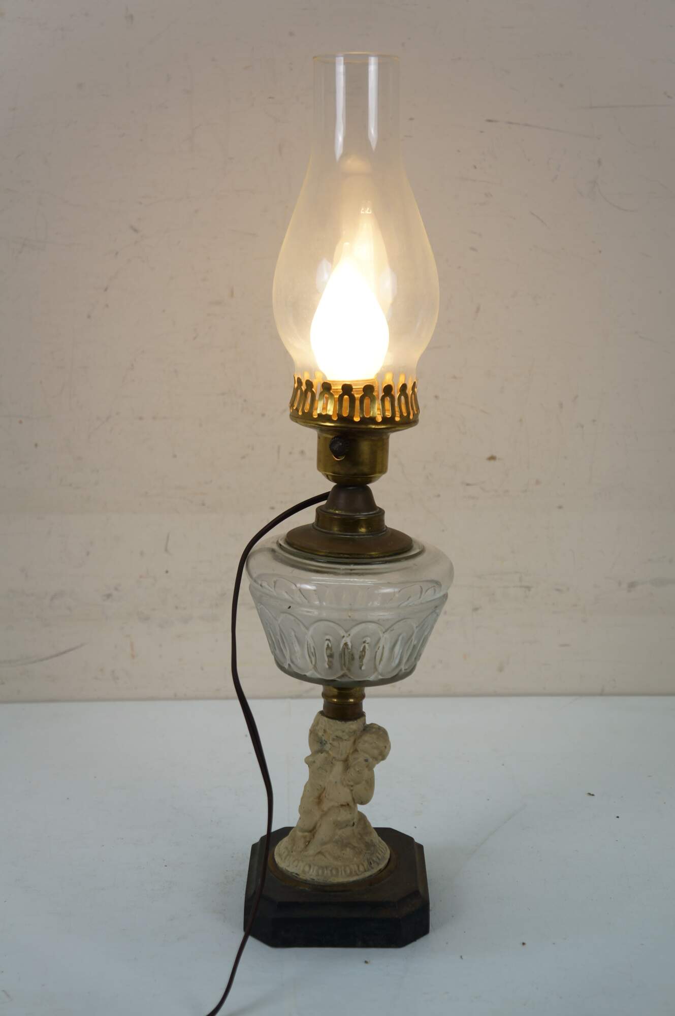 Antique converted oil lamp featuring white neoclassical figure of a child / cherub eating grapes with his dog, round brass reservoir, brass top, glass hurricane, and black painted metal base.