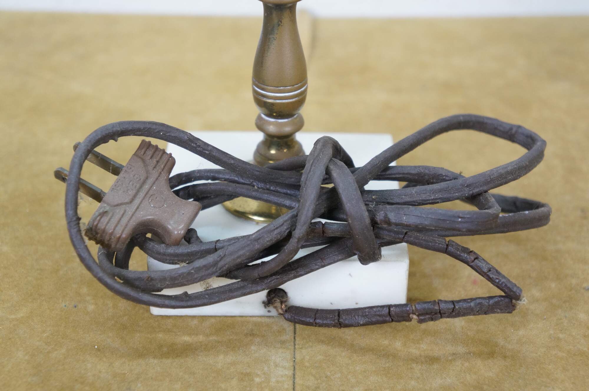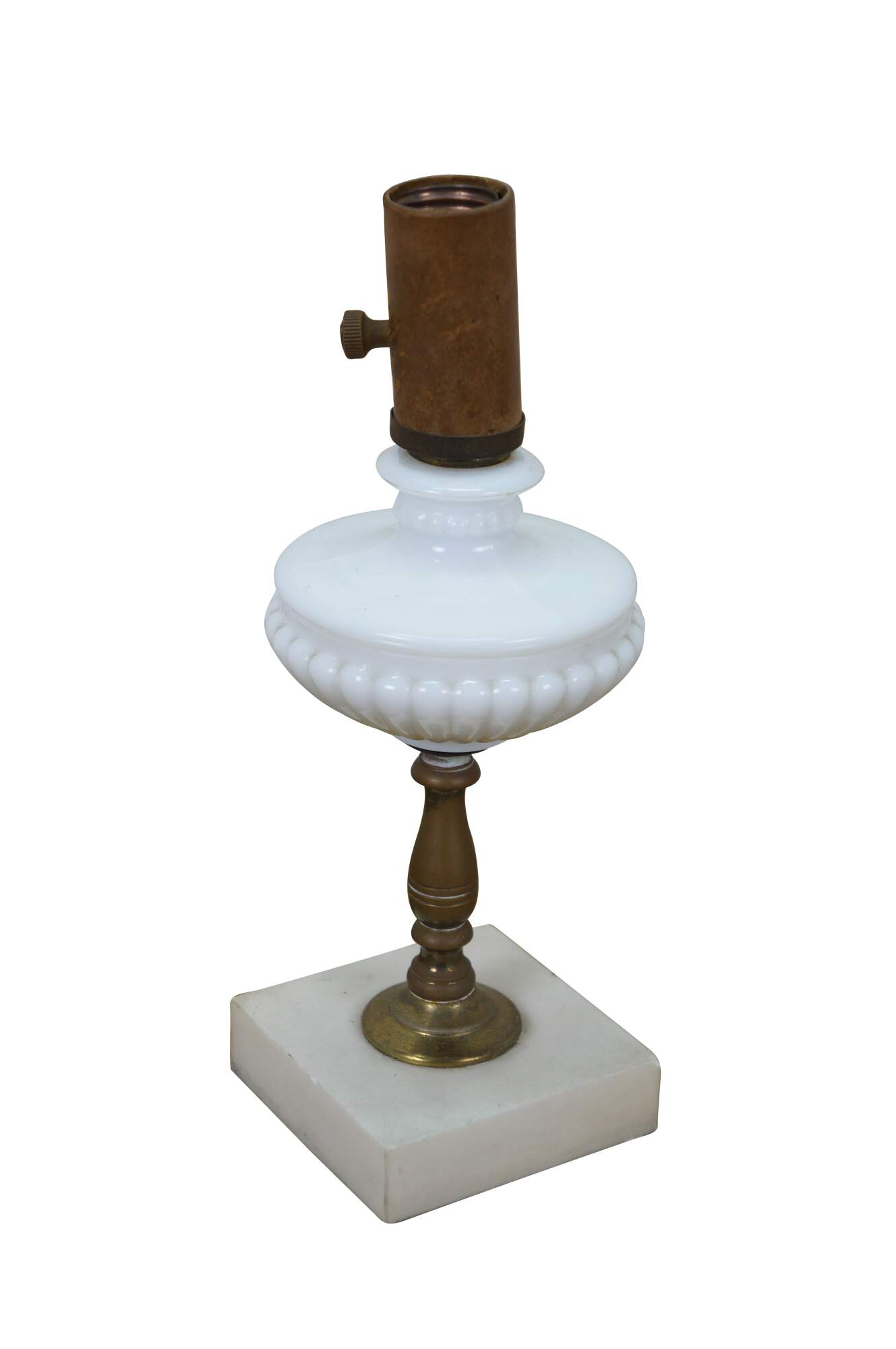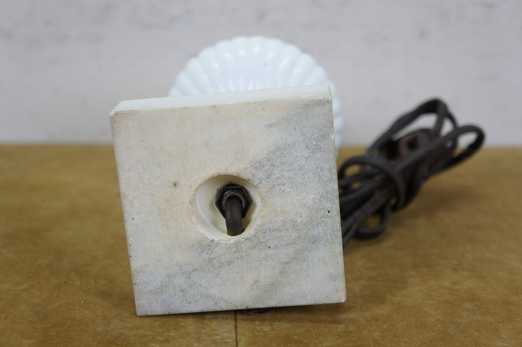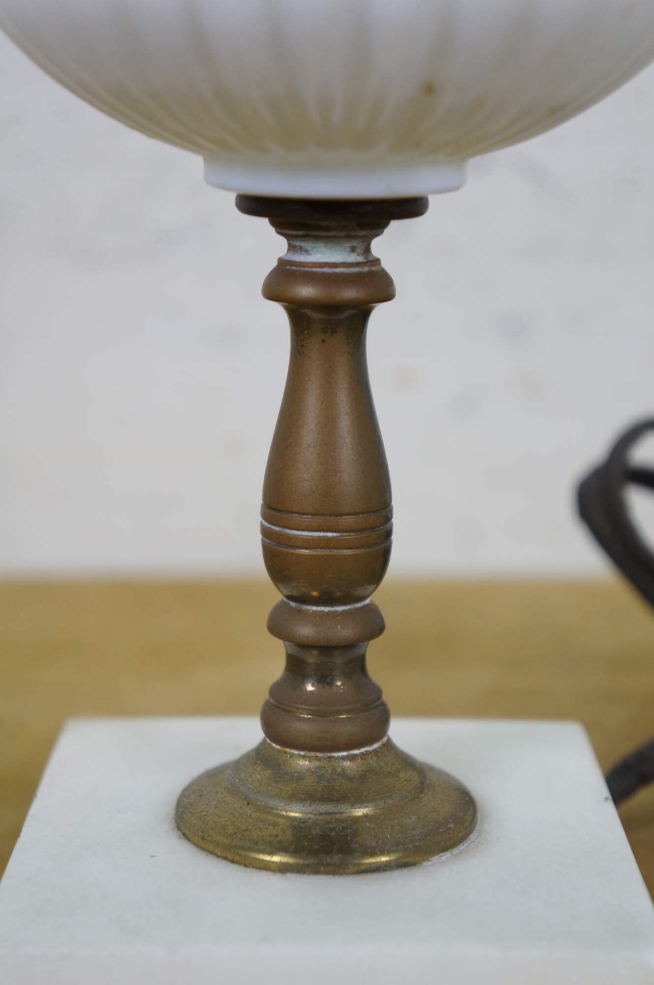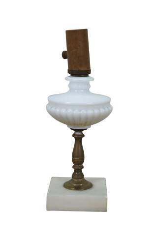 Mid to early 20th century budoir / table lamp - fluted squat bottle shaped milk glass top over a brass balustrade shaped column and a square marble base; faux candle cover on socket. Cord crumbling; needs rewiring.