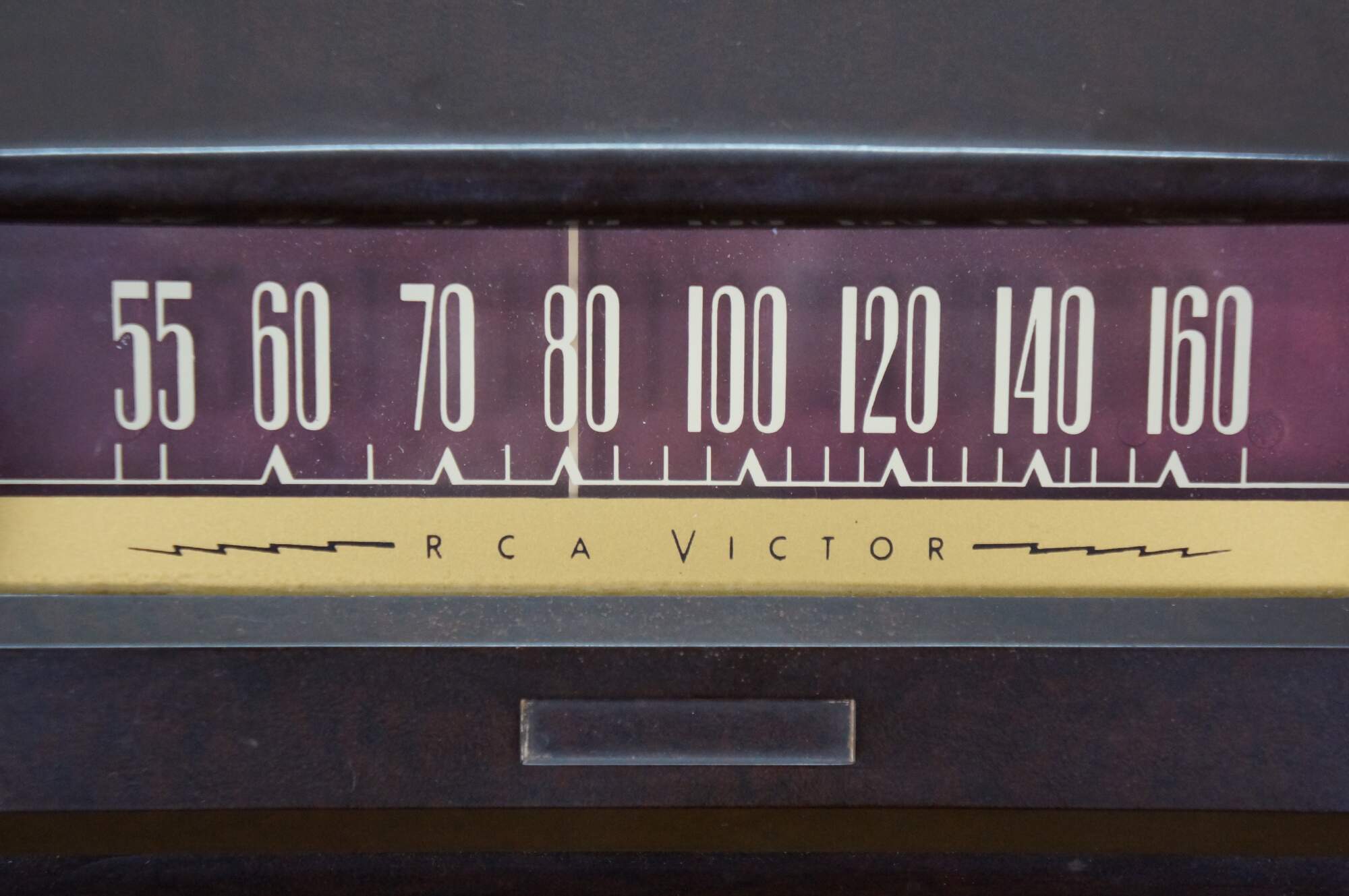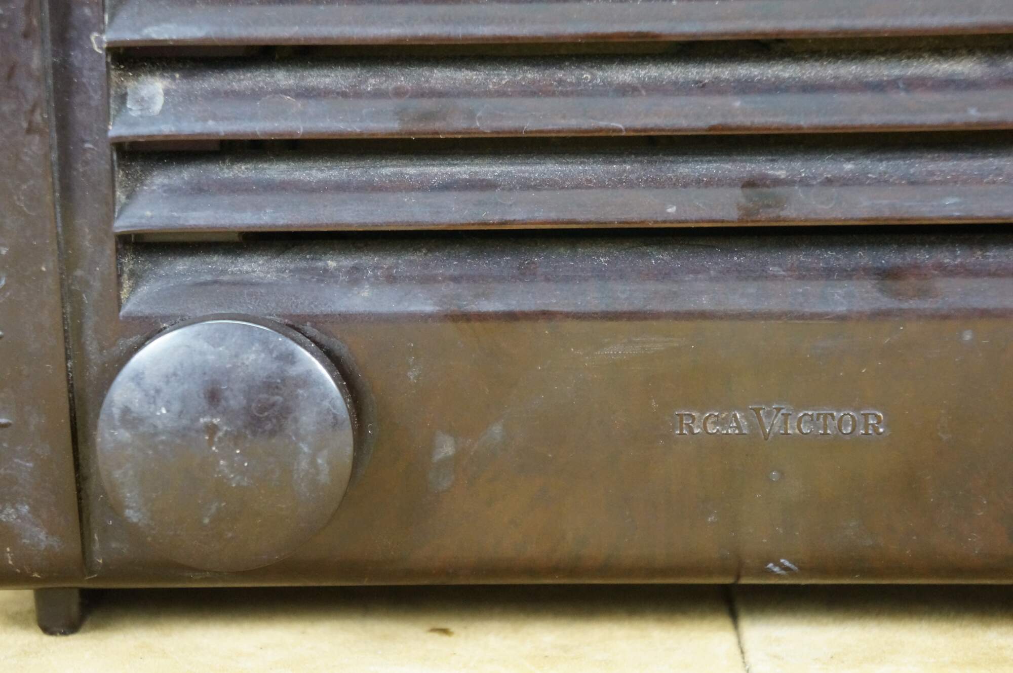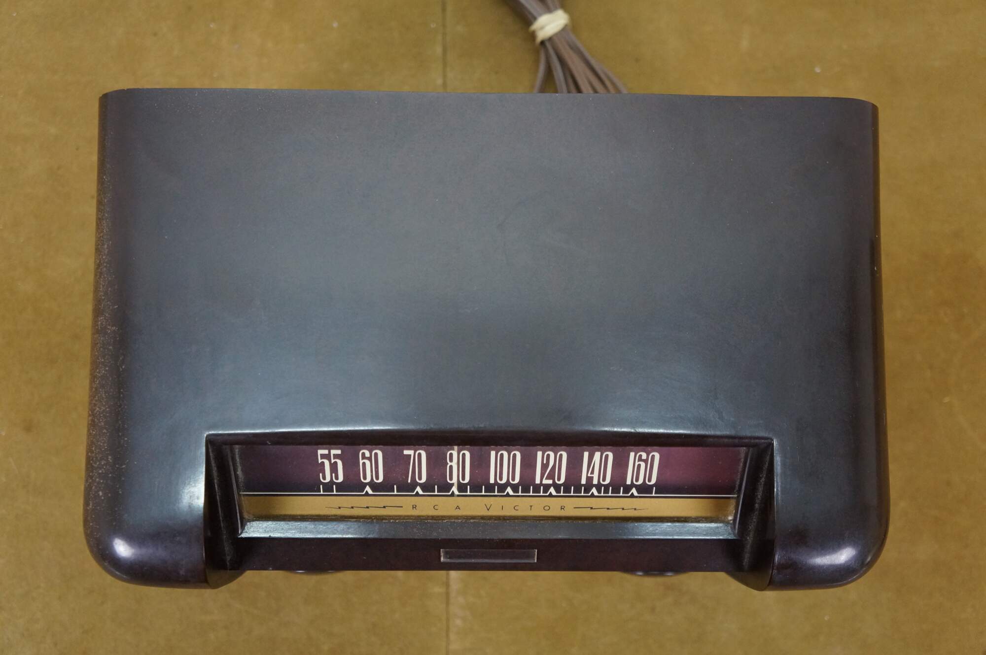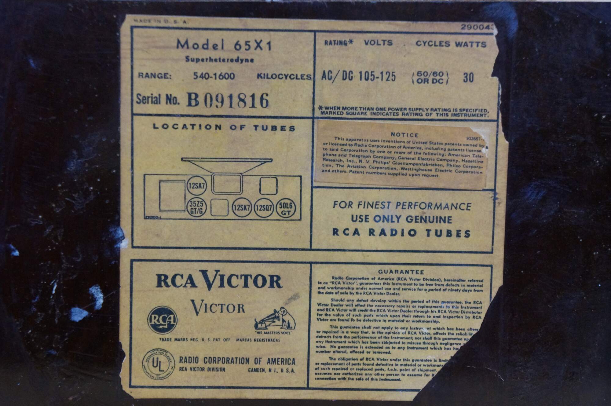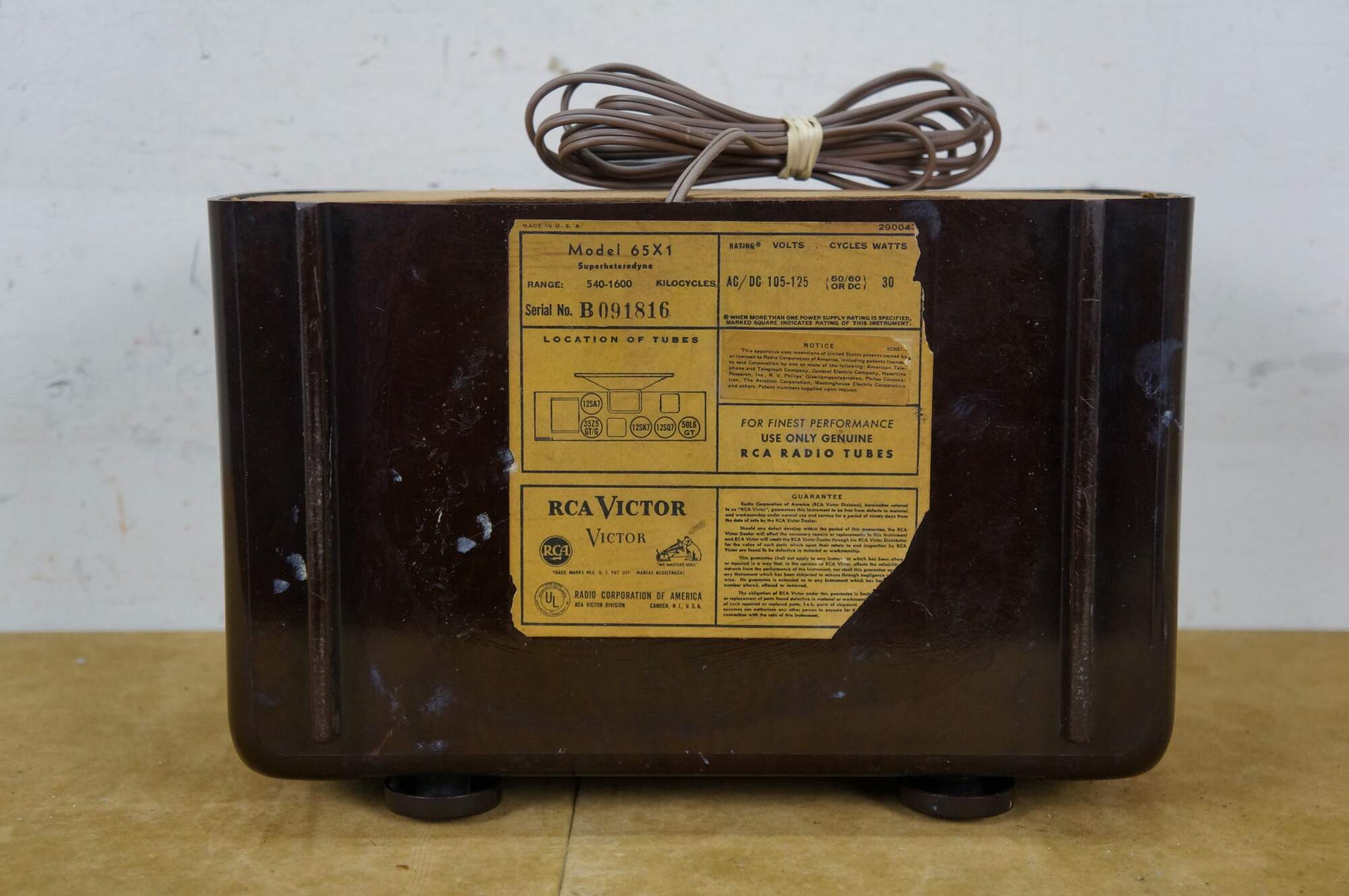 Circa 1940's RCA Victor brown bakelite radio. Model 65X1 - Superheterodyne - Range: 540-1600 Kilocycles - Serial No. B091816 - AC/DC 105-125 volts, 50/60 or DC Cycles, 30 watts - Radio Corporation of America, Camden, NJ, USA. Made in USA.
