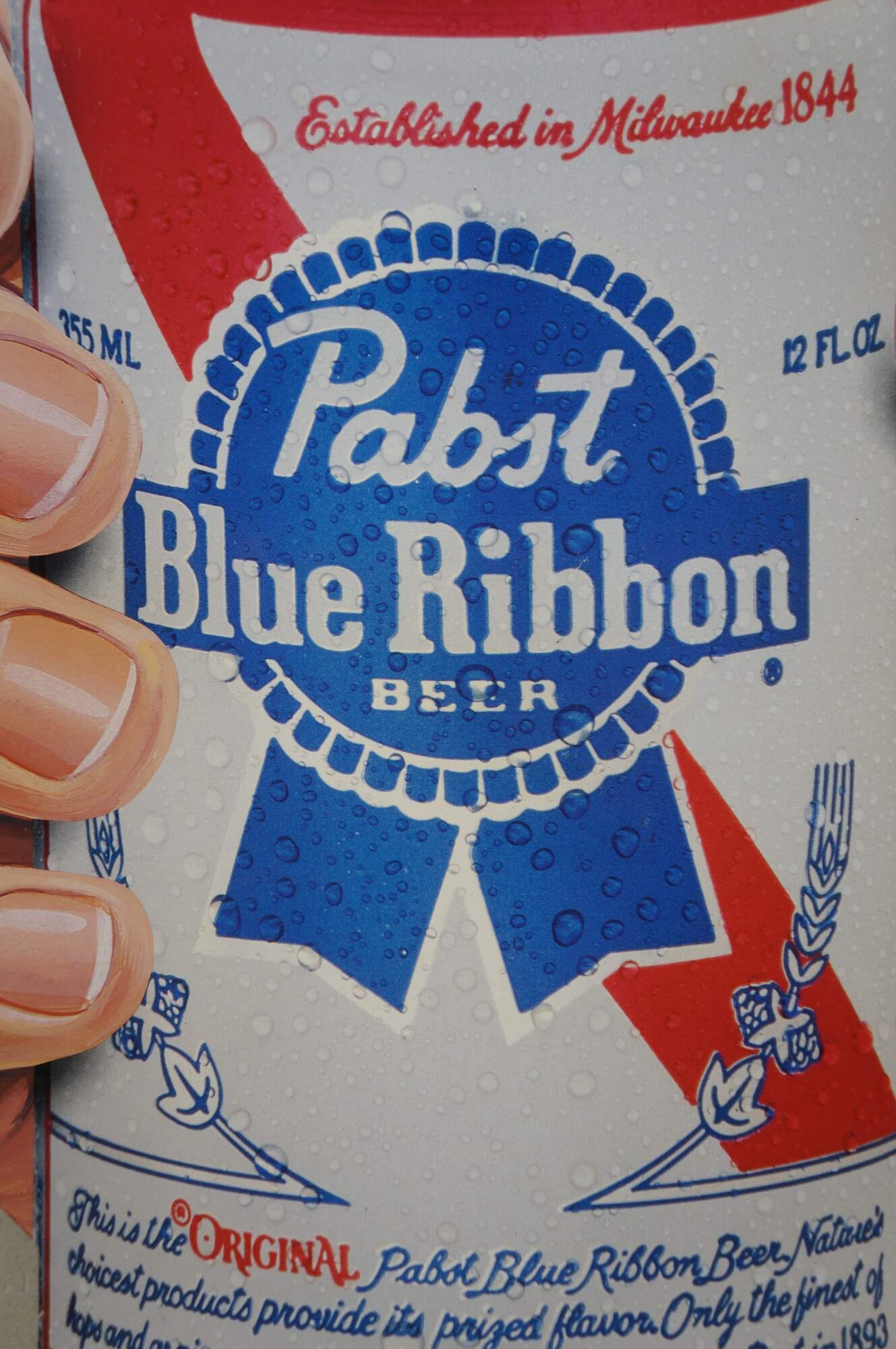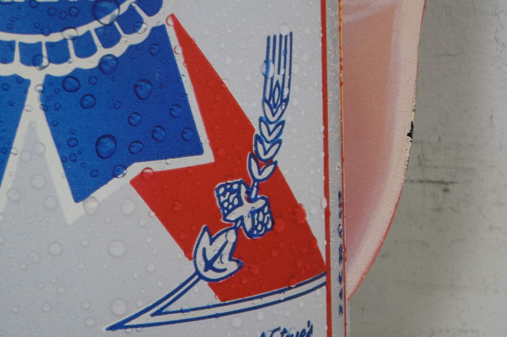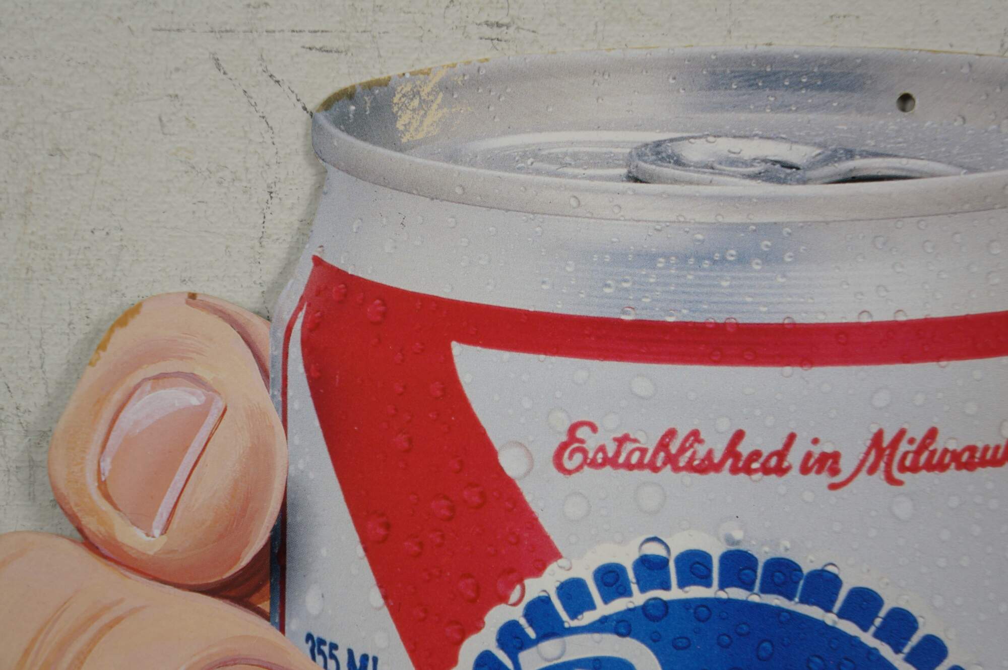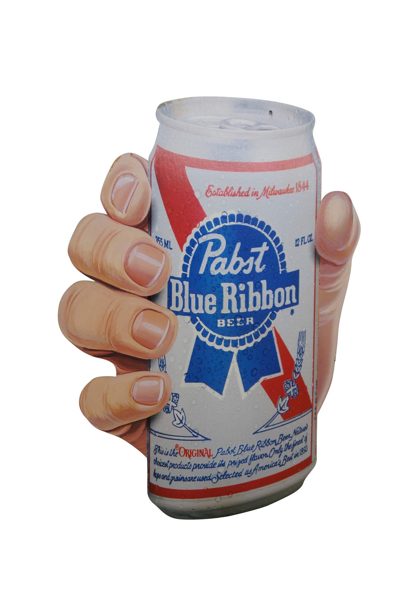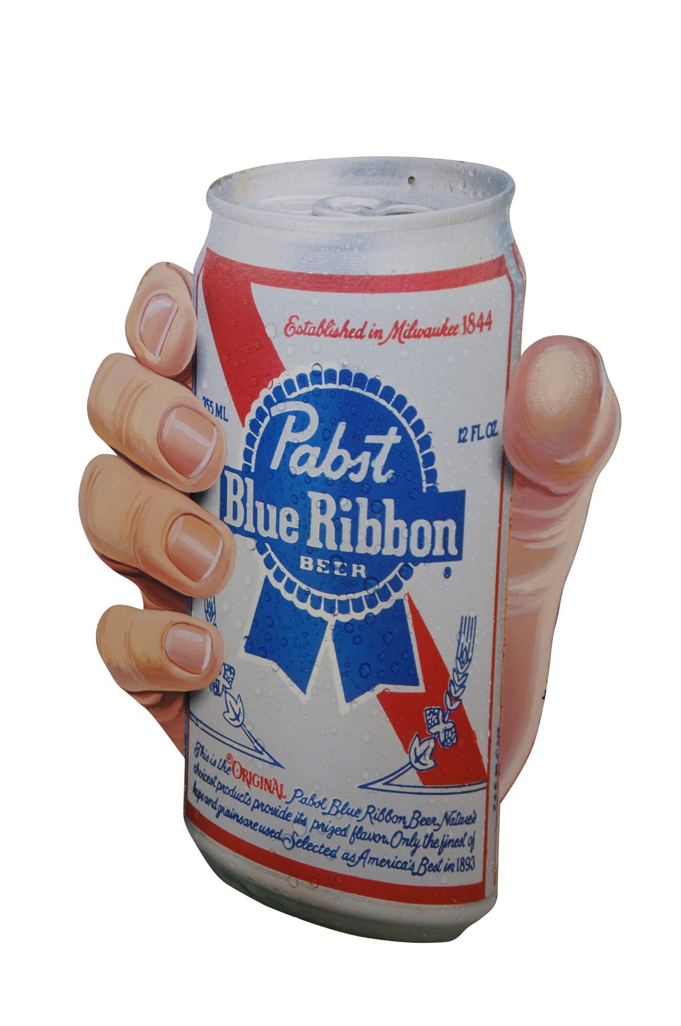 Vintage late 20th century cardboard hanging bar sign advertising Pabst Blue Ribbon Beer. Features a hand clasping a can of PBR. Hole for string in top edge.