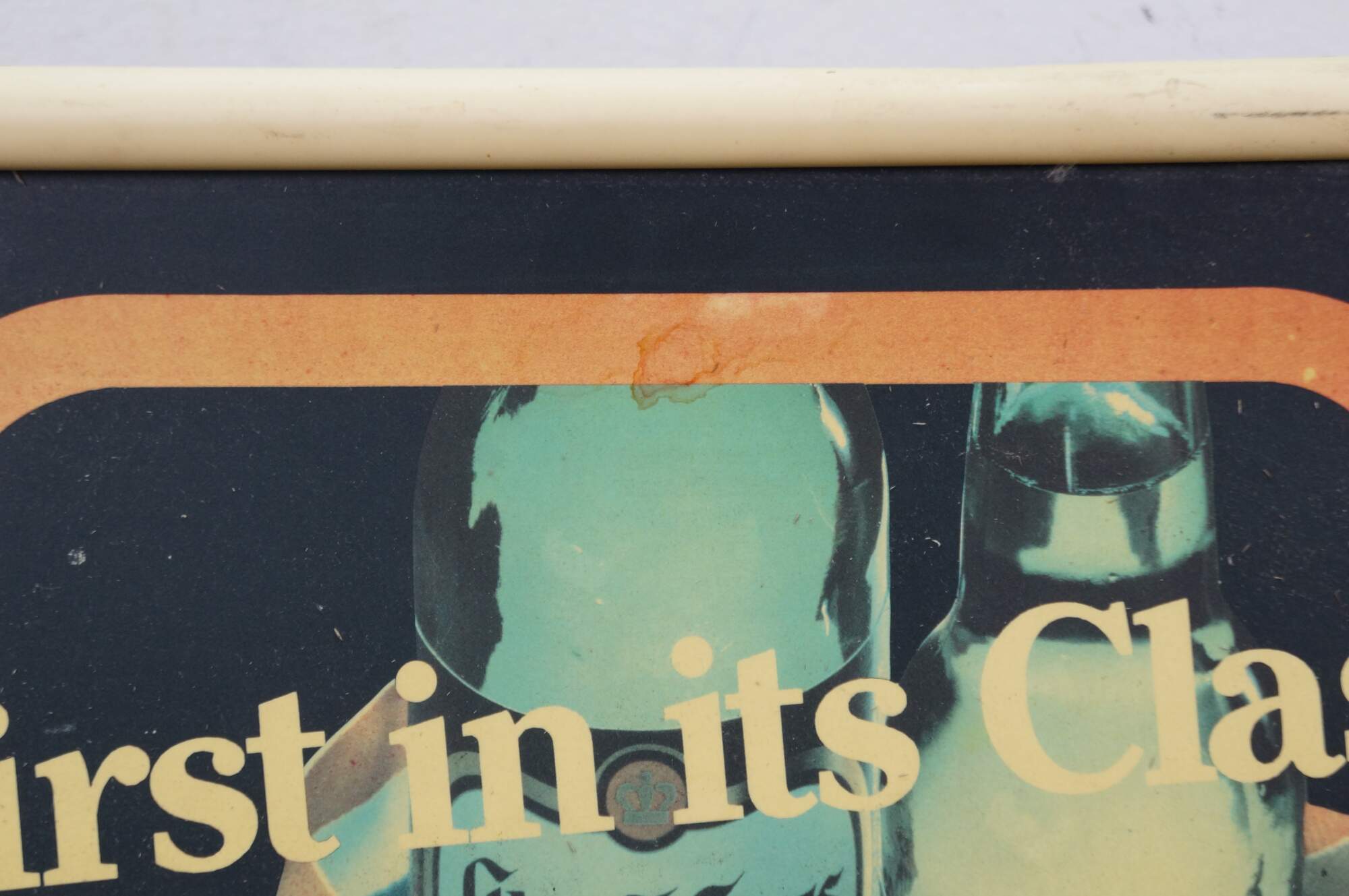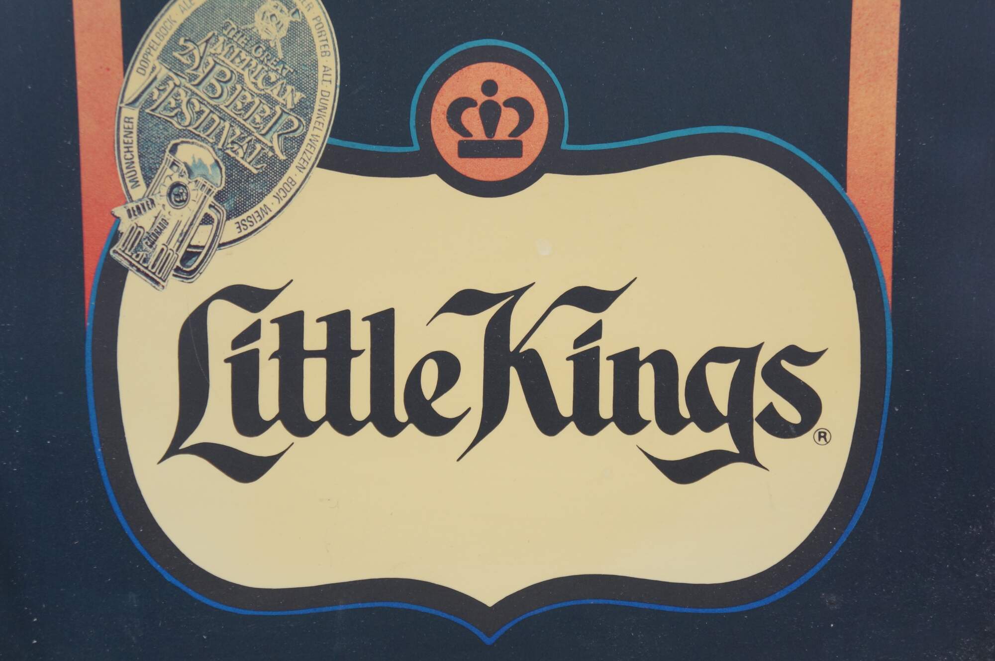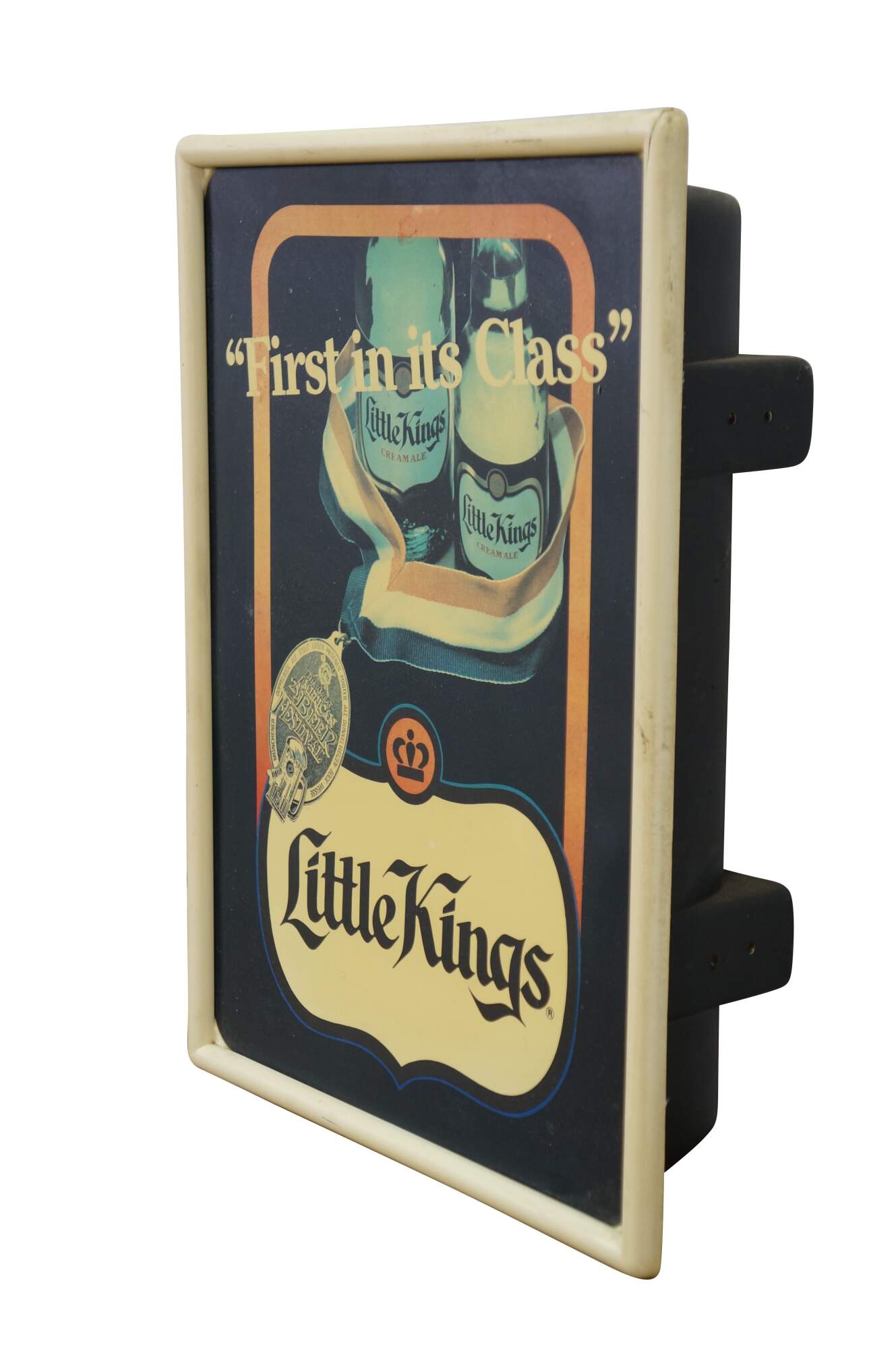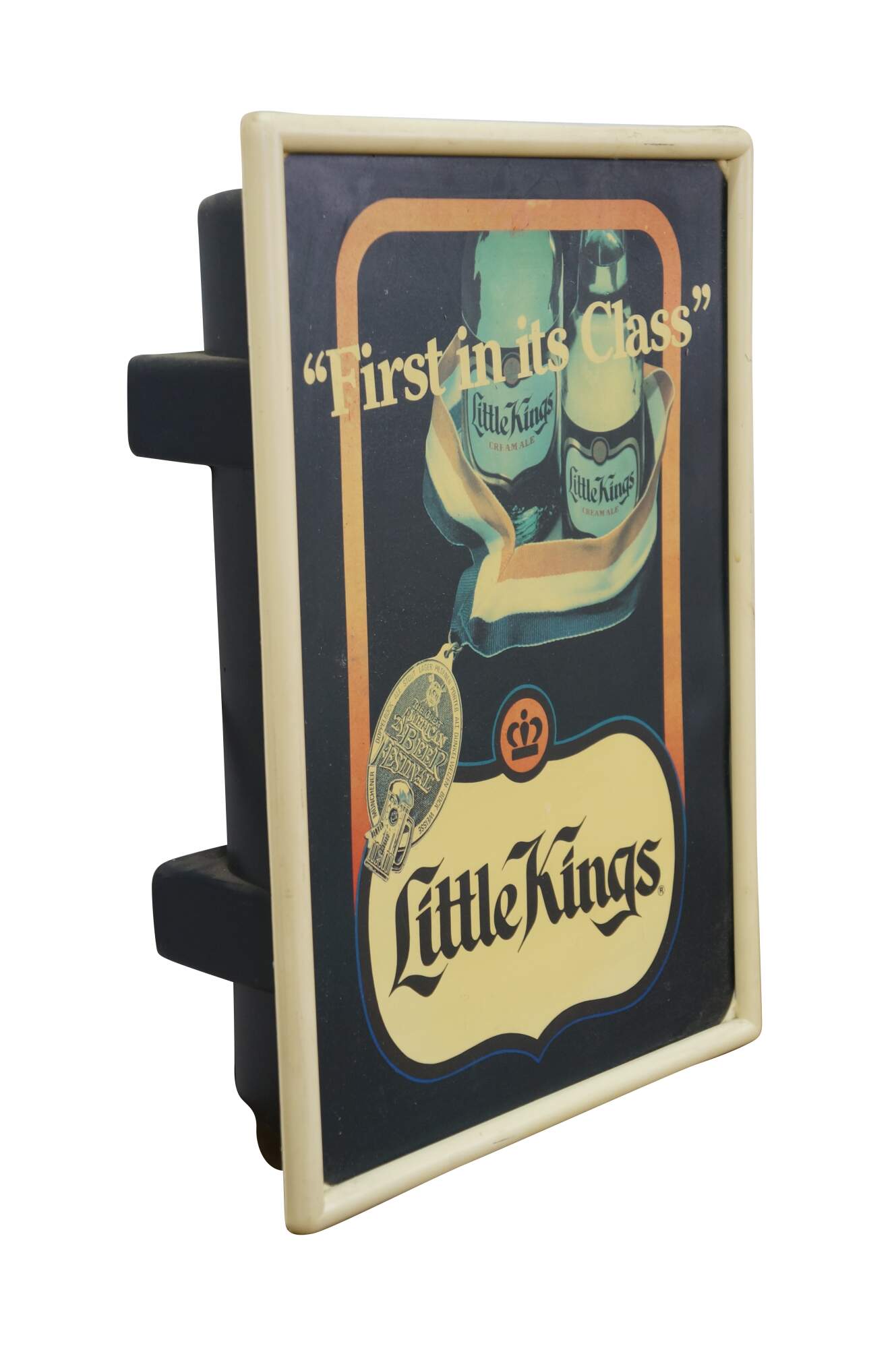 Vintage late 20th century molded plastic illuminated / light up bar sign advertising Little Kngs Cream Ale. Black background with white frame, printed with a pair of Little Kings Cream Ale bottles wrapped in a prize ribbon , superimposed with the phrase "First In Its Class," over the Little Kings label. The Great American Beer Festival. Schoenling Brewing Company, Cincinnati, Ohio. Manufactured by American Sign and Marketing Services Inc, Florence, KY.