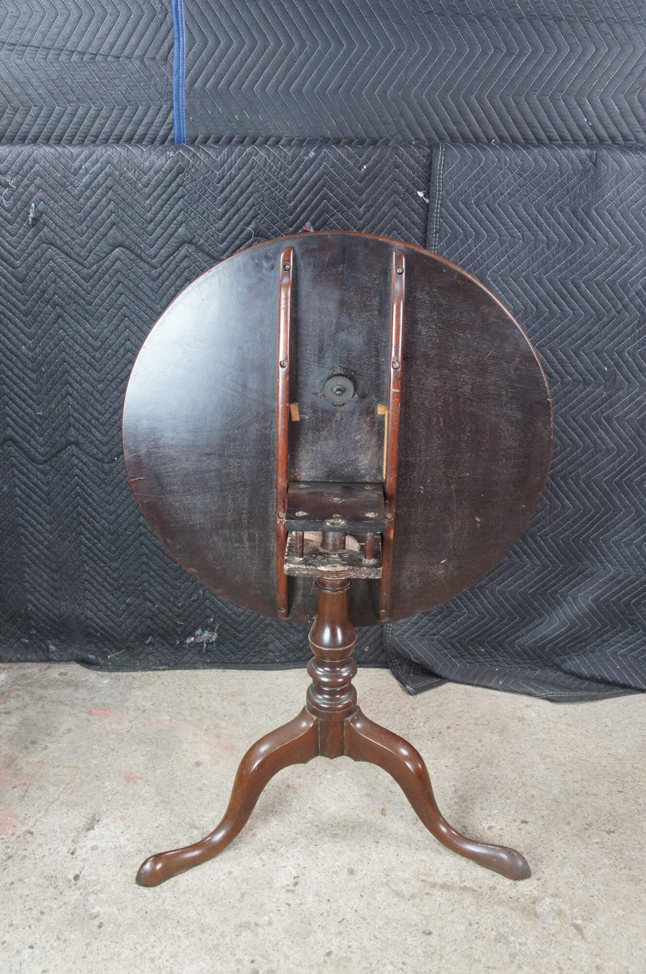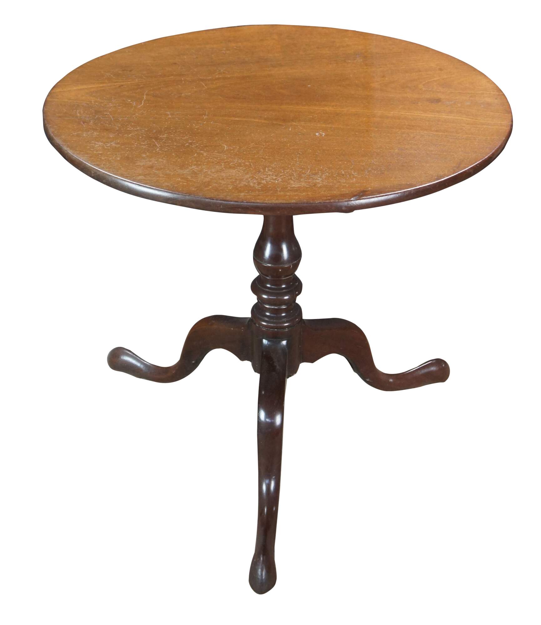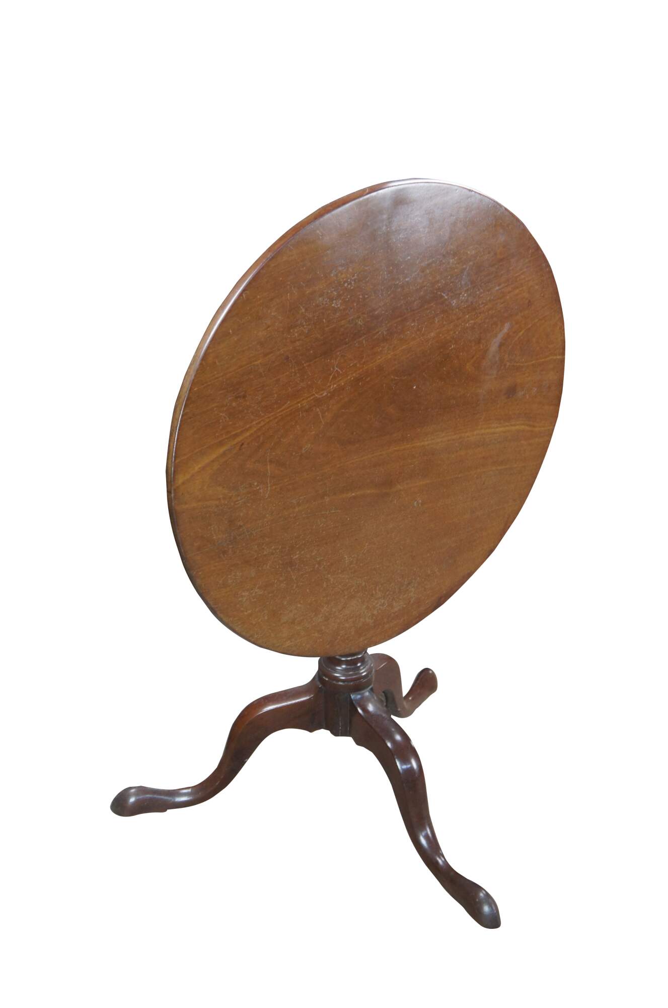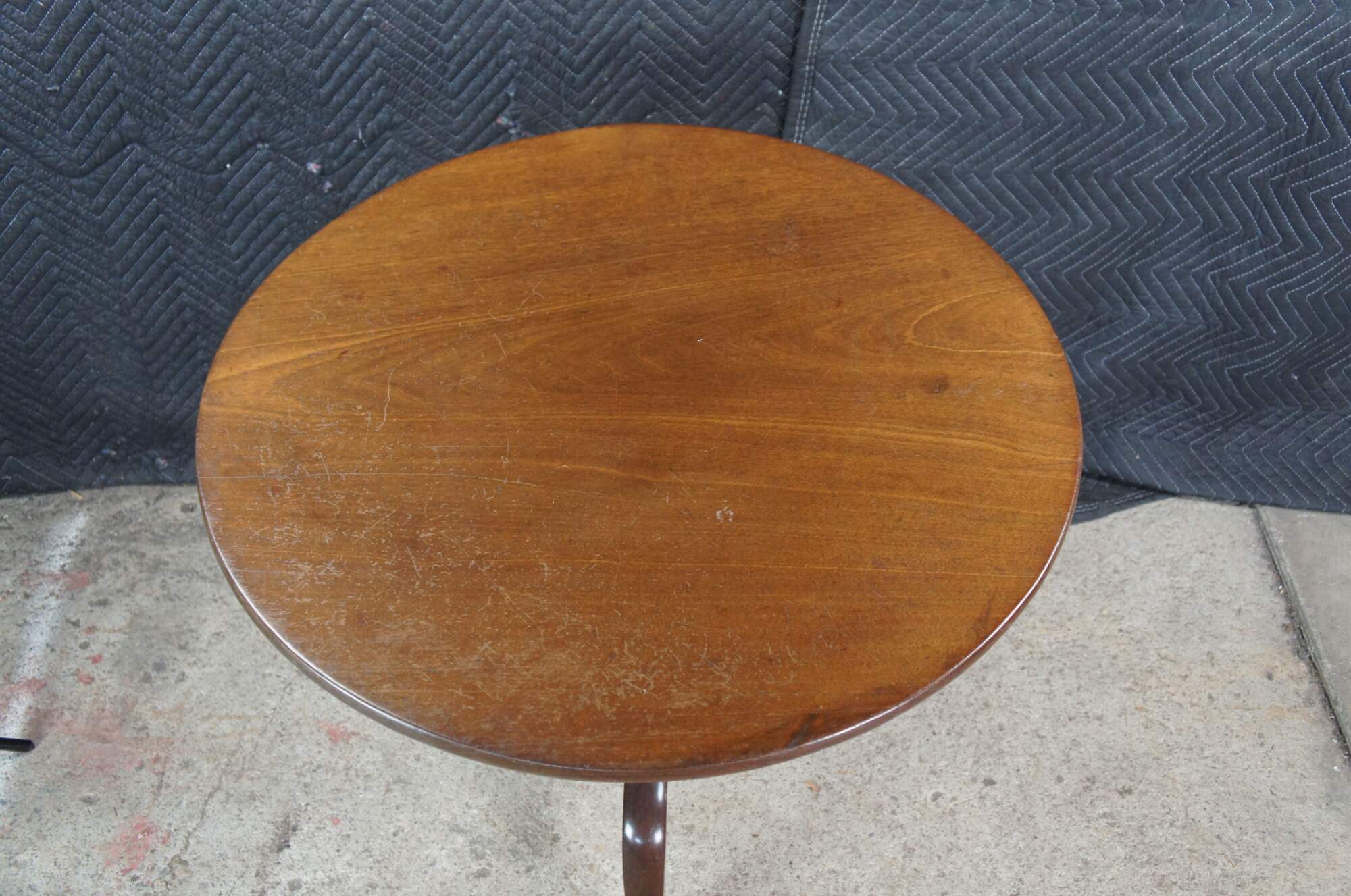 Good Antique Condition; General wear from use and age. Finish wear and marking to the table top. Past split between tripod legs. Structurally Solid