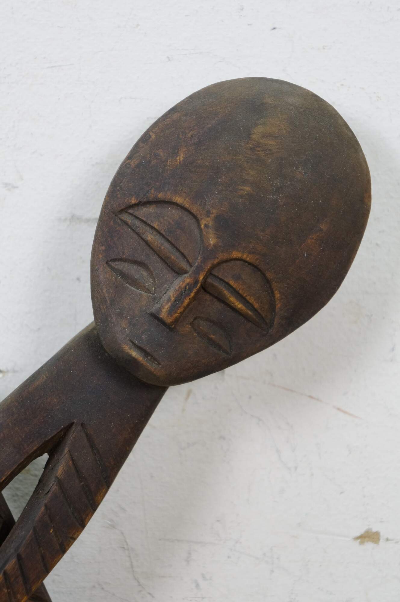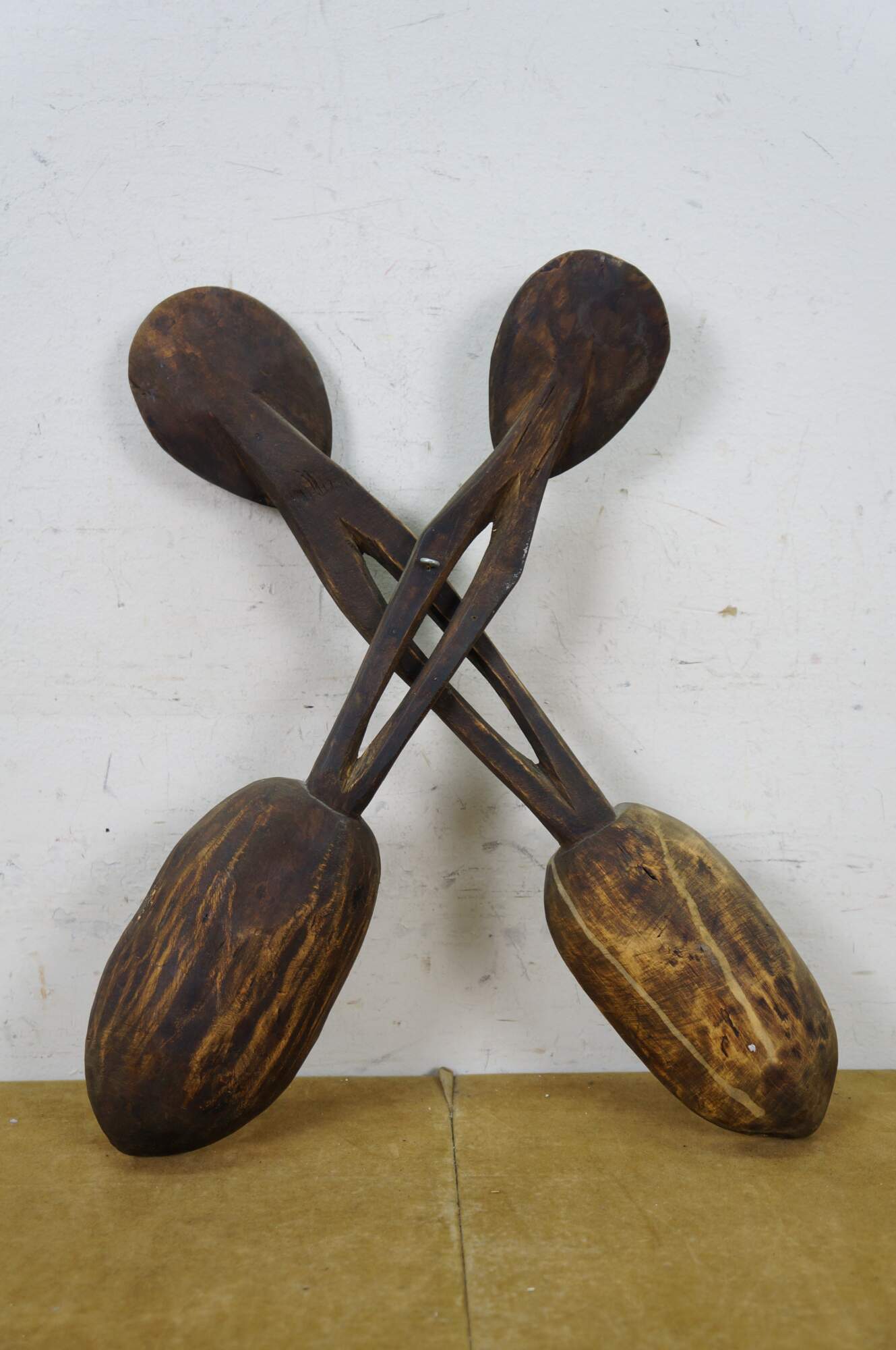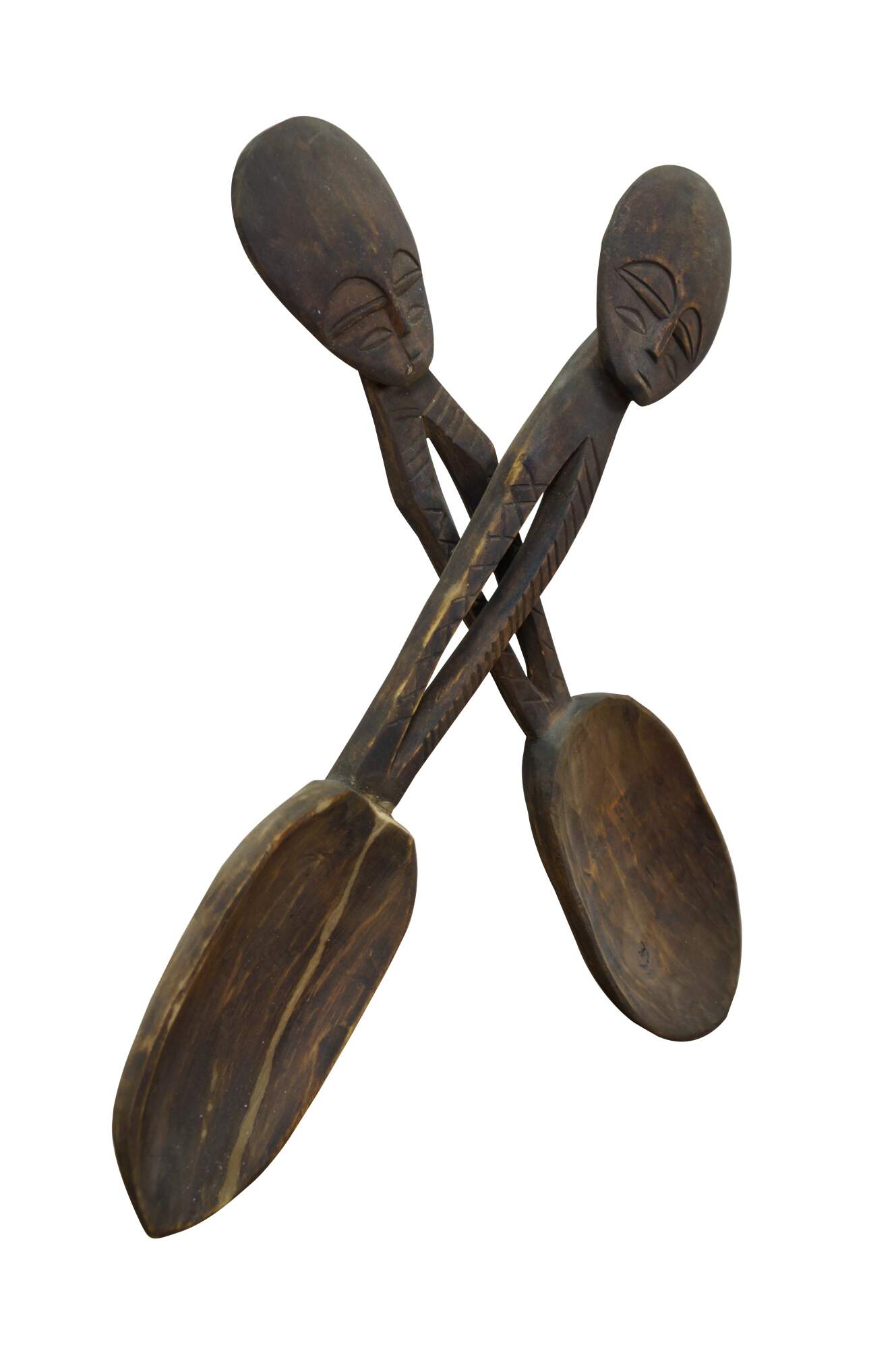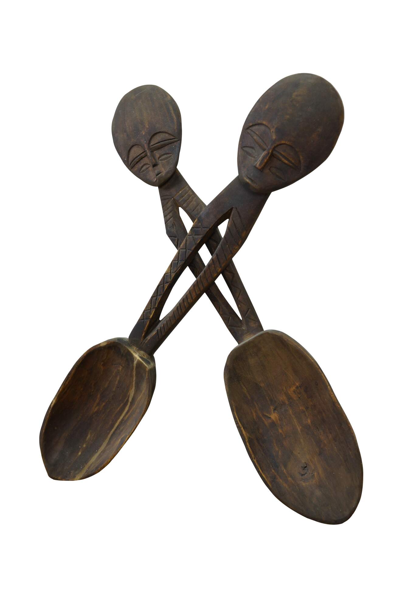 Vintage pair of wooden African serving spoons, hand carved with large bowls, pierced, textured handles and topped with ovular mask-like folk art style faces. Fastened together in an X shape, plua an eye hook for display on a wall.