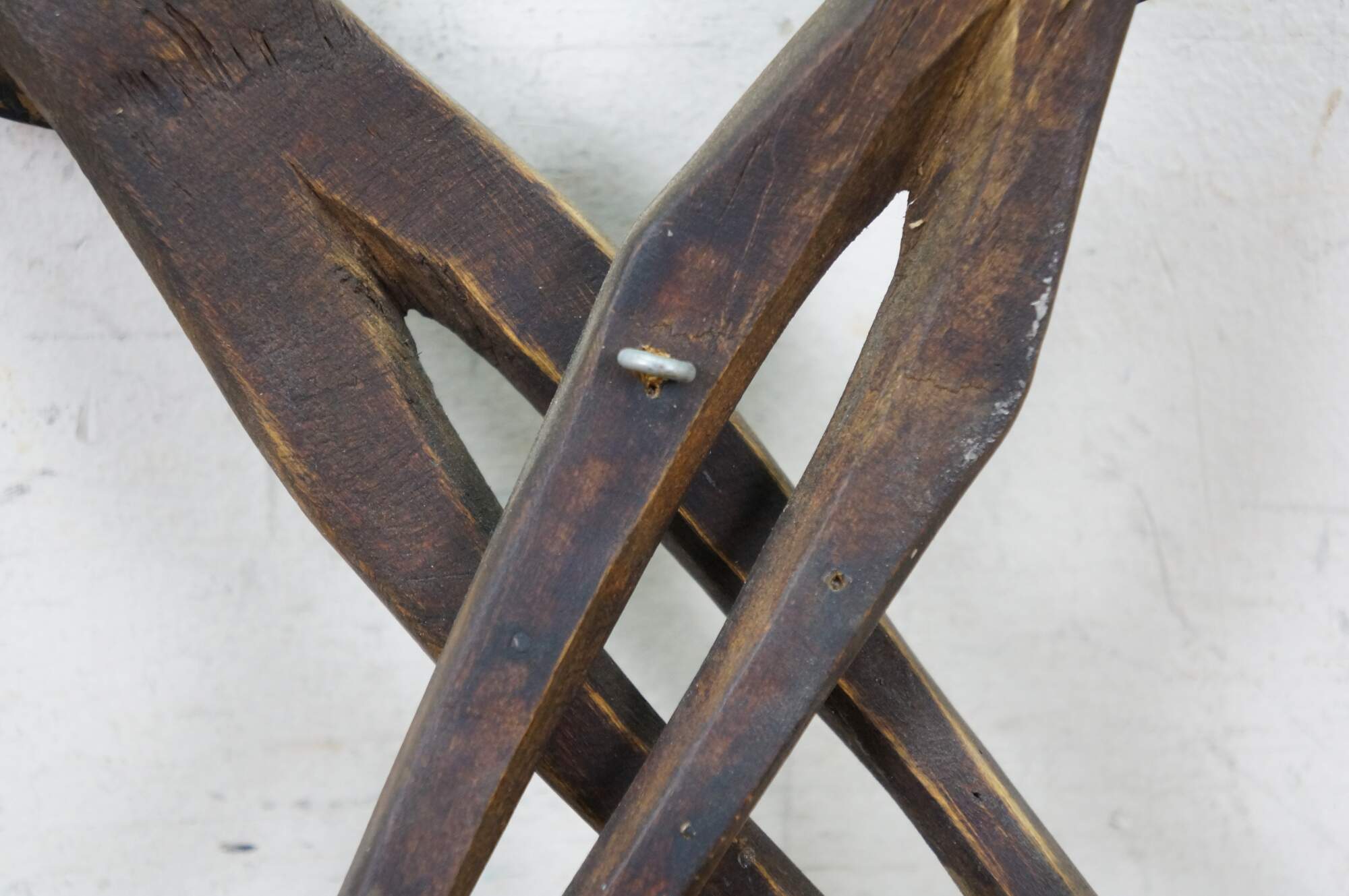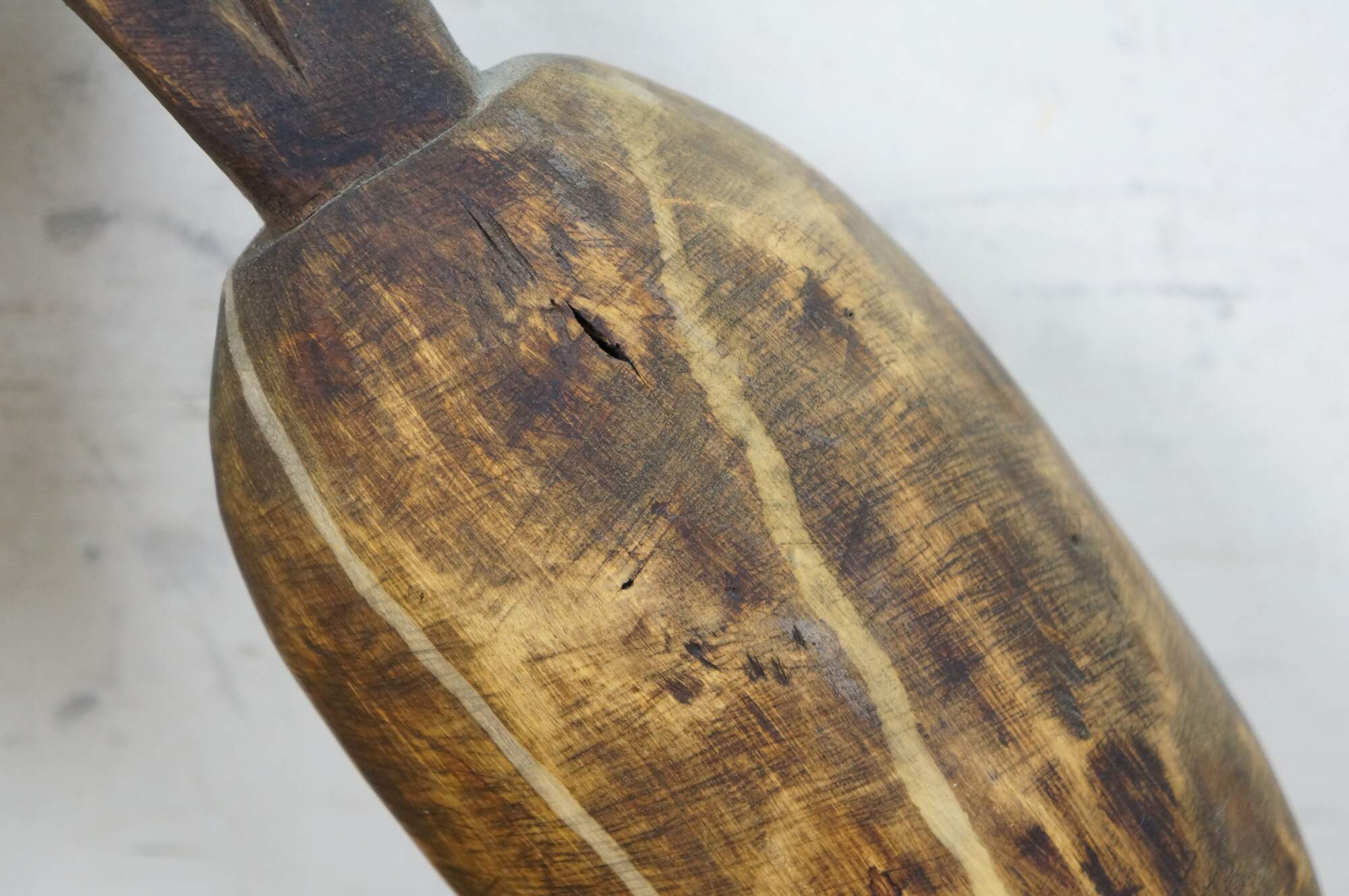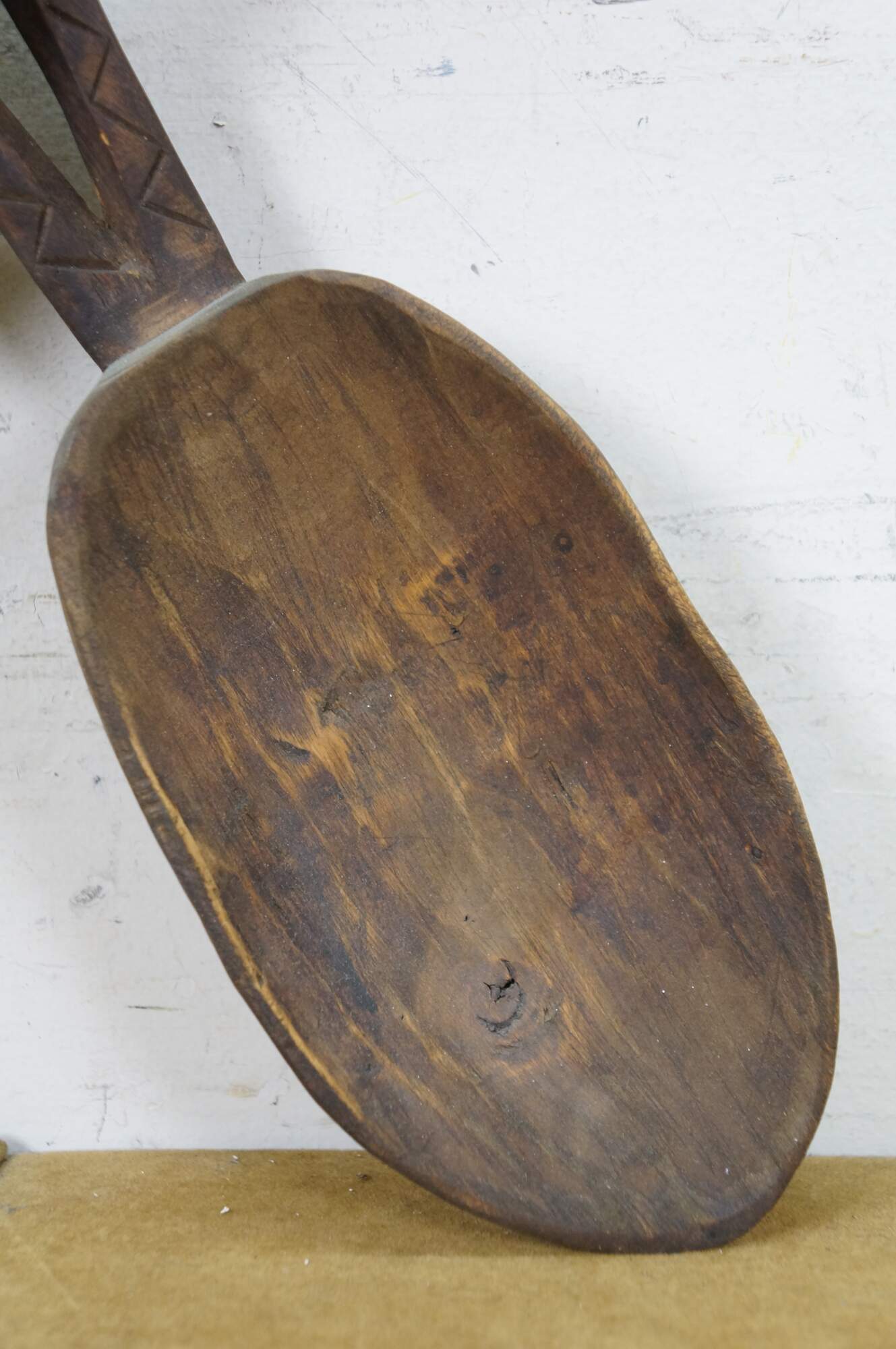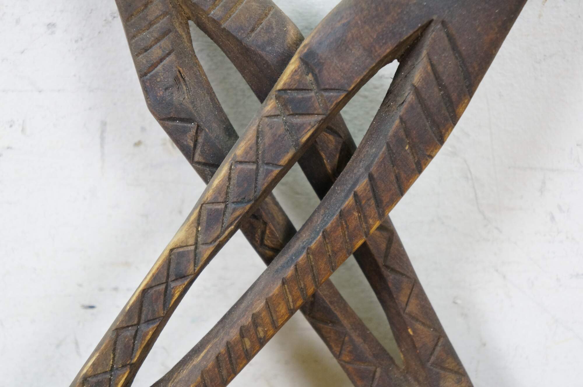 Vintage pair of wooden African serving spoons, hand carved with large bowls, pierced, textured handles and topped with ovular mask-like folk art style faces. Fastened together in an X shape, plua an eye hook for display on a wall.
