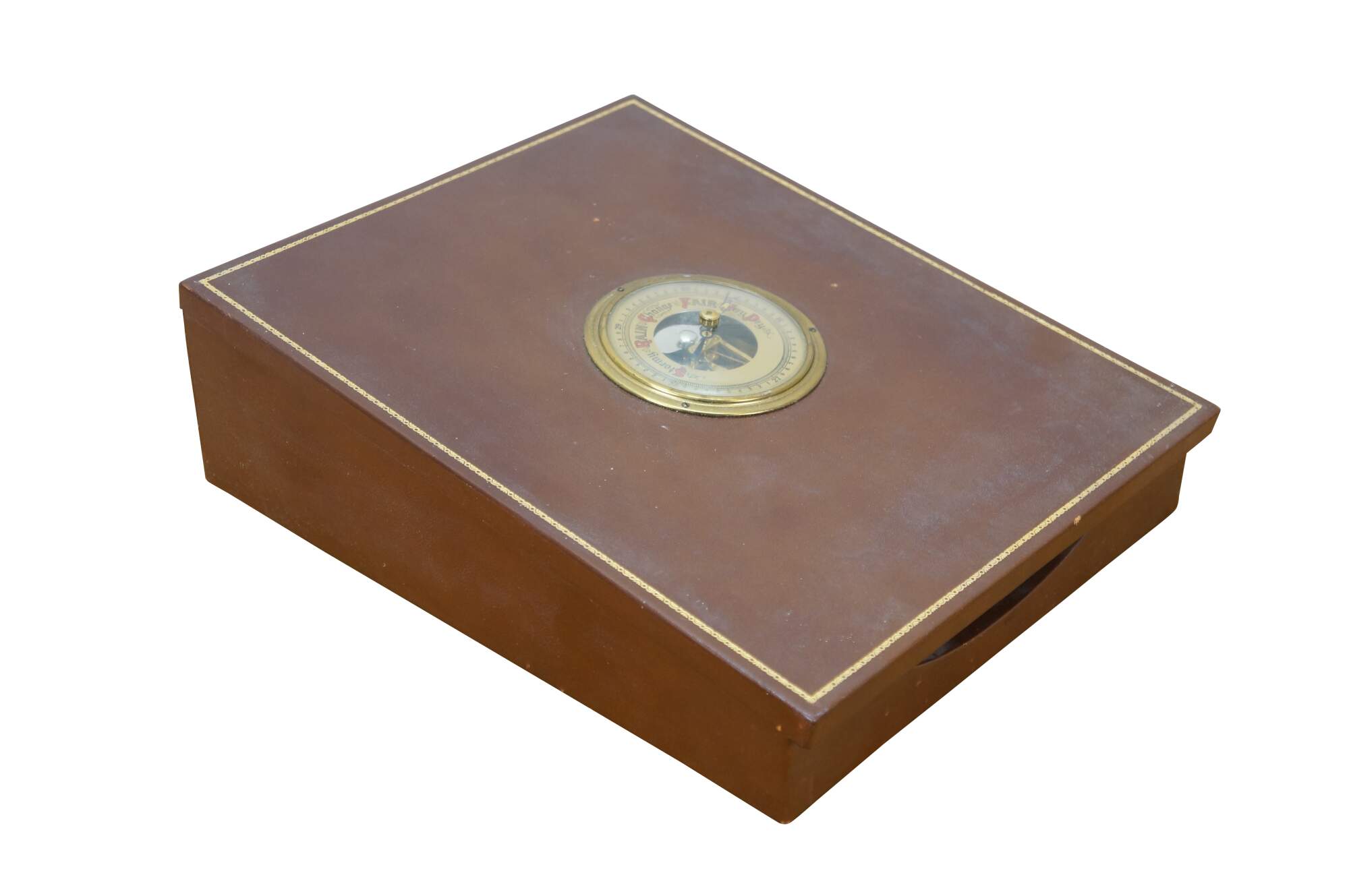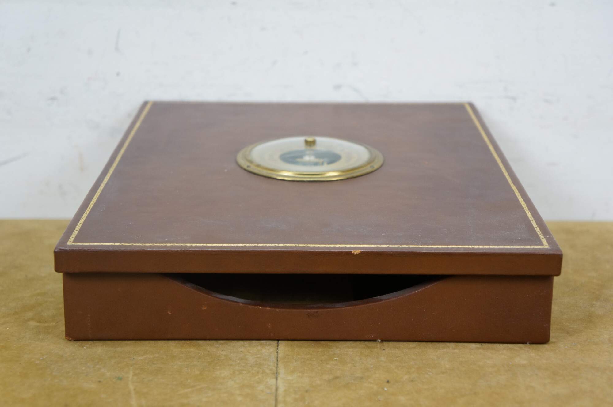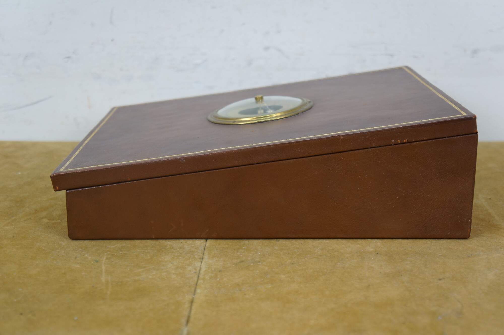 Mid century desktop / library document box by Moco of West Germany. Made of wood featuring a tooled leather case with slant top that showcases a barometer and opens for additional storage.