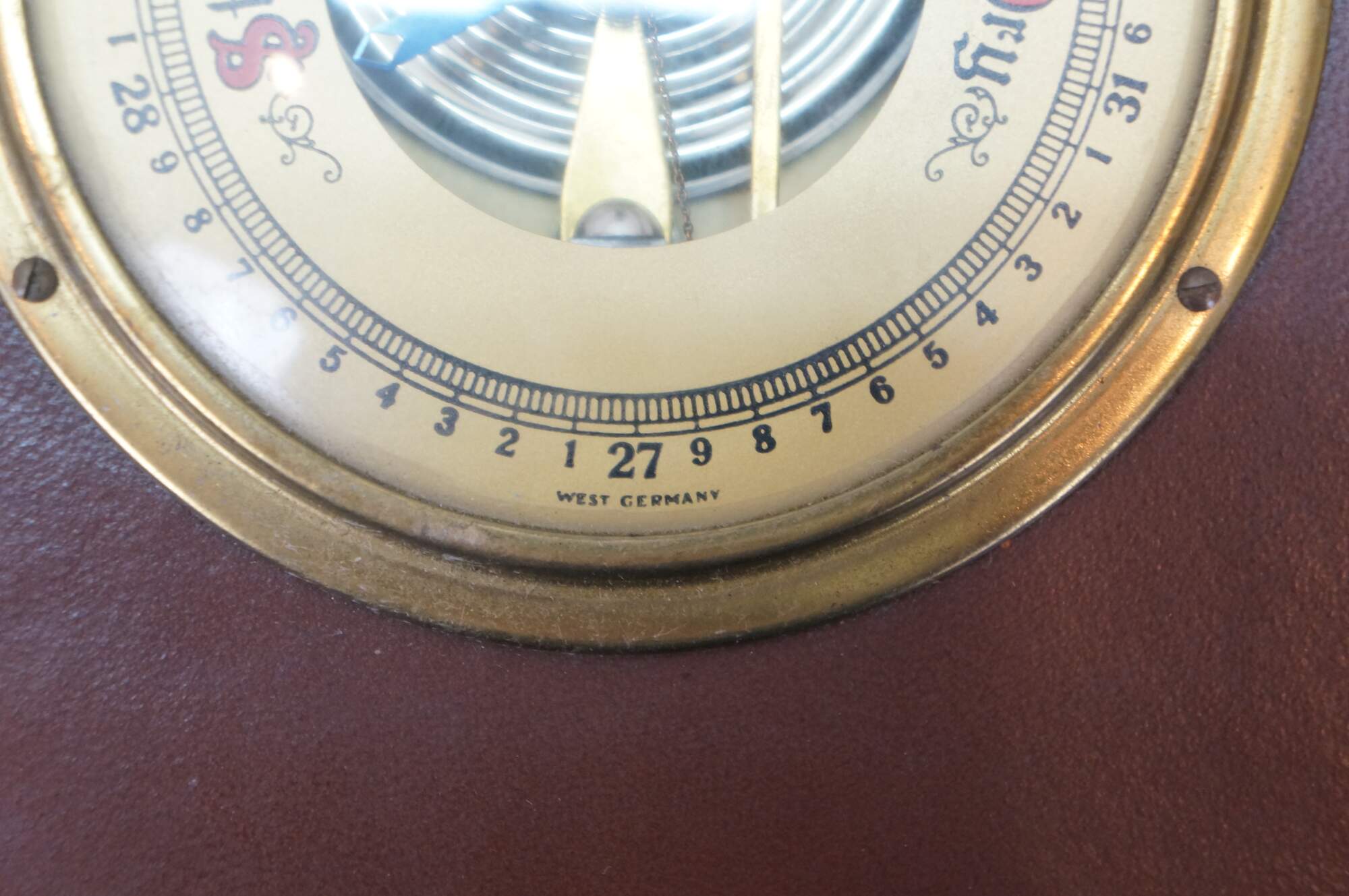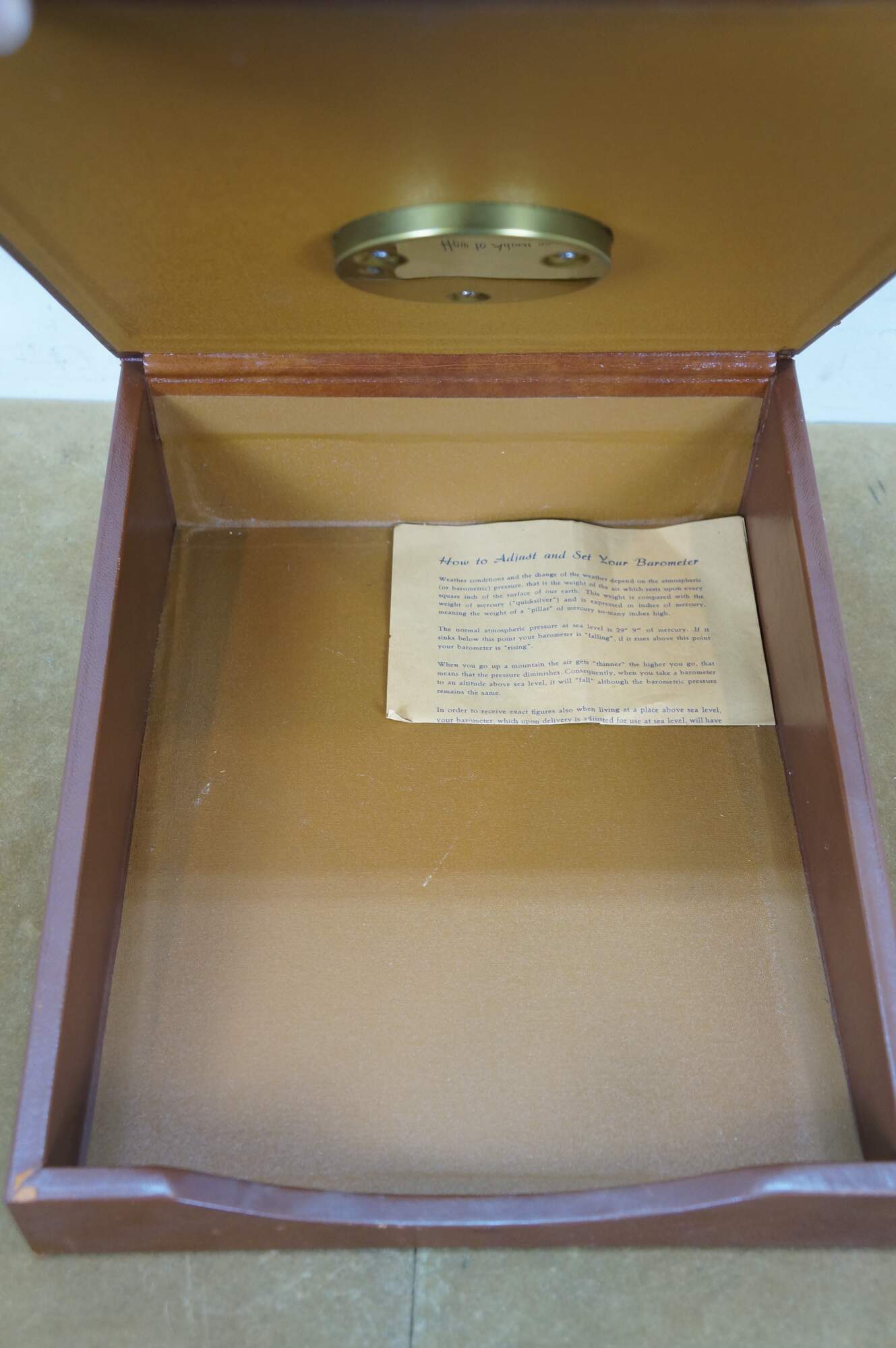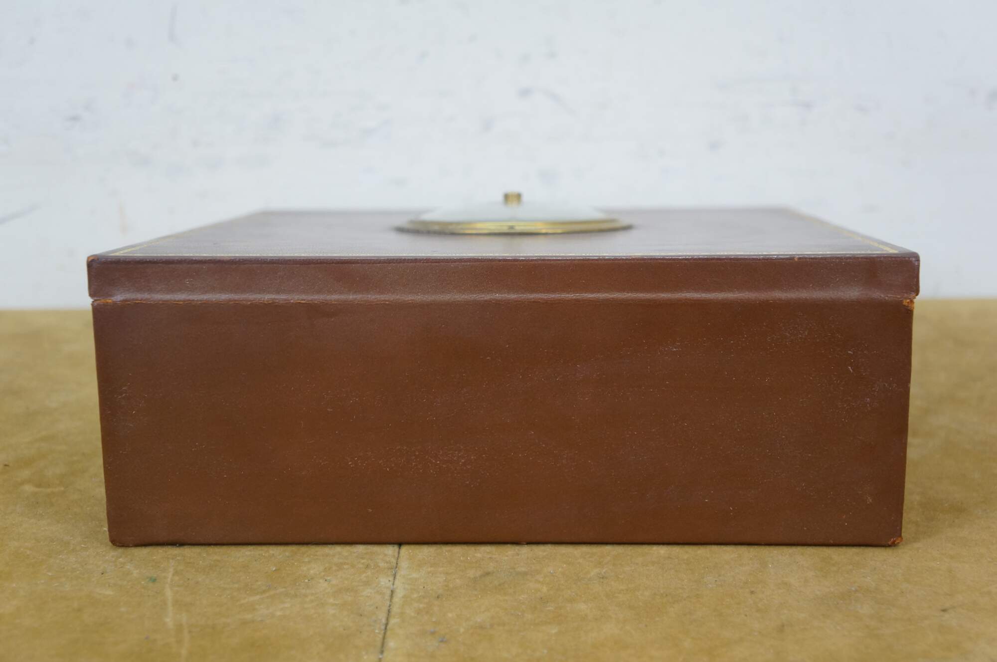 Mid century desktop / library document box by Moco of West Germany. Made of wood featuring a tooled leather case with slant top that showcases a barometer and opens for additional storage.