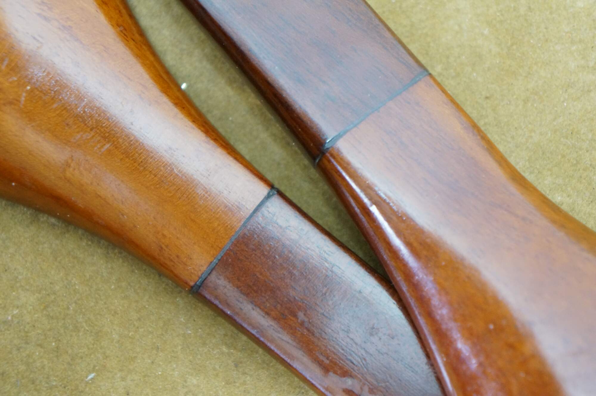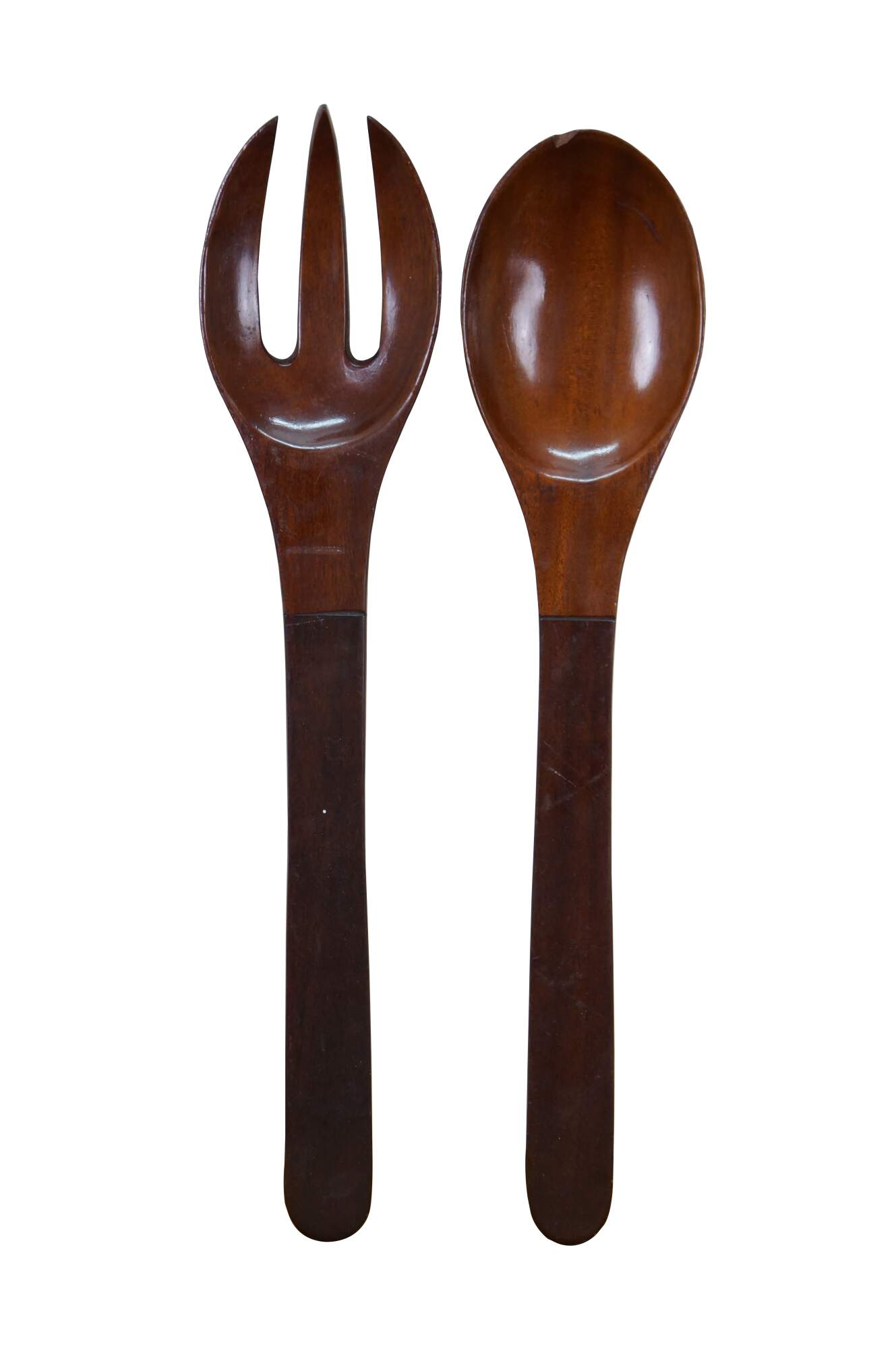 Vintage 20th century pair of glossy hardwood salad tossers - one spoon and one three prong spork.