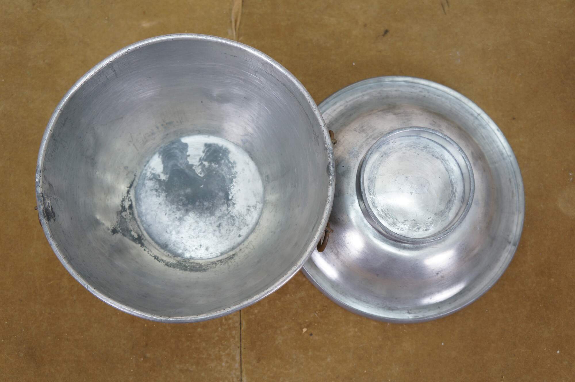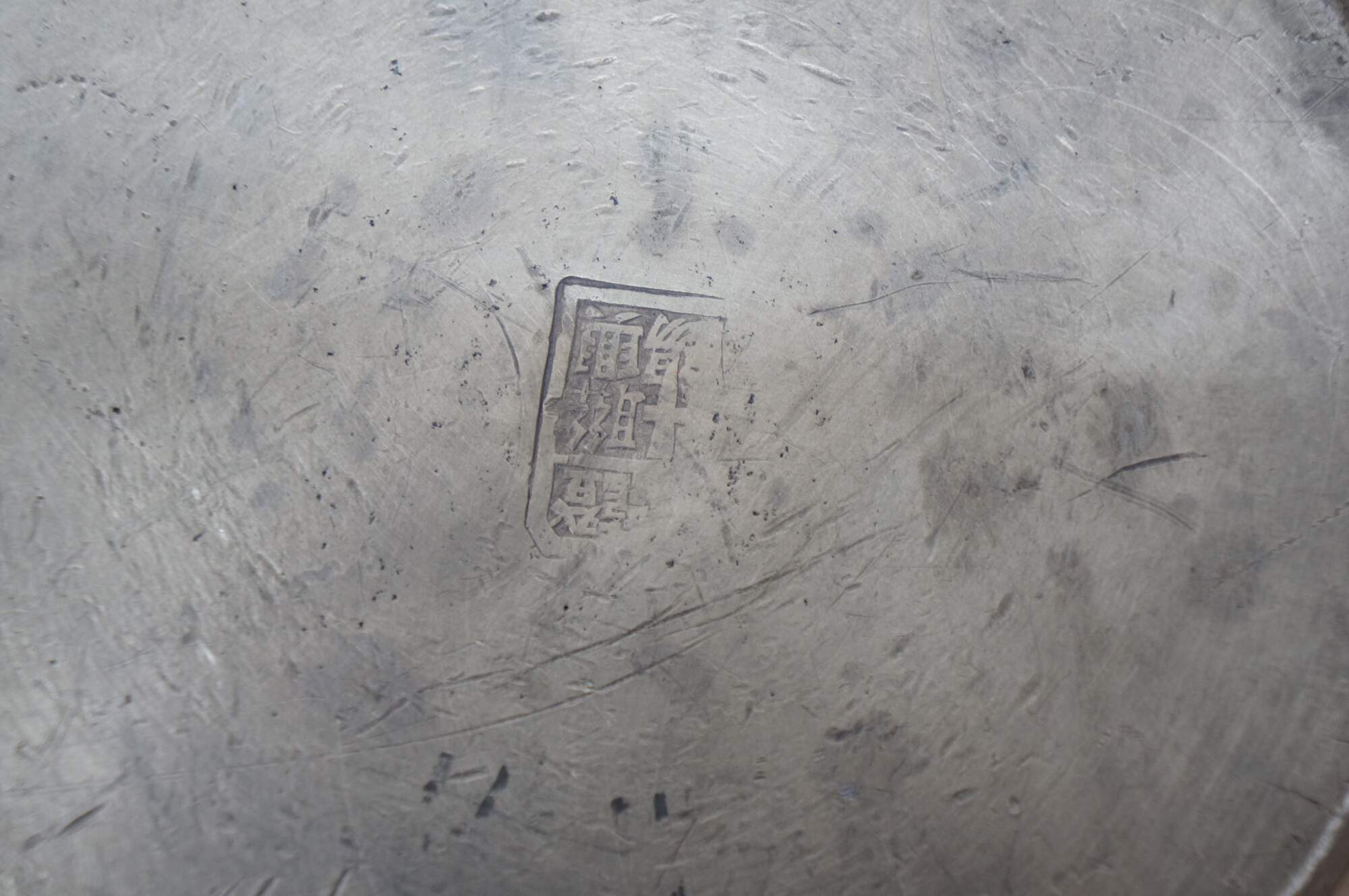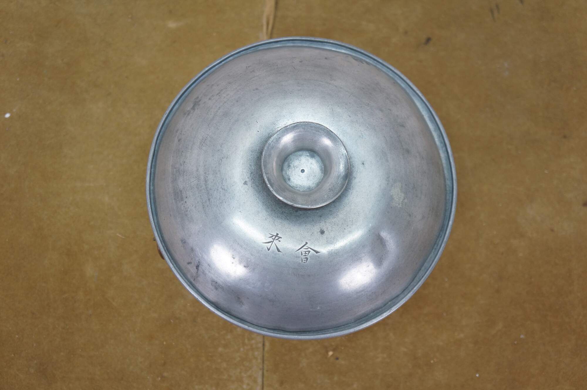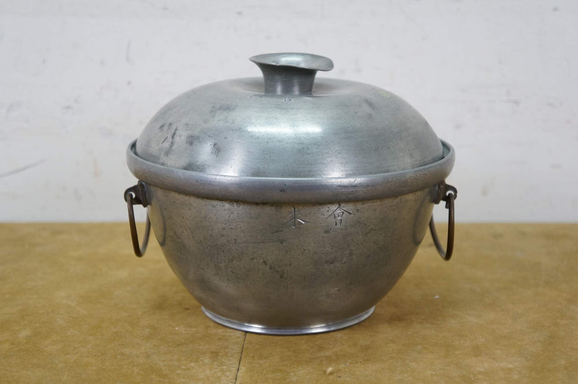 Vintage Chinese hot pot / food warmer consisting of three pieces - Round tapered base for filling with hot coals with two copper bail handles, footed plate / low bowl that sits on the upper rim of the base, and lid.