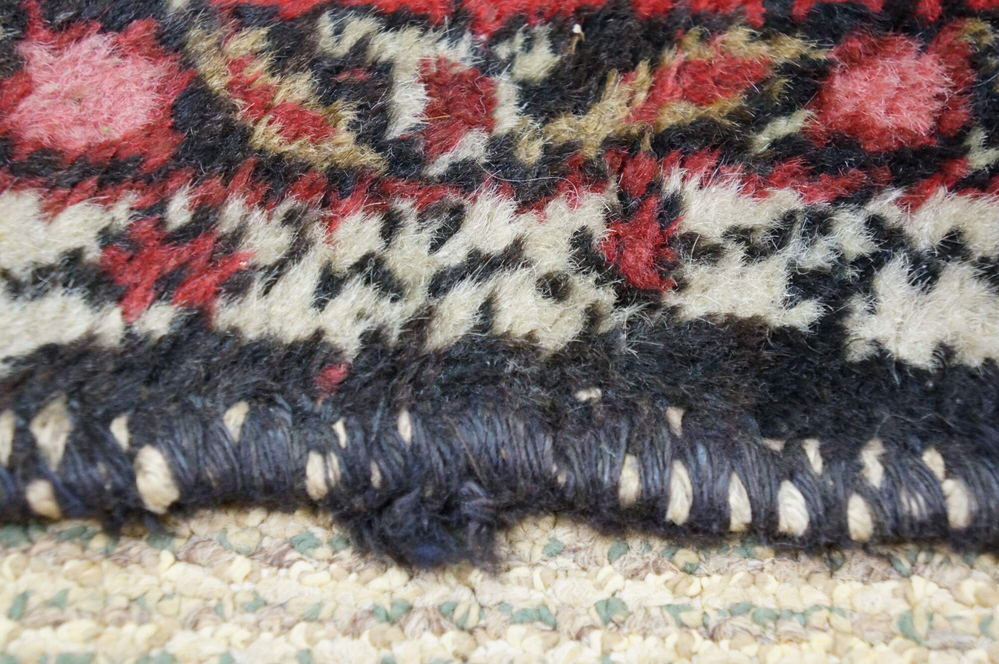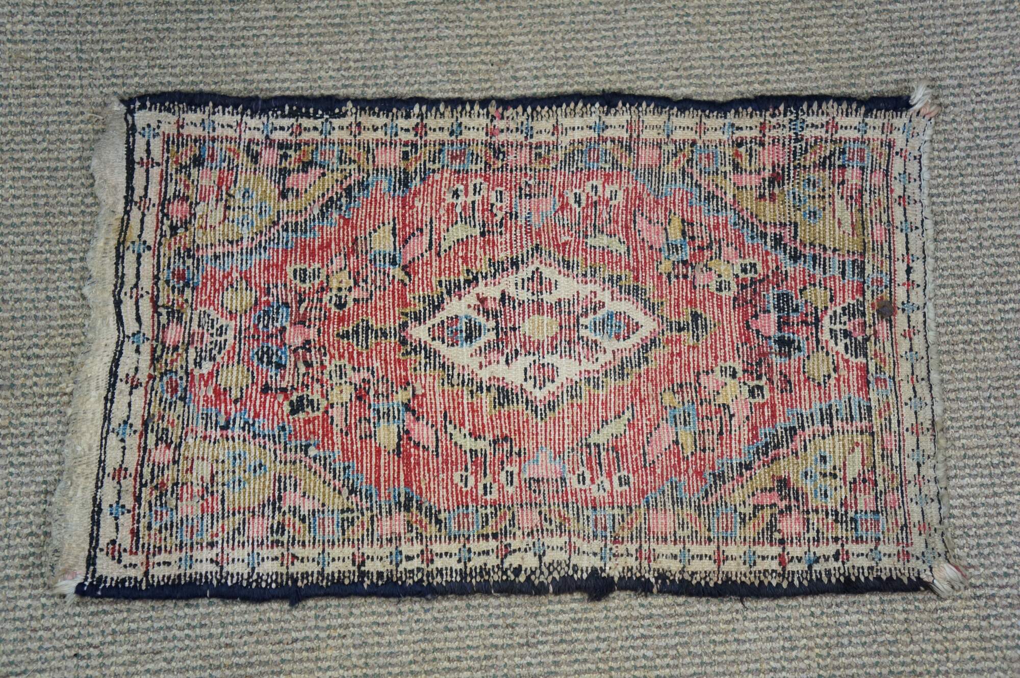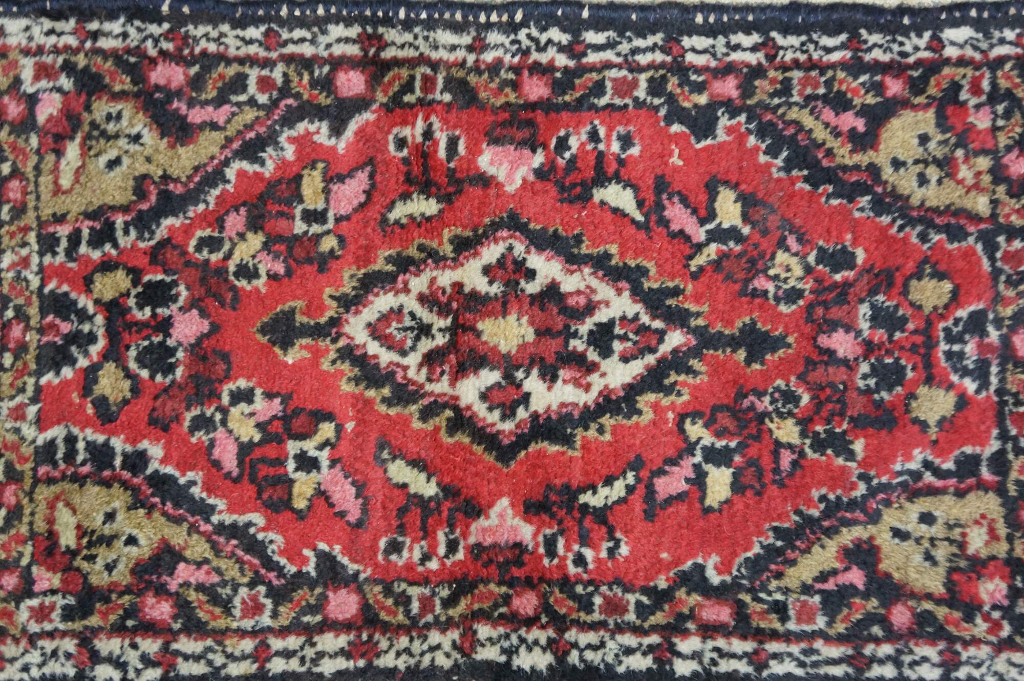 Vintage hand knotted small wool rug / mat featuring a floral and diamond design in red, pink.beige and navy.