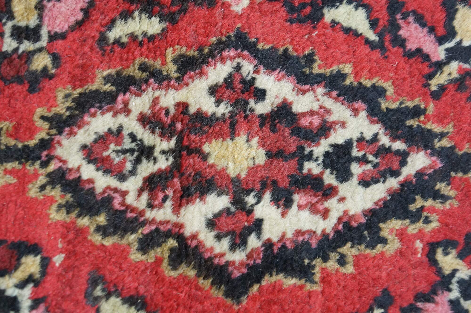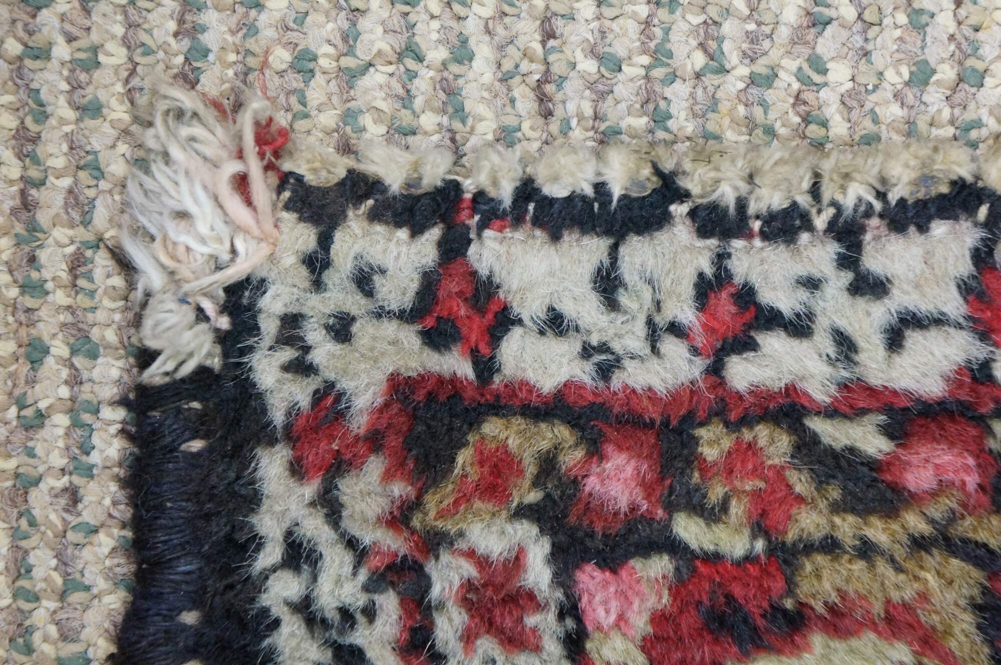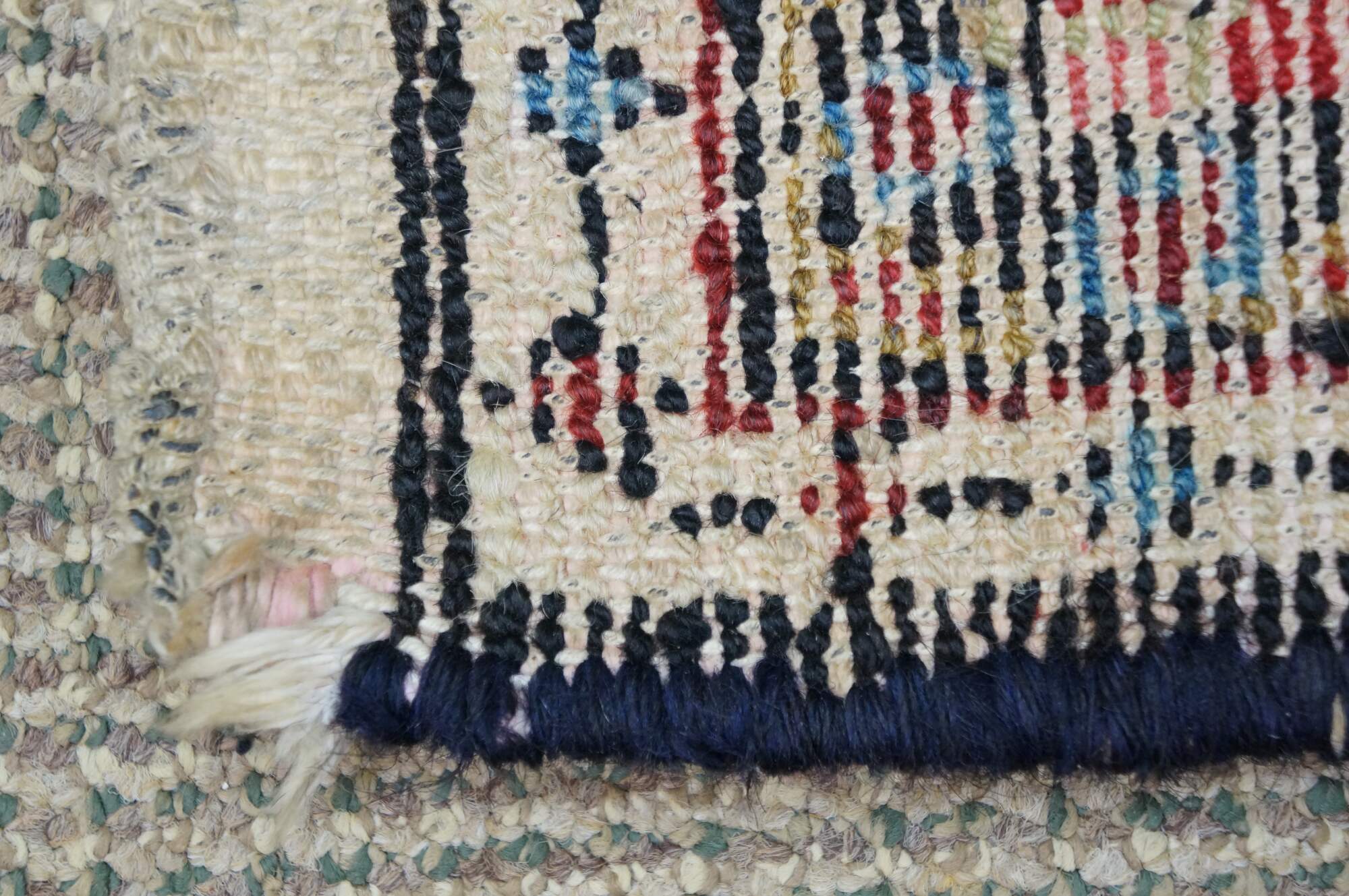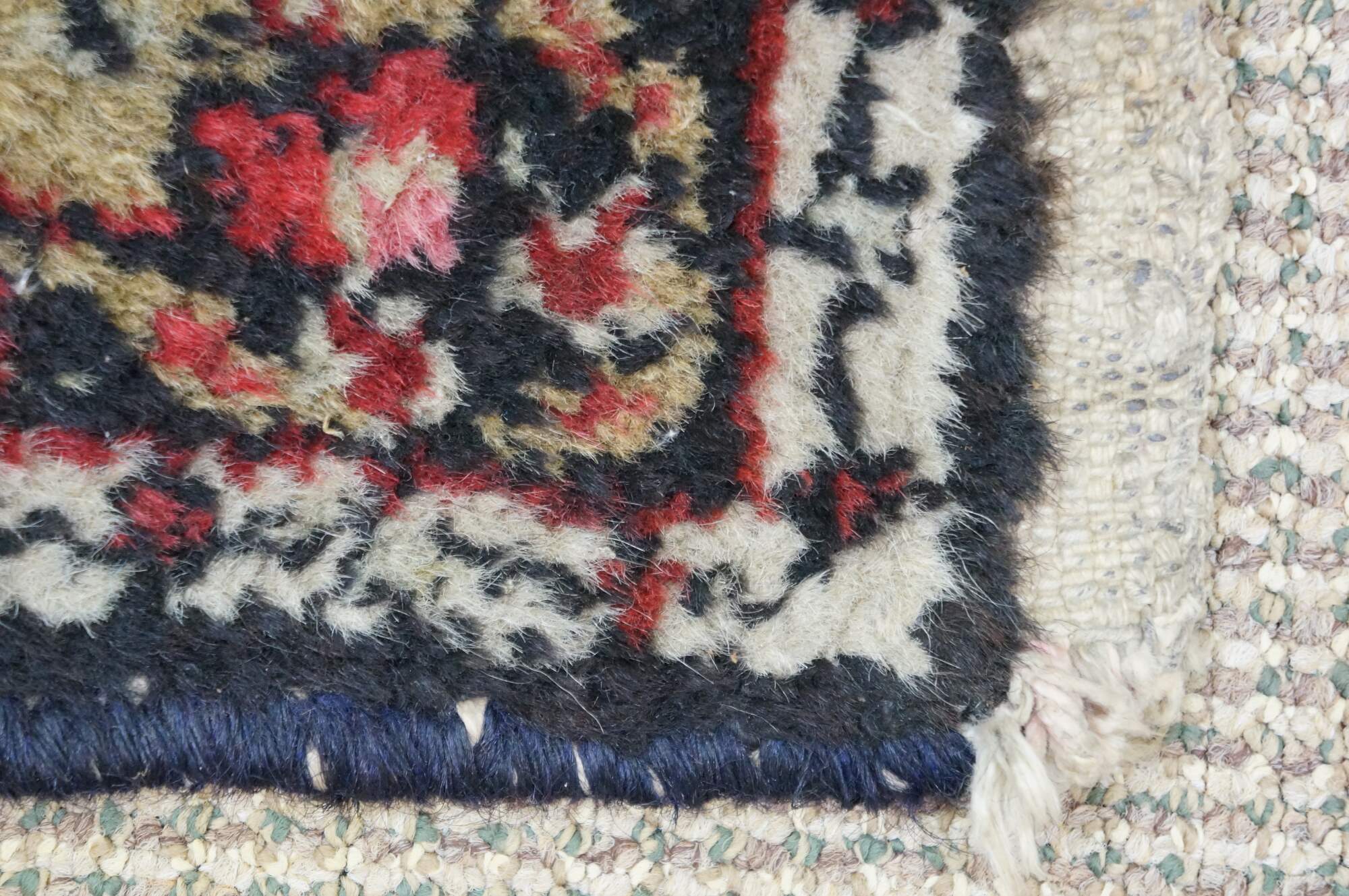 Vintage hand knotted small wool rug / mat featuring a floral and diamond design in red, pink.beige and navy.