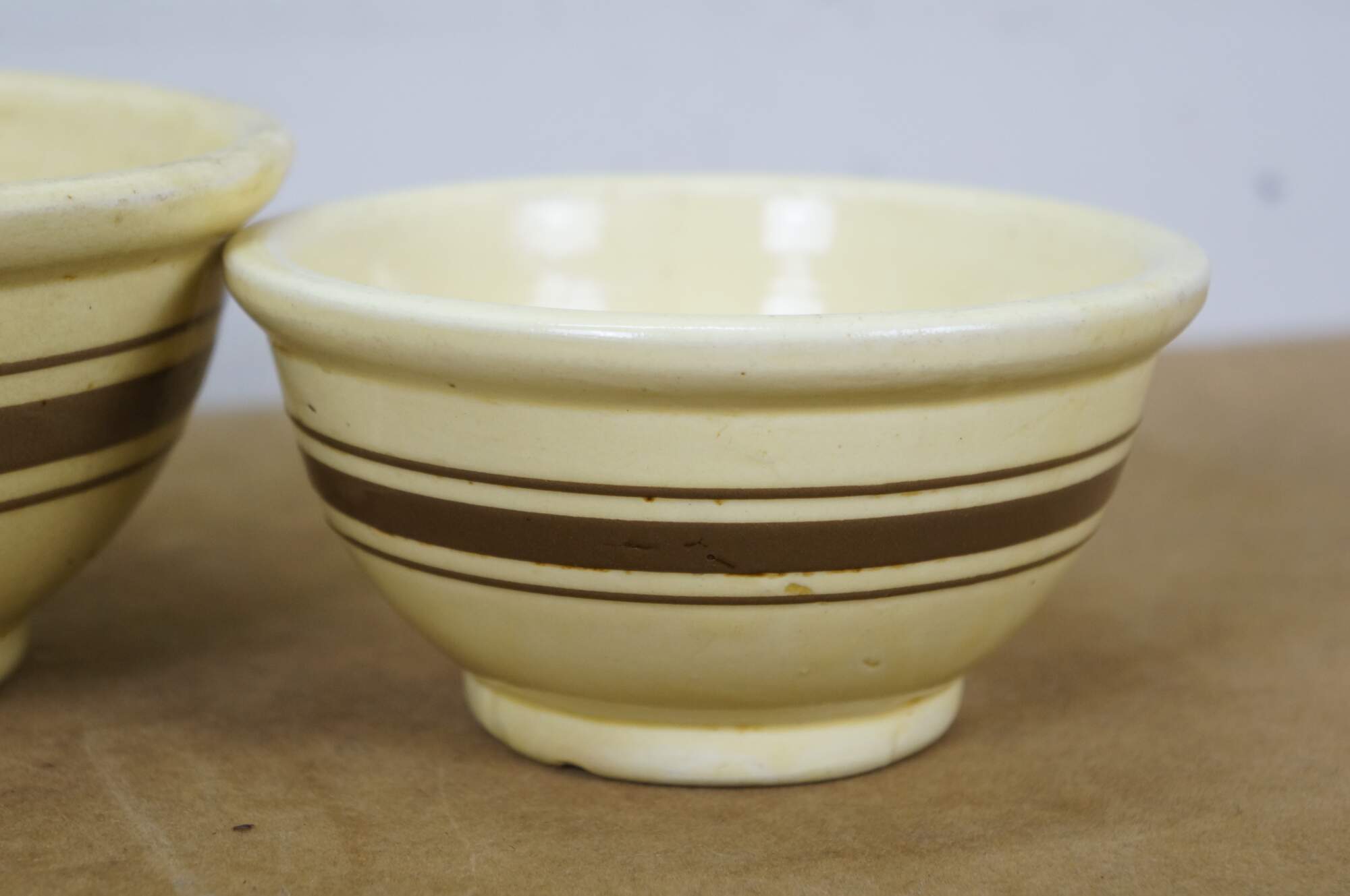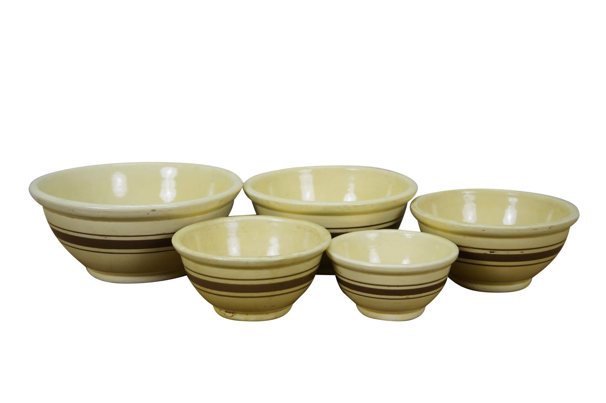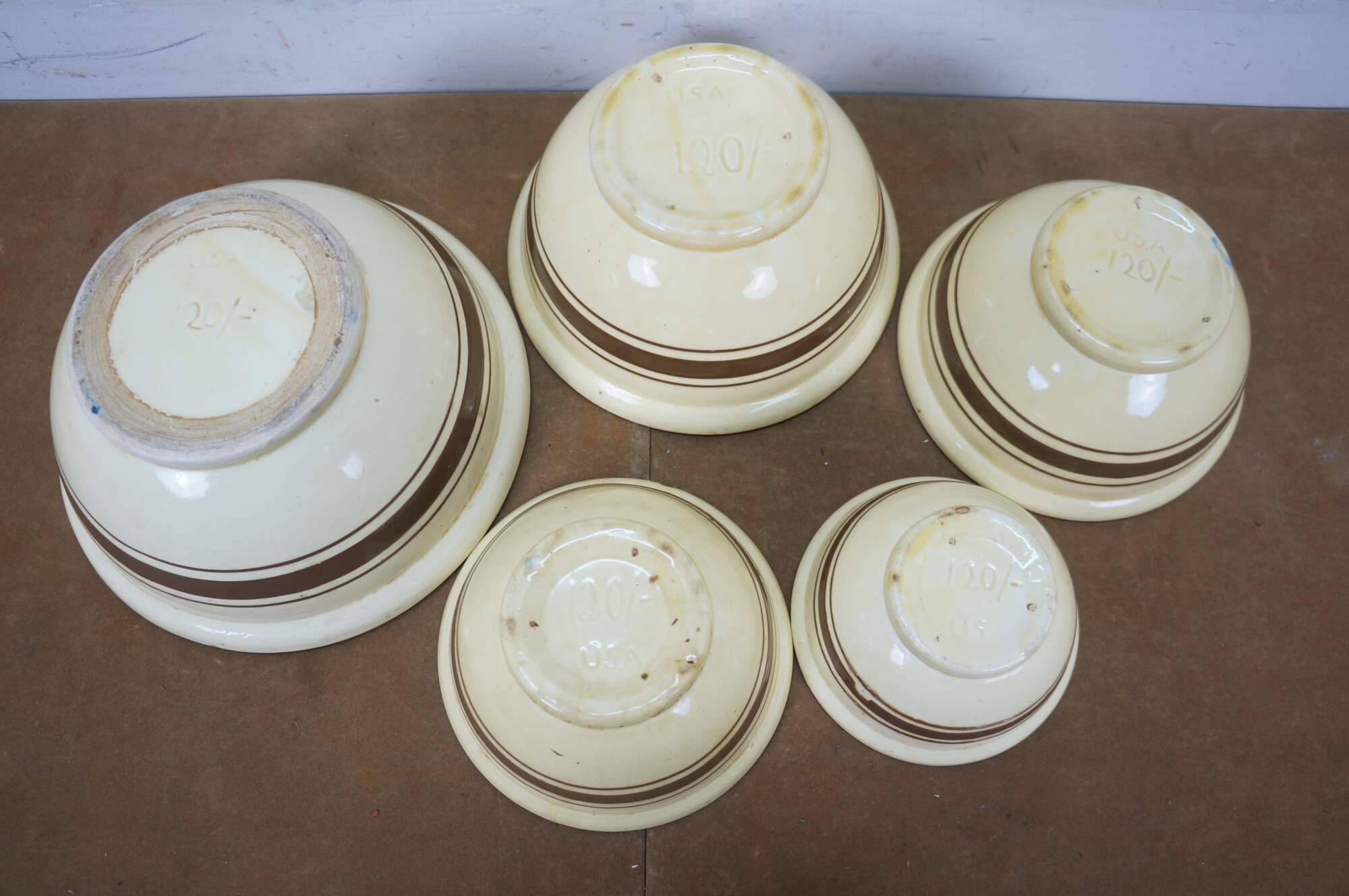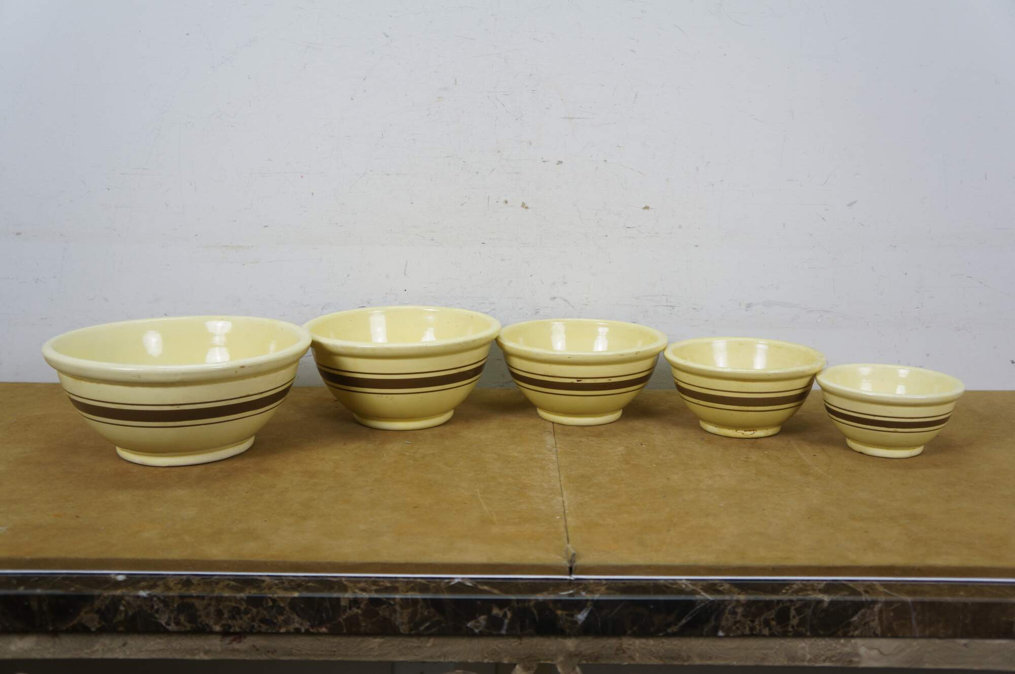 Set of five circa early 20th century light yellow stoneware pottery nesting mixing bowls with tapered base, pronounced rim and trio of brown stripes. Marked USA 120/- on bases.