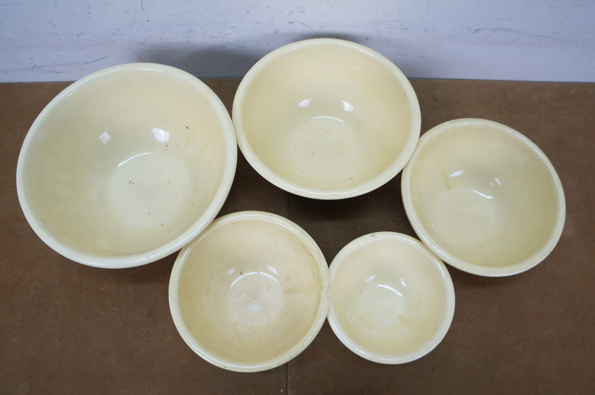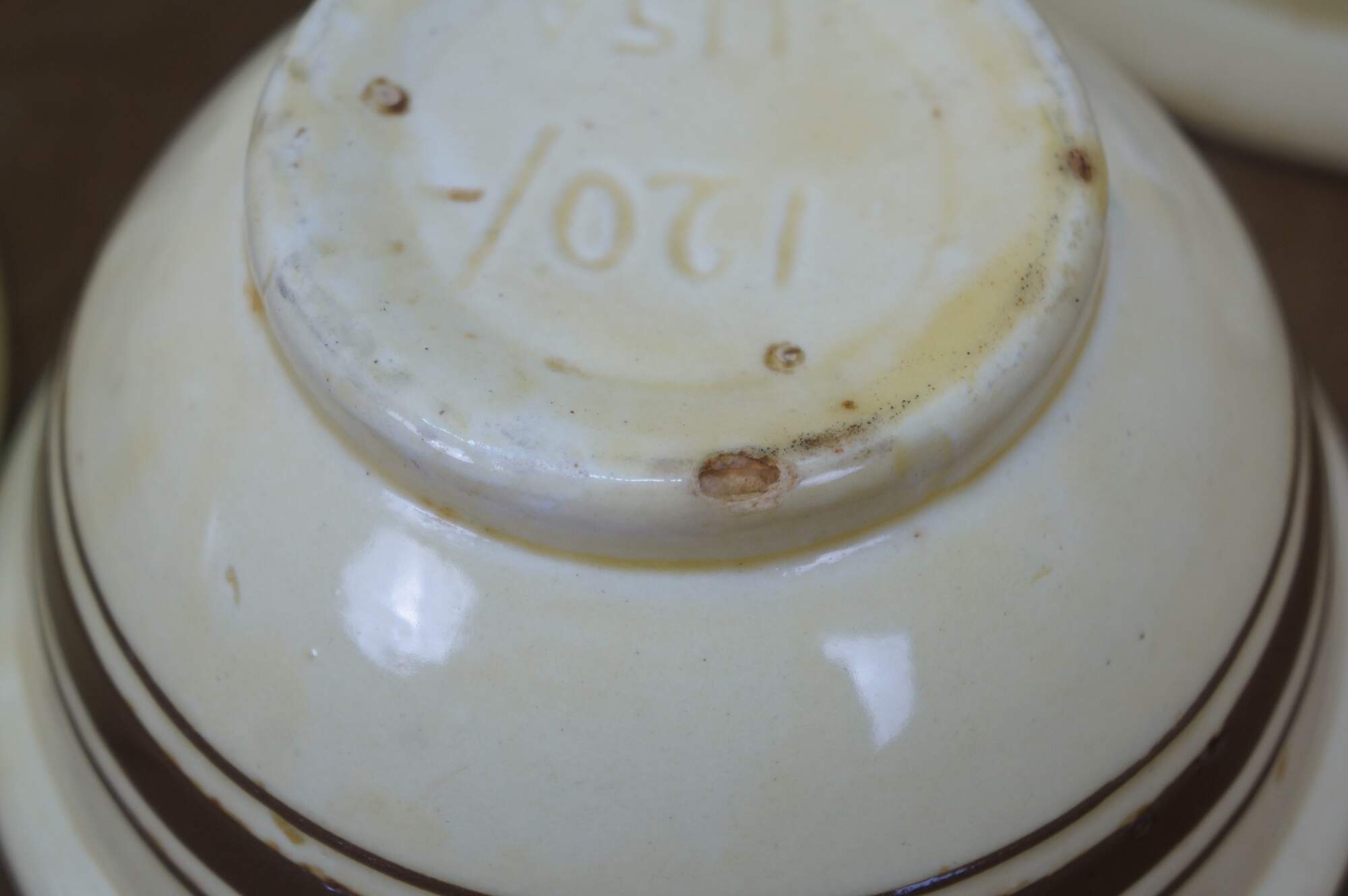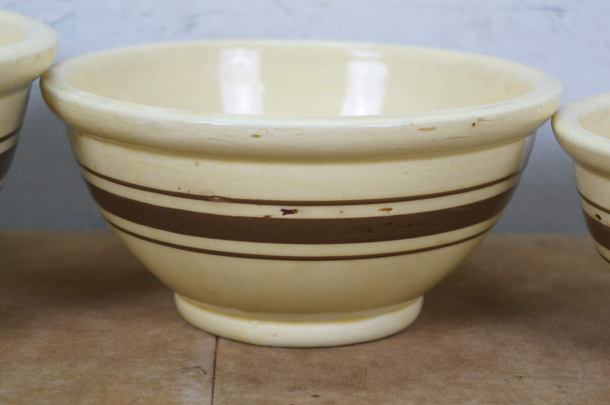 Set of five circa early 20th century light yellow stoneware pottery nesting mixing bowls with tapered base, pronounced rim and trio of brown stripes. Marked USA 120/- on bases.