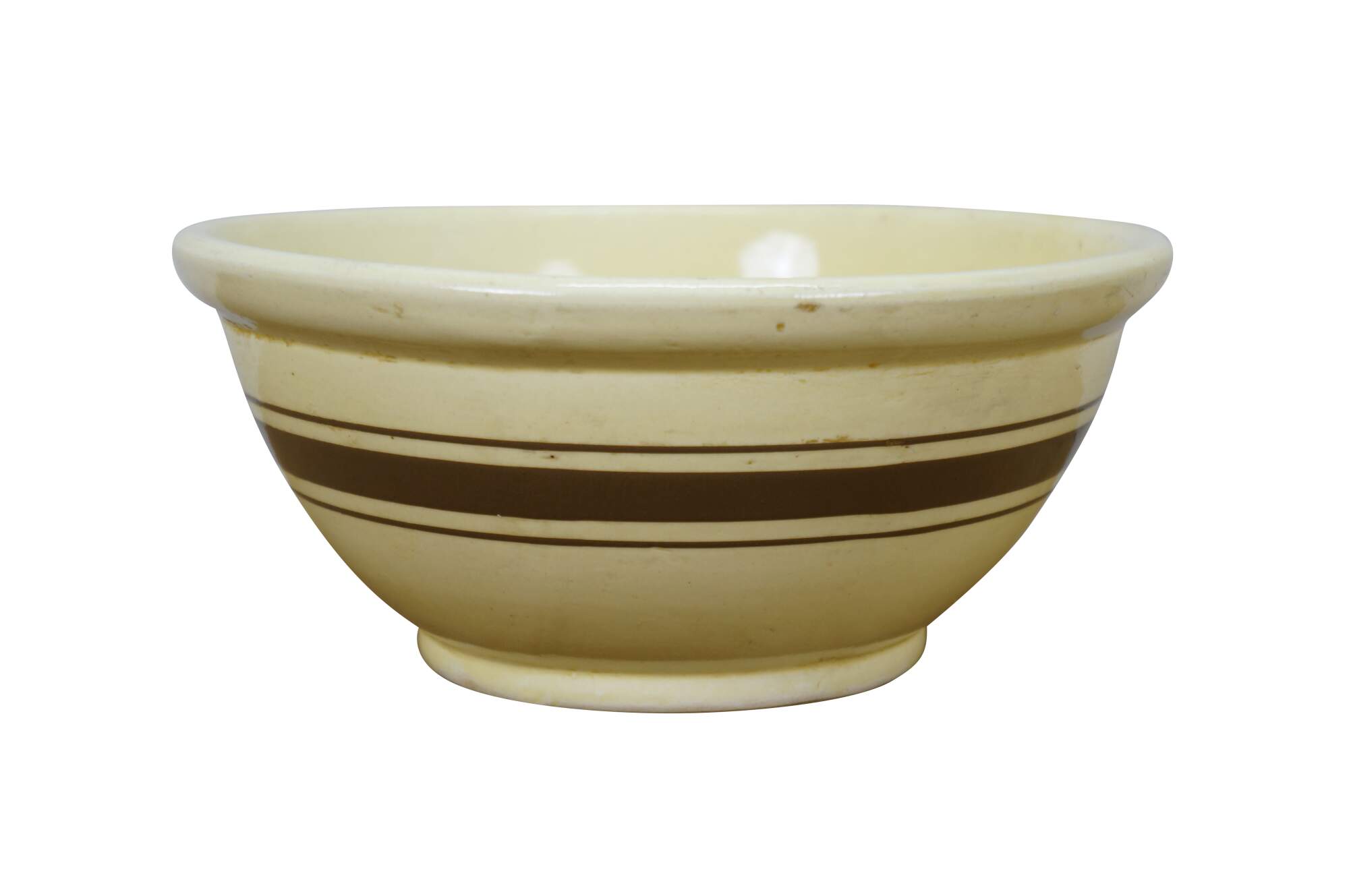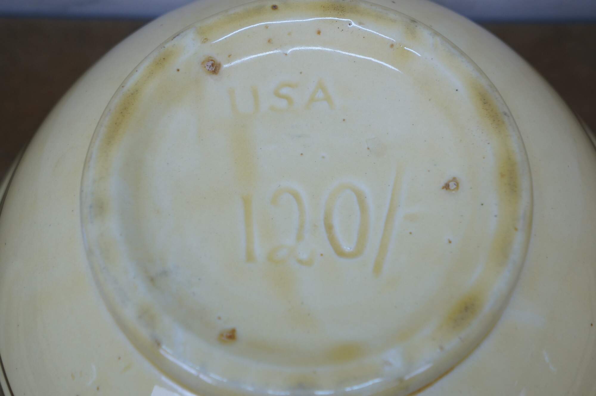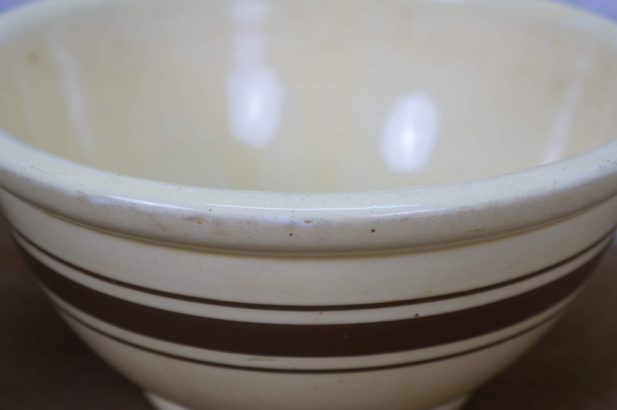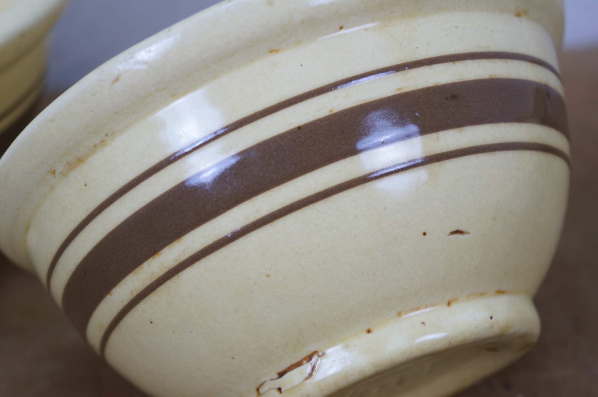 Set of five circa early 20th century light yellow stoneware pottery nesting mixing bowls with tapered base, pronounced rim and trio of brown stripes. Marked USA 120/- on bases.