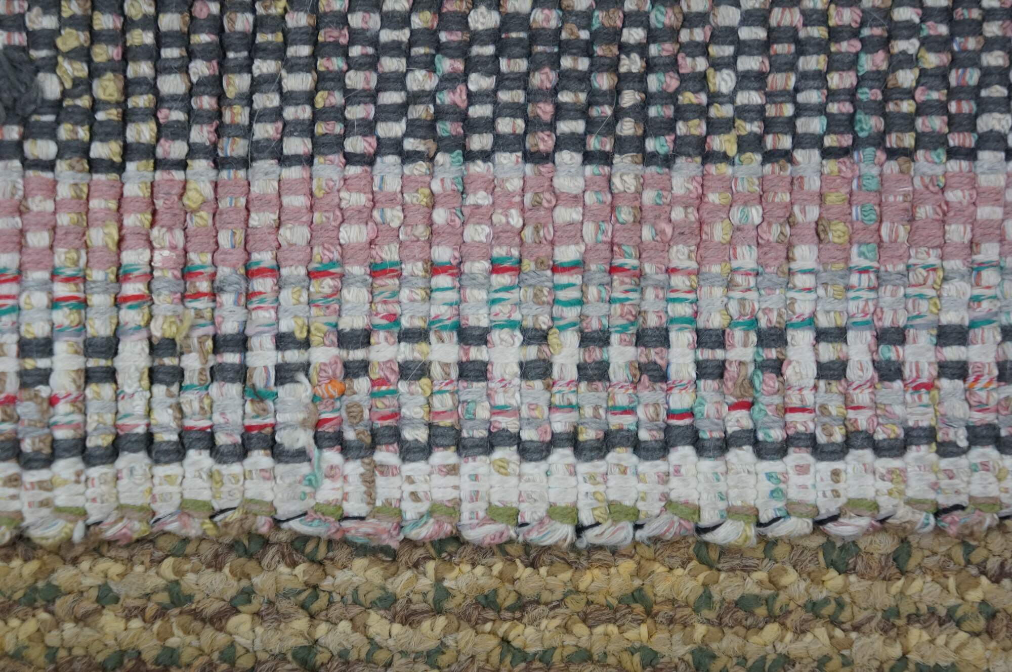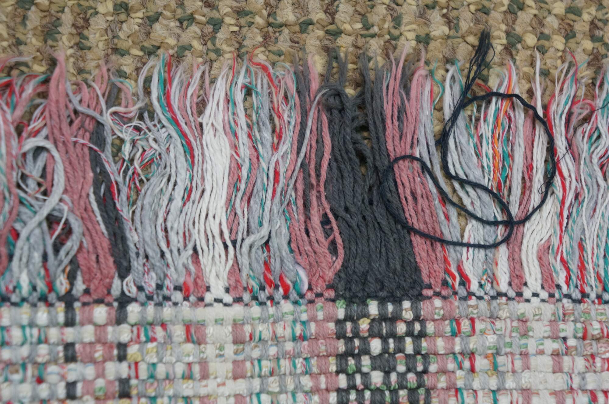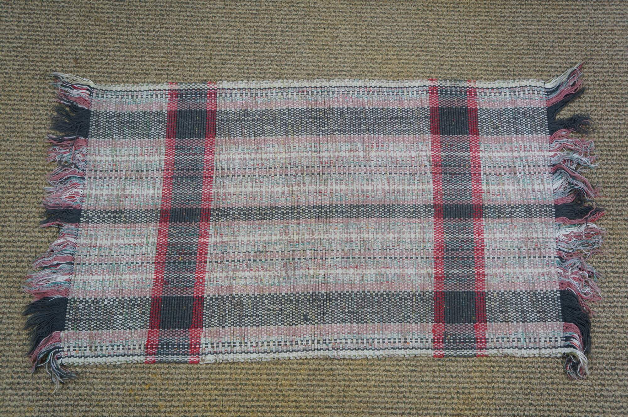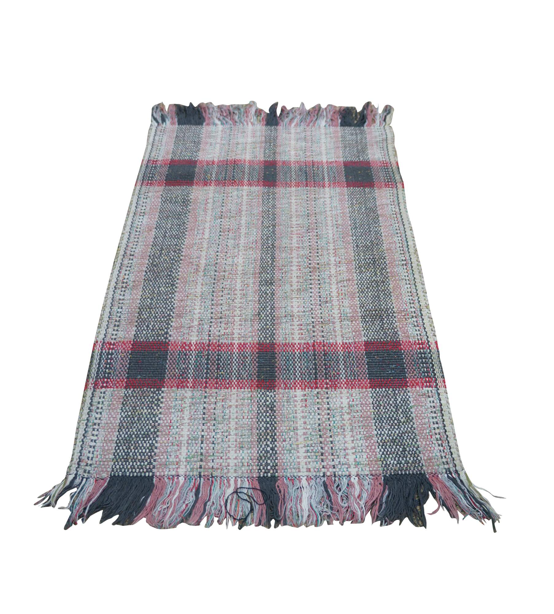 Vintage 20th century hand made folk art style cotton rag rug, featuring a red, gray, and white plaid pattern and fringe.