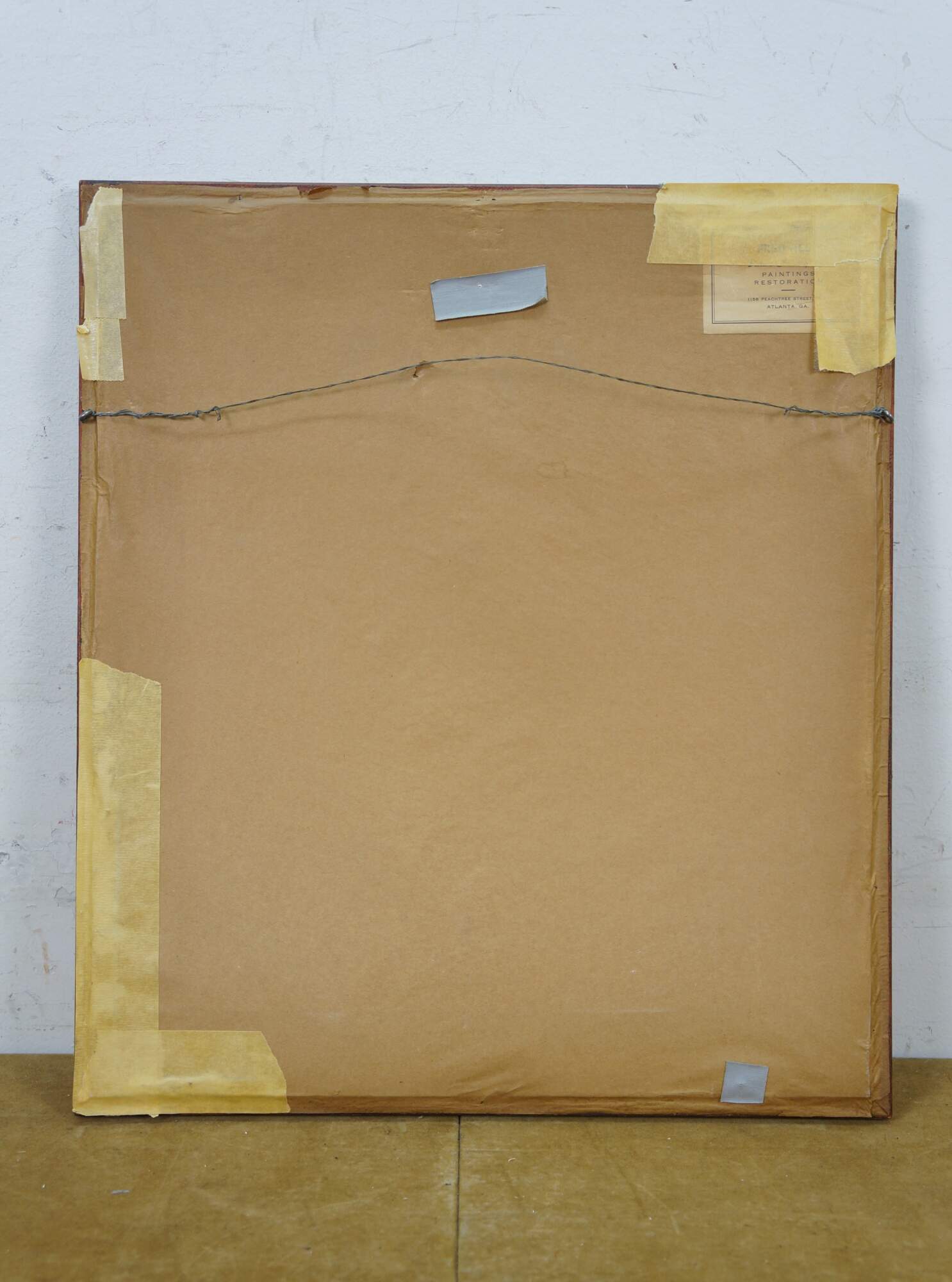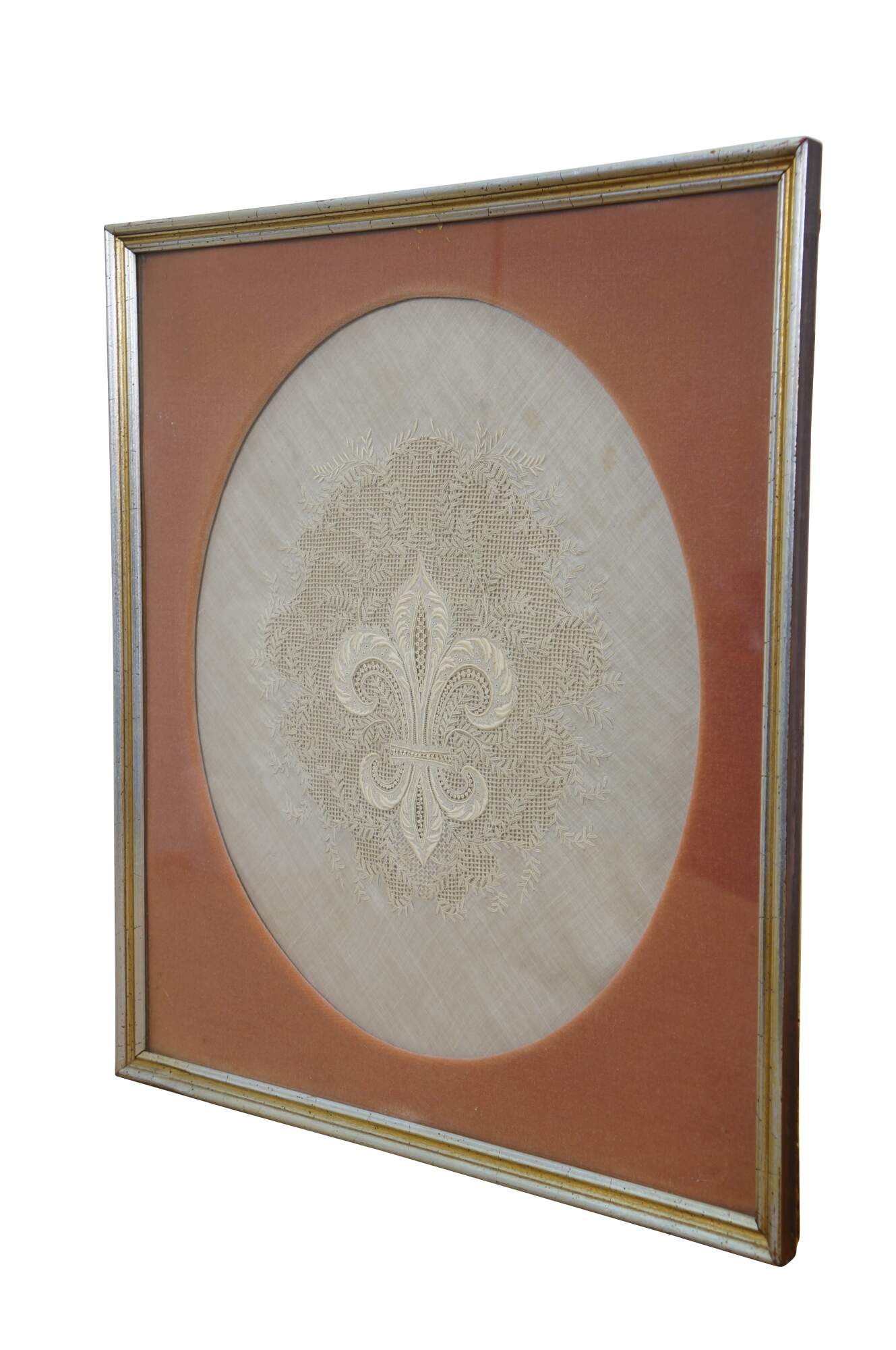 Antique framed piece of intricate lace and embroidery on white linen depicting a French fleur de lis surroundded swirling foliate leaves. Silver and gold beveled wood frame; burnt orange velvet mat.