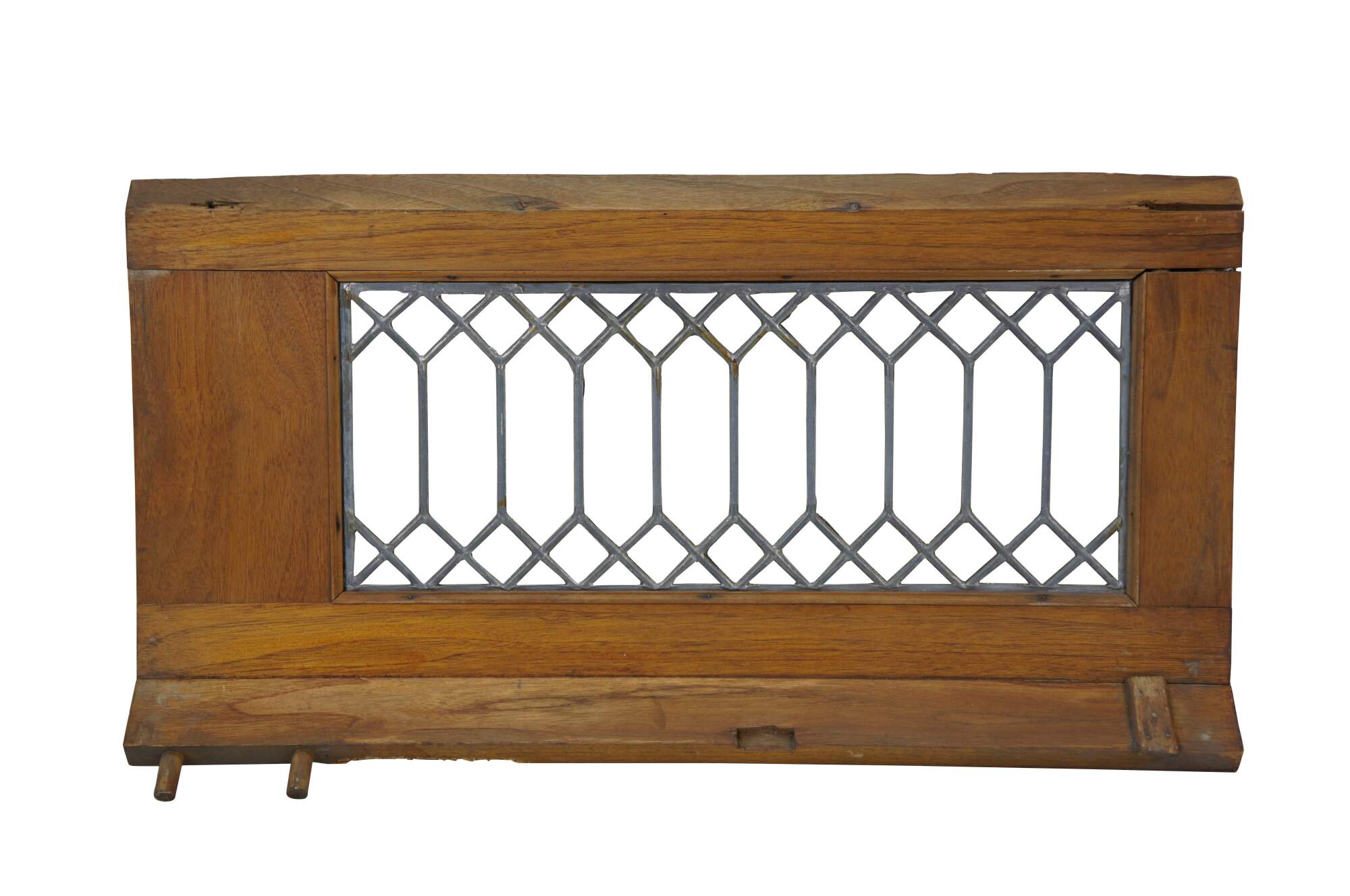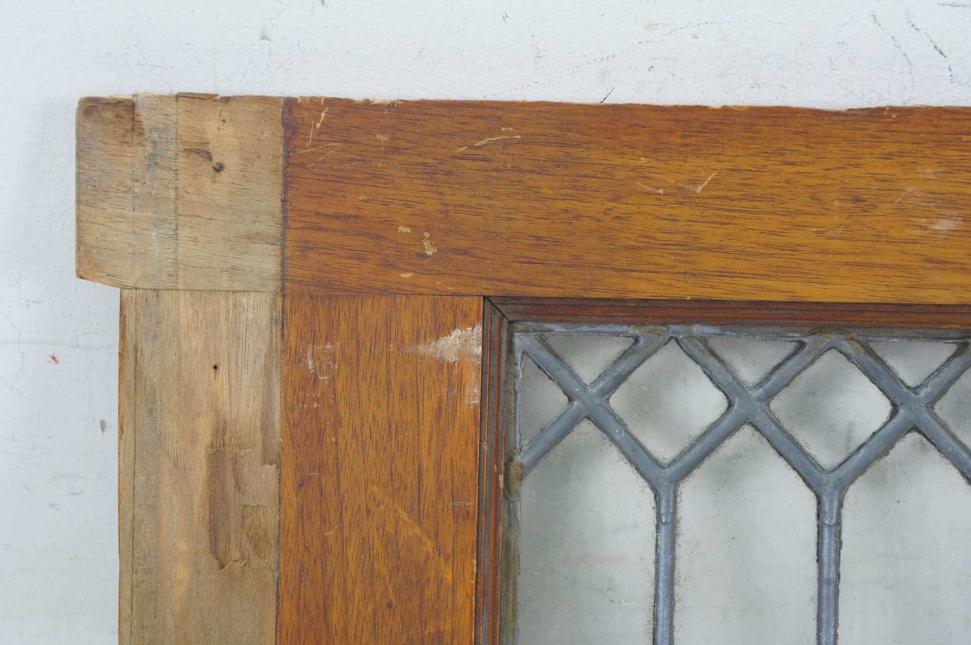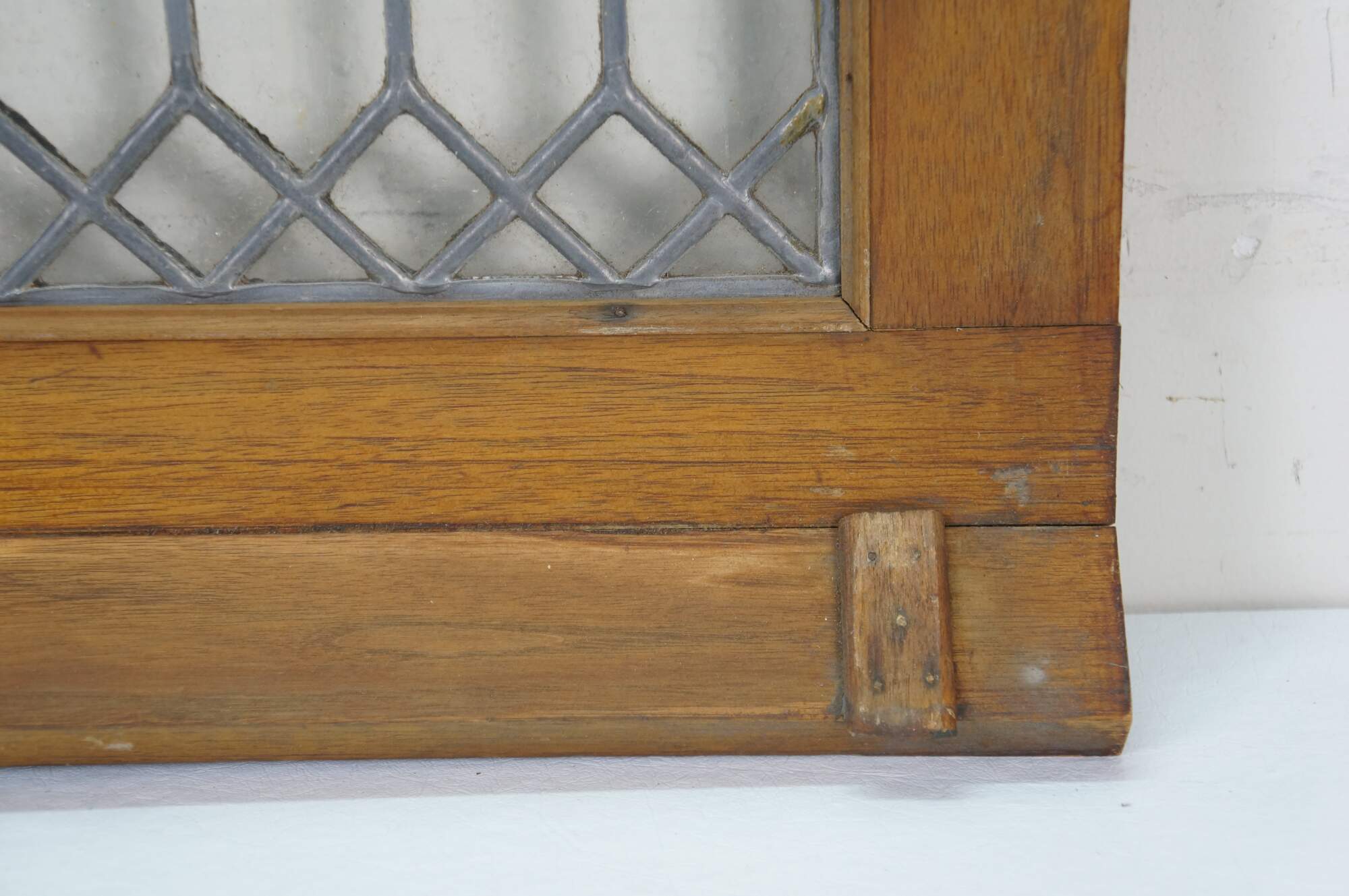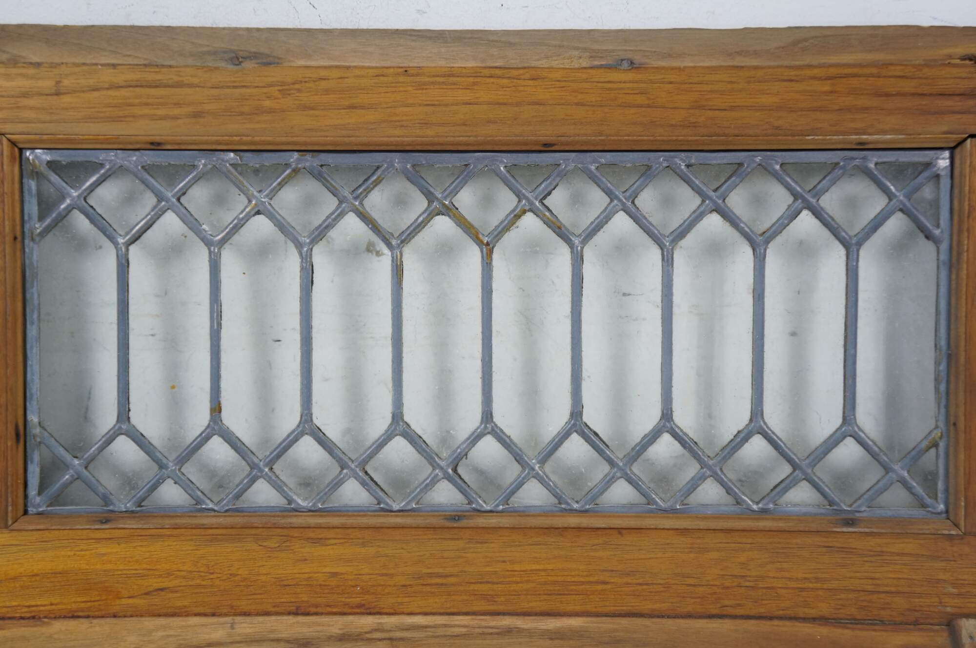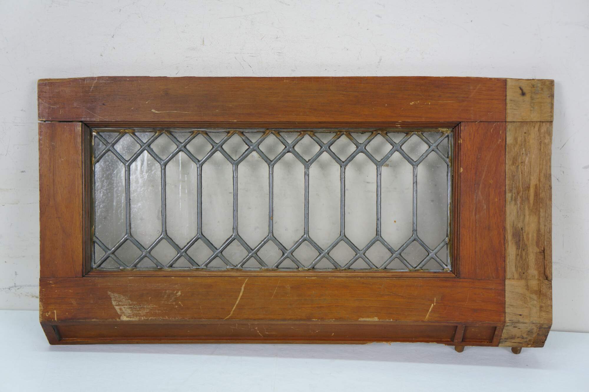 Pair of antique architectural salvaged rectangular transom / cabinet windows - oak frames with angled base; clear leaded geometric picket fence style glass.