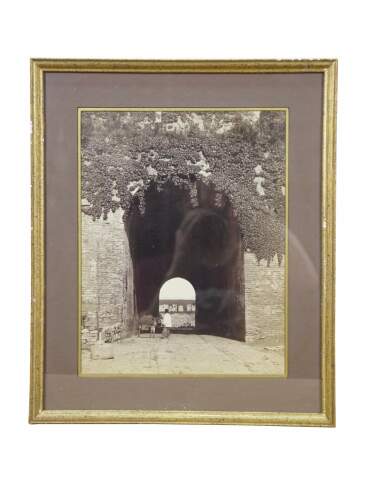 Pair of antique black and white photographic prints showing the City Gate entrance of Nanking (Nanjing) and a view of Hong Kong Harbor. Speckled gold painted frames; gray and gold layered mat.