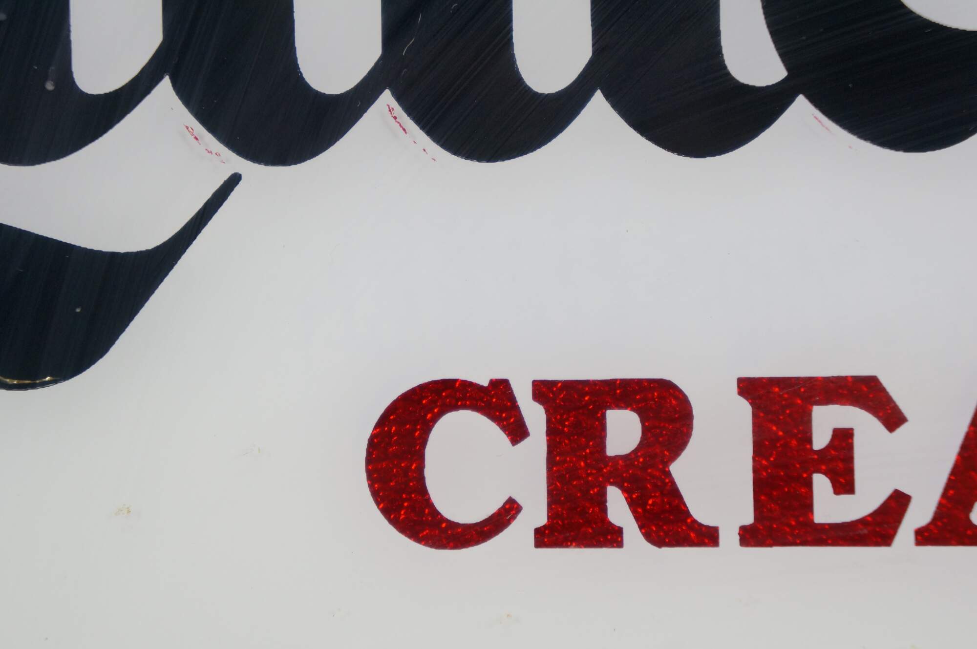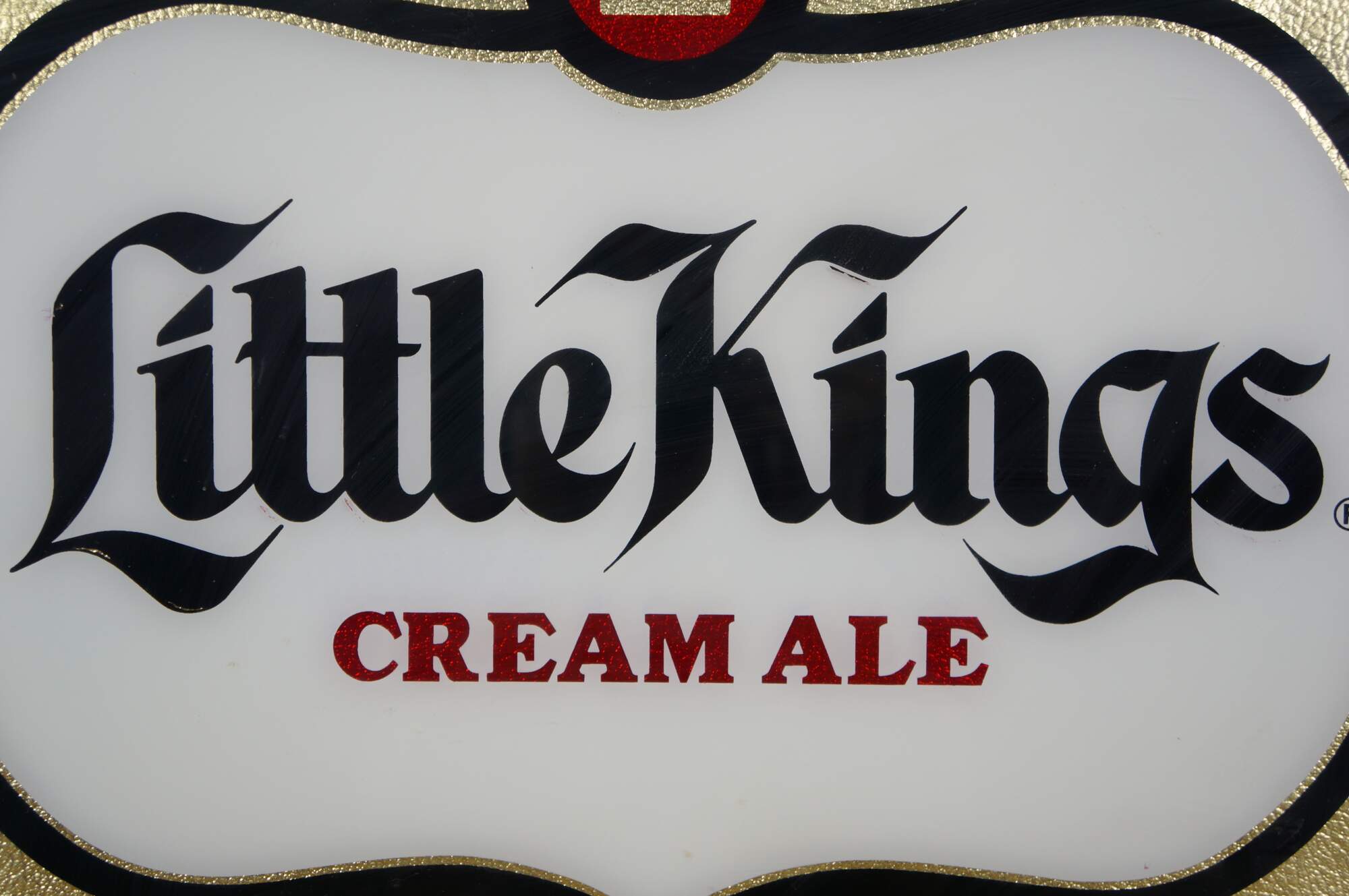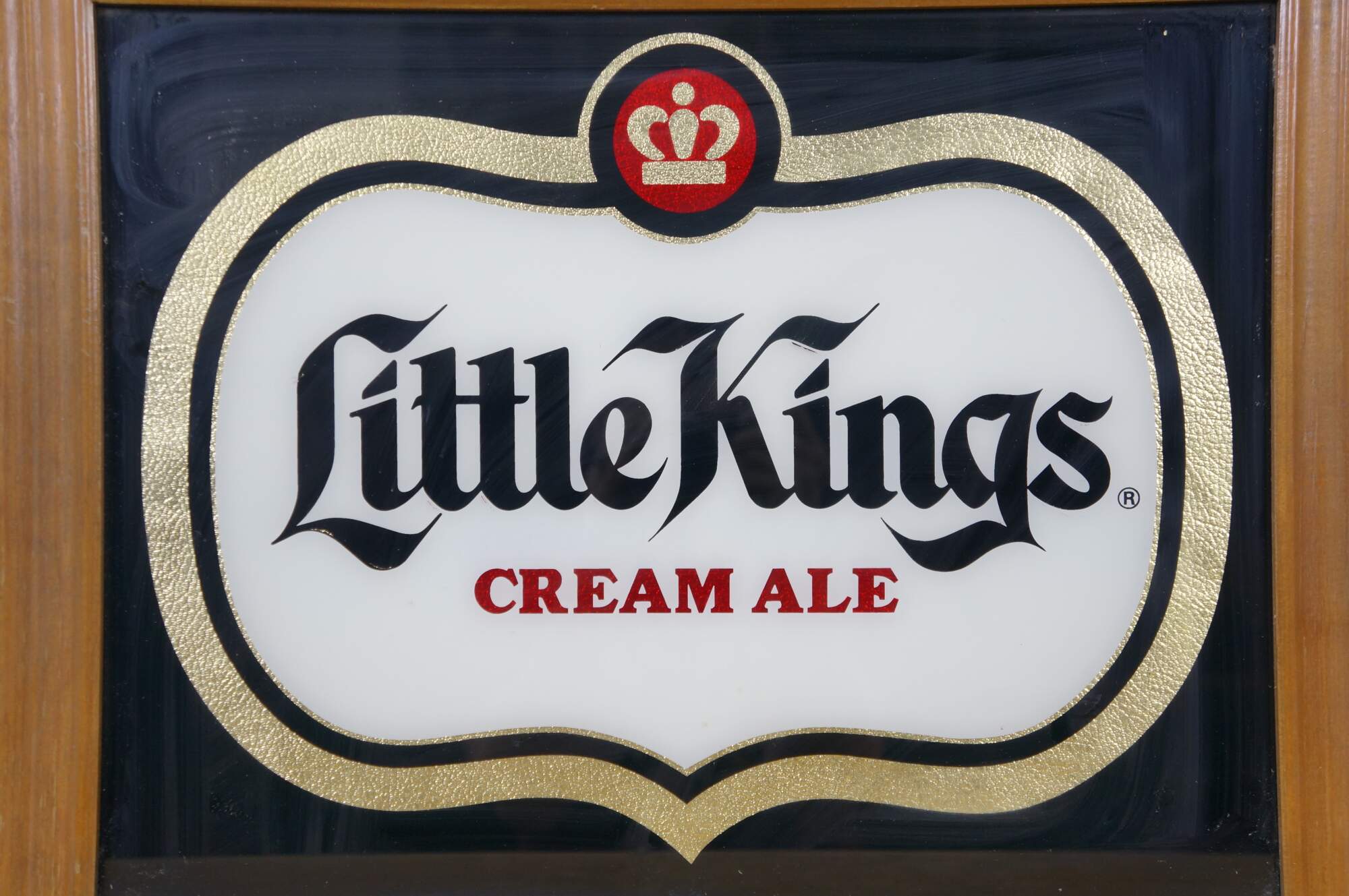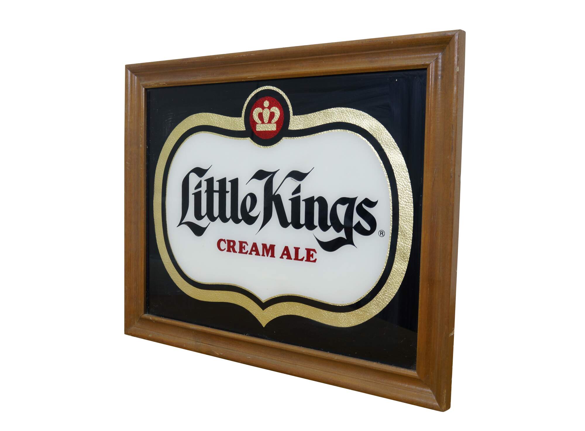 Vintage 20th century black, white and gold reverse painted glass mirrored bar ad sign advertising Little kings Cream Ale by Schoenling Brewery of Cincinnati, Ohio. Beveled wood frame.
