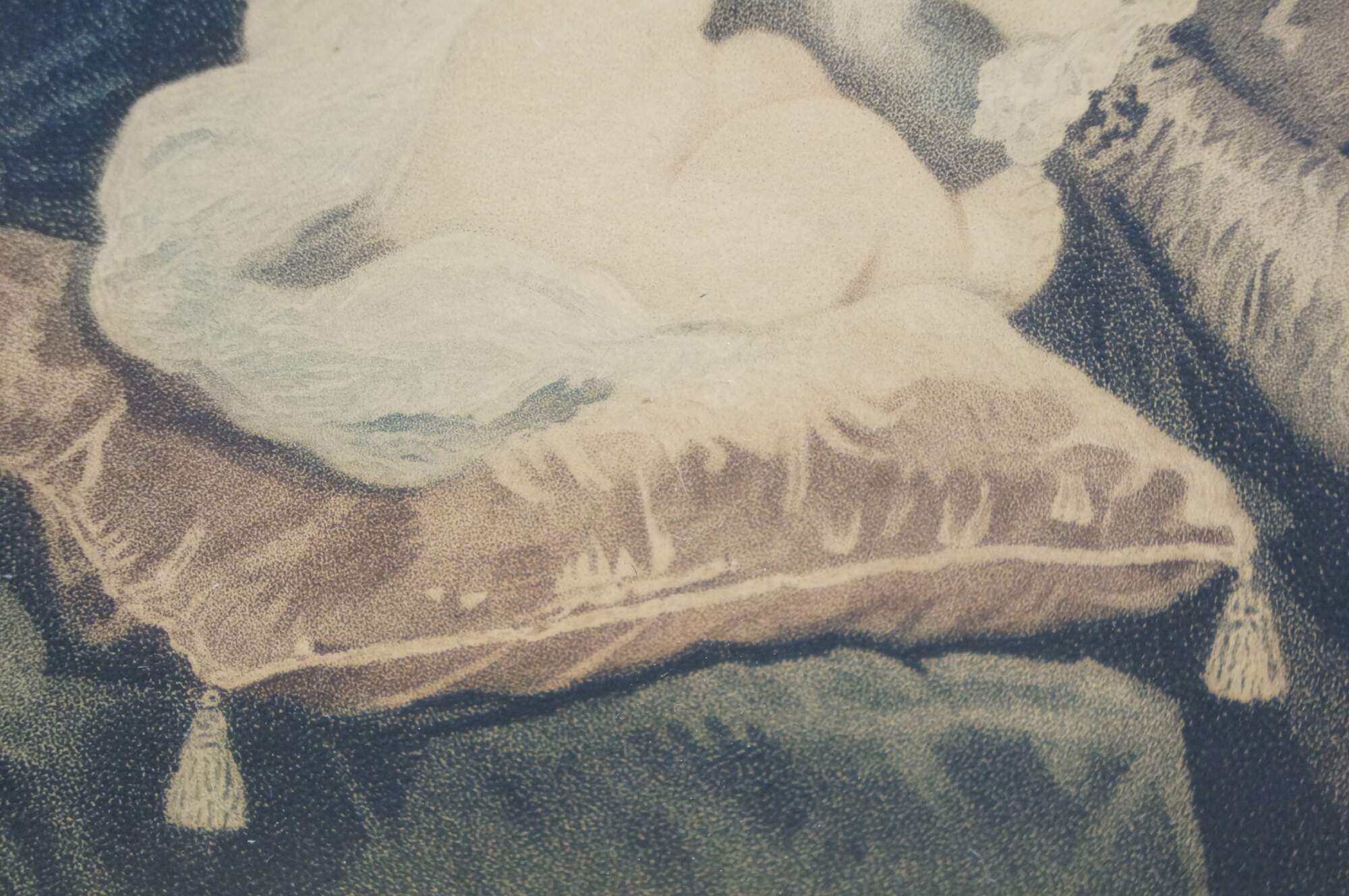 Antique circa 1800 auquatint and stipple engraving of Their Excellencies Prince Serge (Count Sergei Sergeyevich Gagarin) and Princess Barbara (Countess Varvara Nikolaevna Gagarina) with Prince Nicholas their Son, after a painting by Sir Joshua Reynolds, engraved by Caroline Watson, Engraver to her Majesty. Published Feb. 15, 1800 by Anthony Molteno, Printseller to her Royal Highness the Duchess of York, No 29 Pall Mall. Inherited from an estate and reframed in 1975. Beveled gilt wood frame; pale blue and gold layered mat.