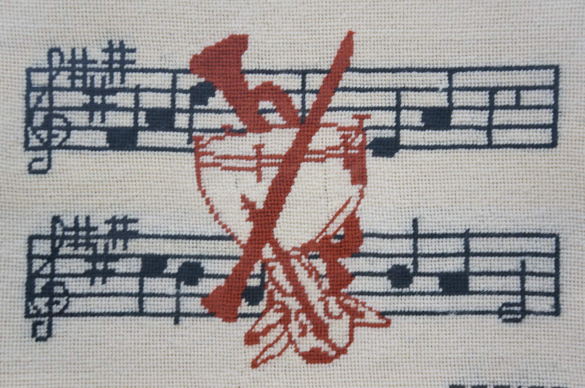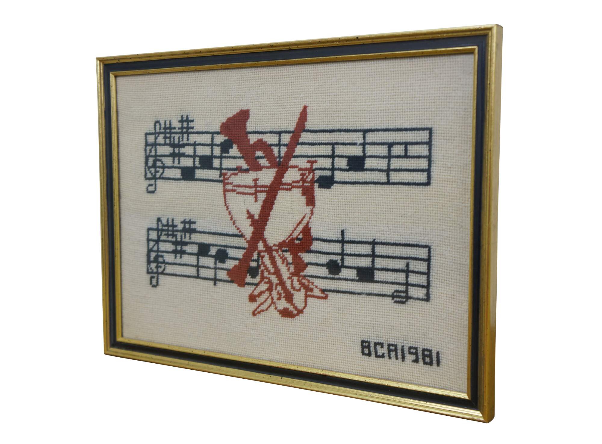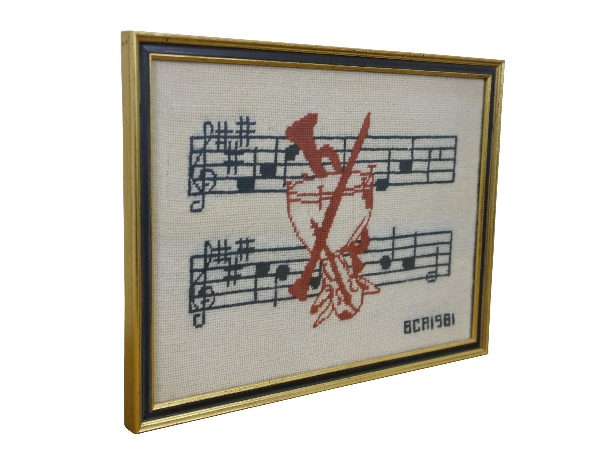 Vintage 1980's needlepoint art showing two staffs of music overlaid with a cluster of instruments in red, with the text BCA 1981 in the lower right corner. Black and gold beveled wood frame.