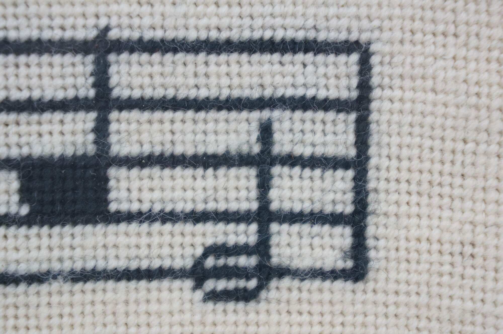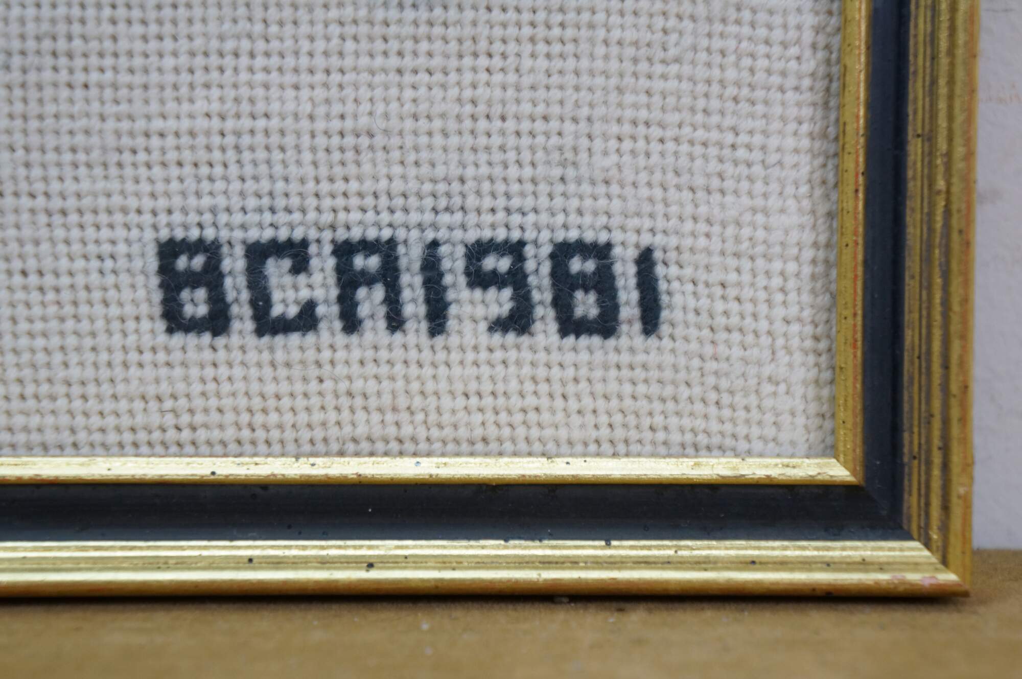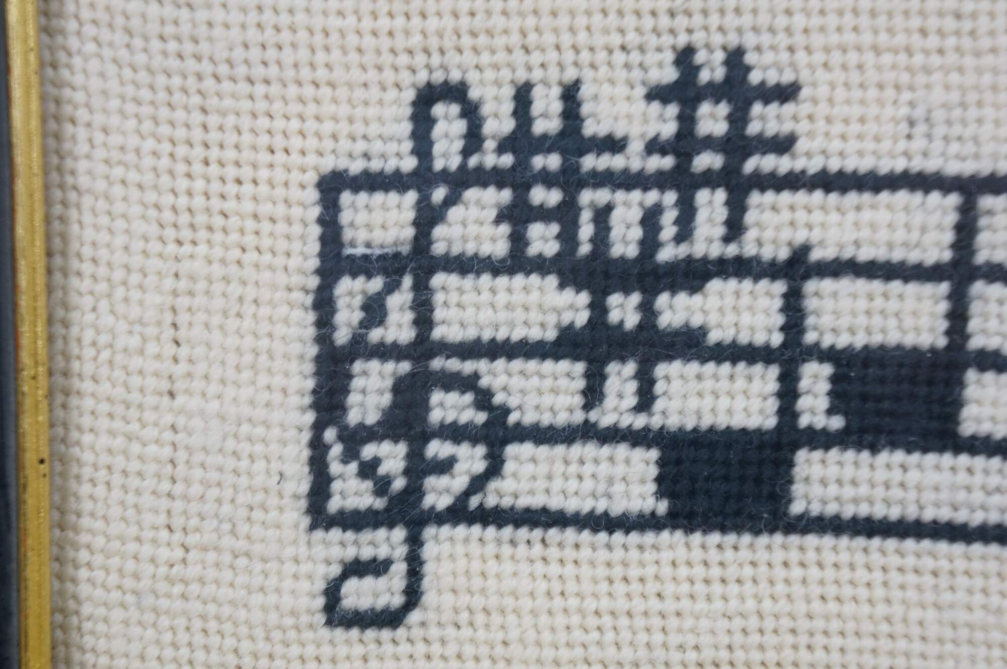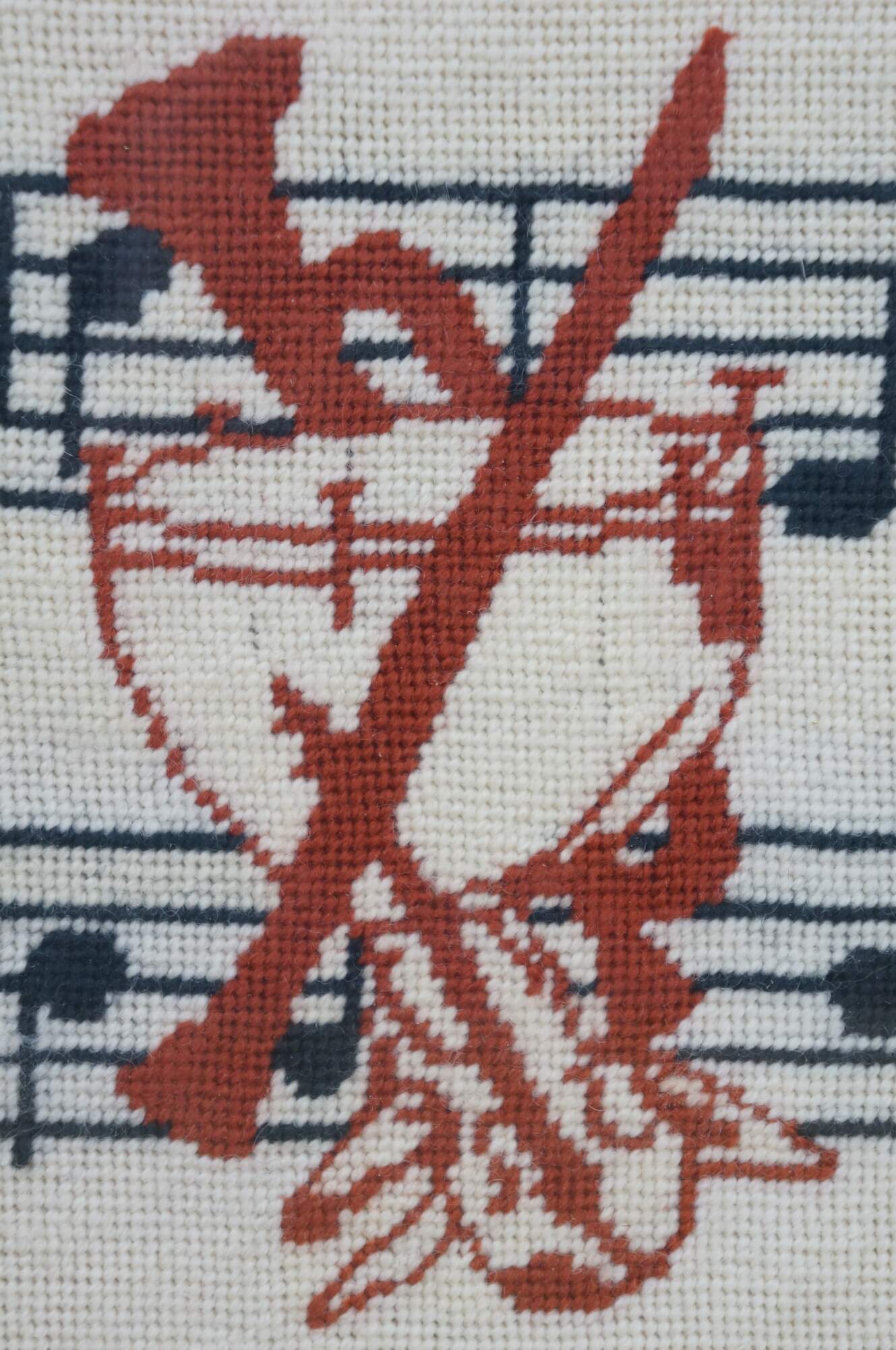 Vintage 1980's needlepoint art showing two staffs of music overlaid with a cluster of instruments in red, with the text BCA 1981 in the lower right corner. Black and gold beveled wood frame.