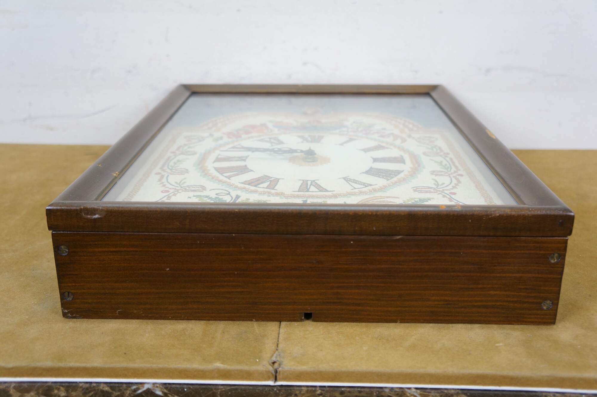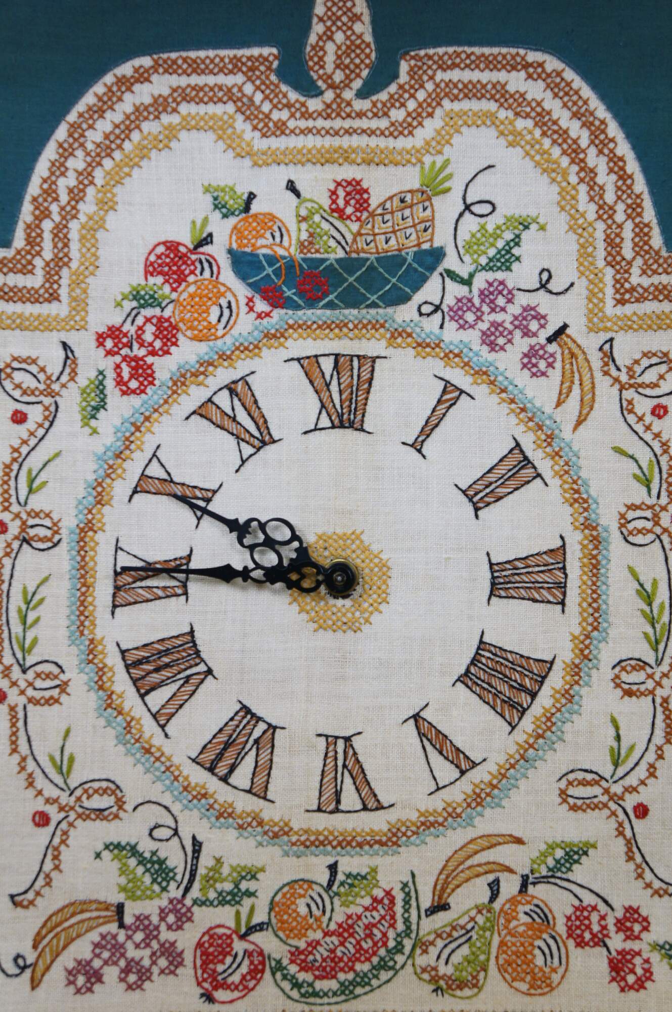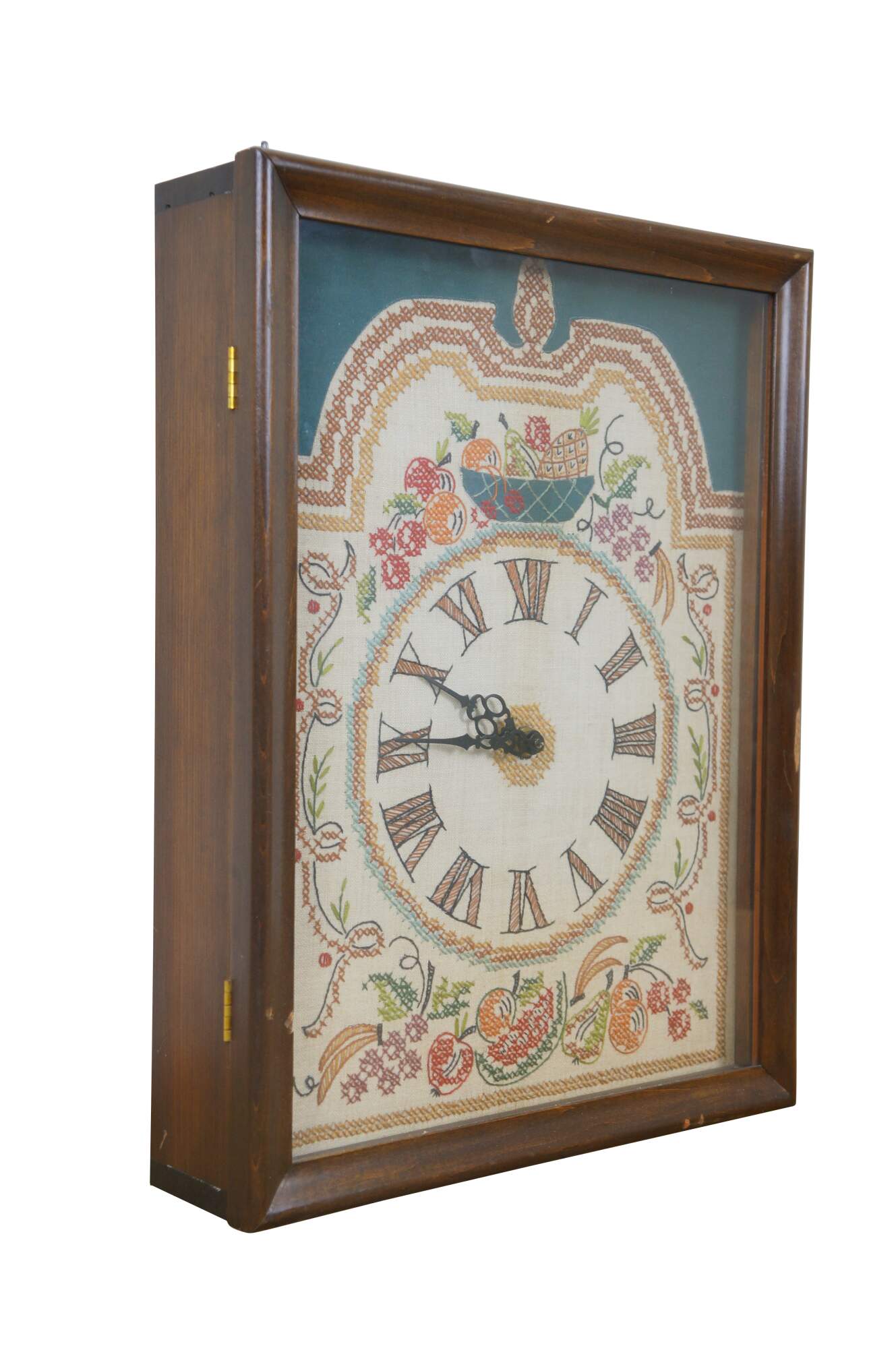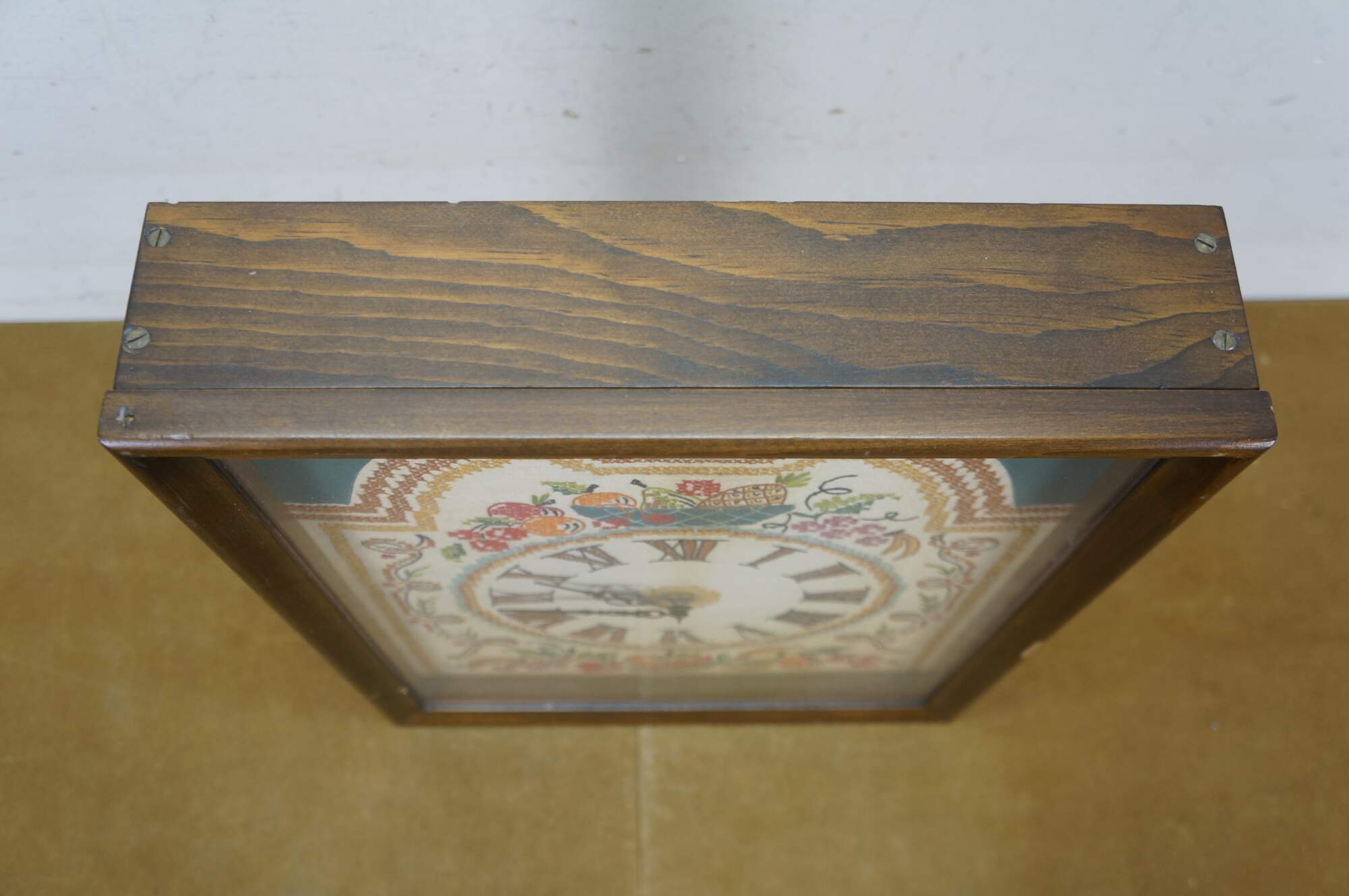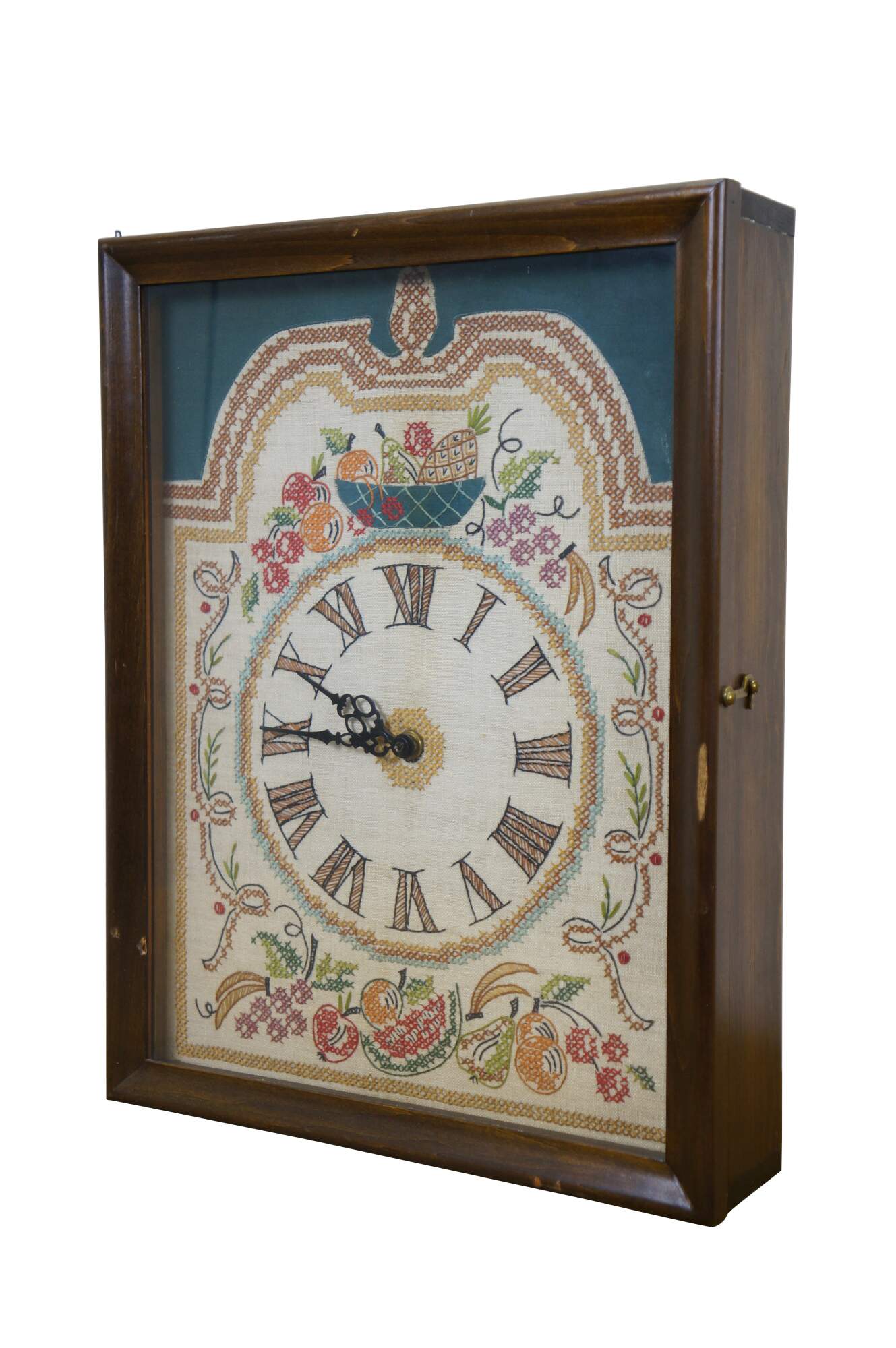 Mid 20th century Telechron electric wall clock in wooden shadowbox case with cross stitch / needlepoint face featuring scroling vines and a variety of fruit; brown Roman numerals. Black metal hands. Telechron Movement 6101-602 - 115v 60c 2w - Made in USA. 2-CA-3842. Made Expressly for the American Home by Paragon Needlecraft.
