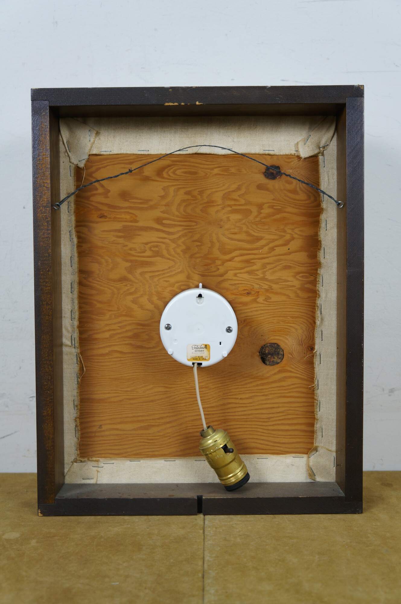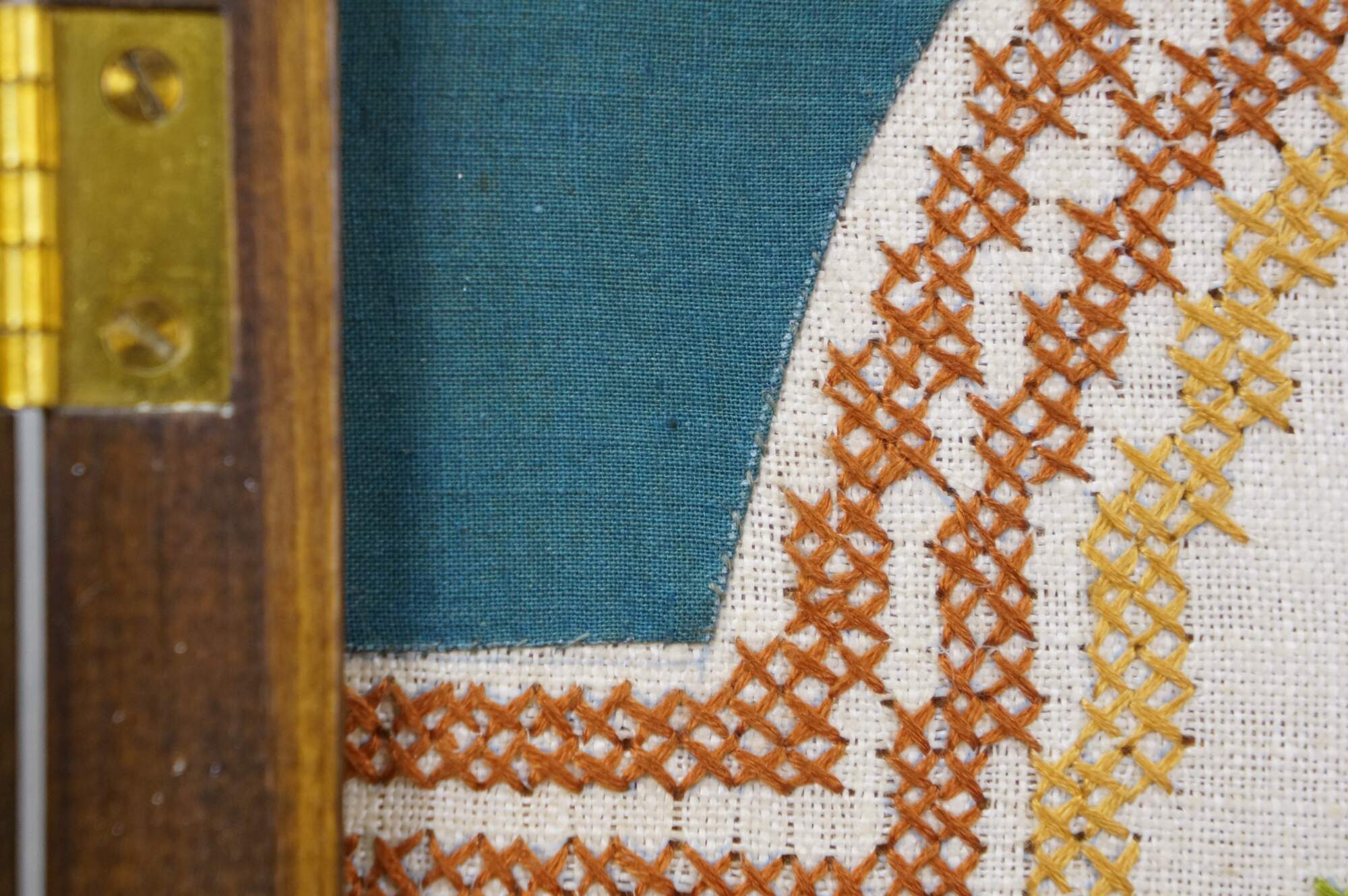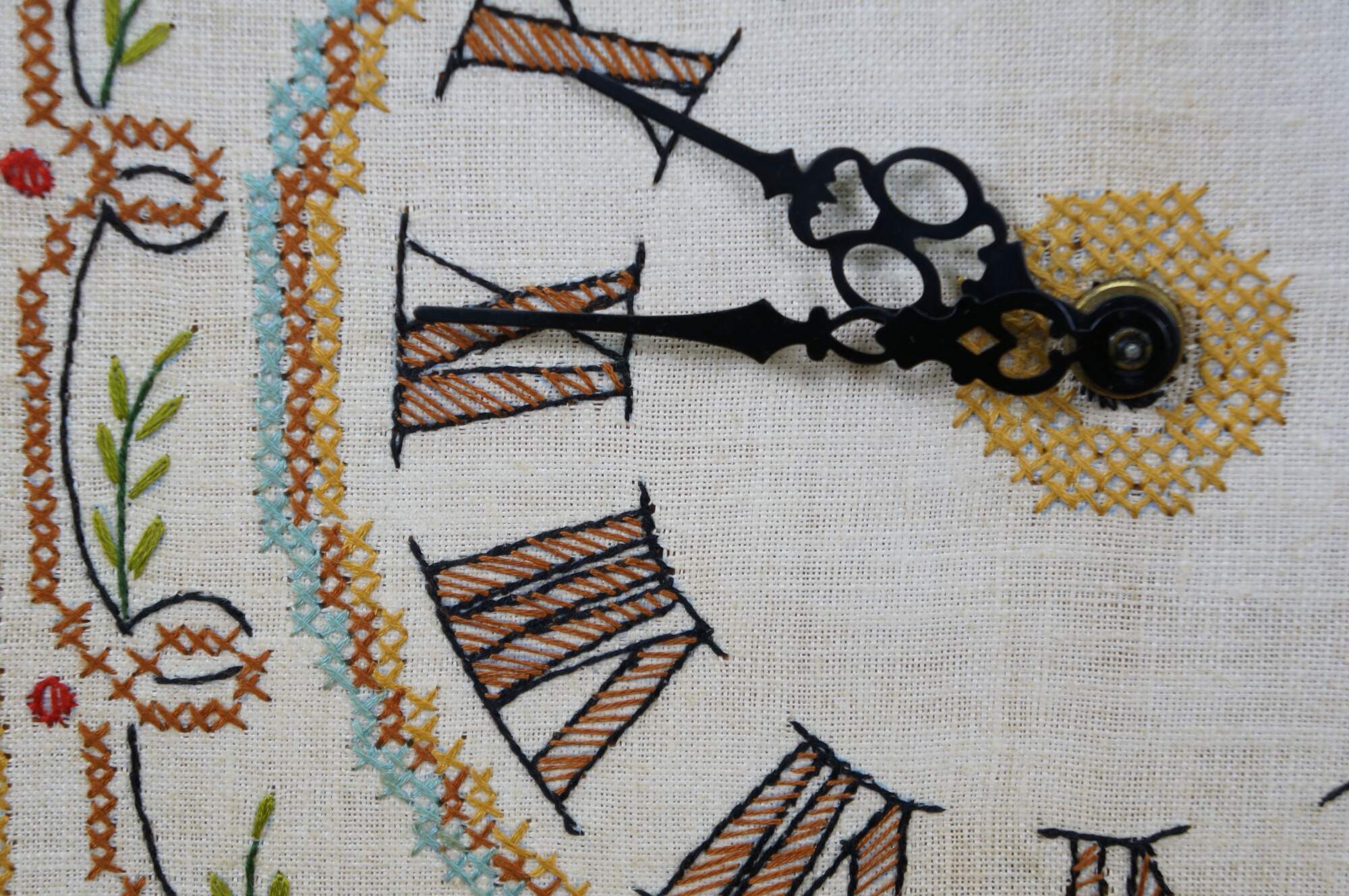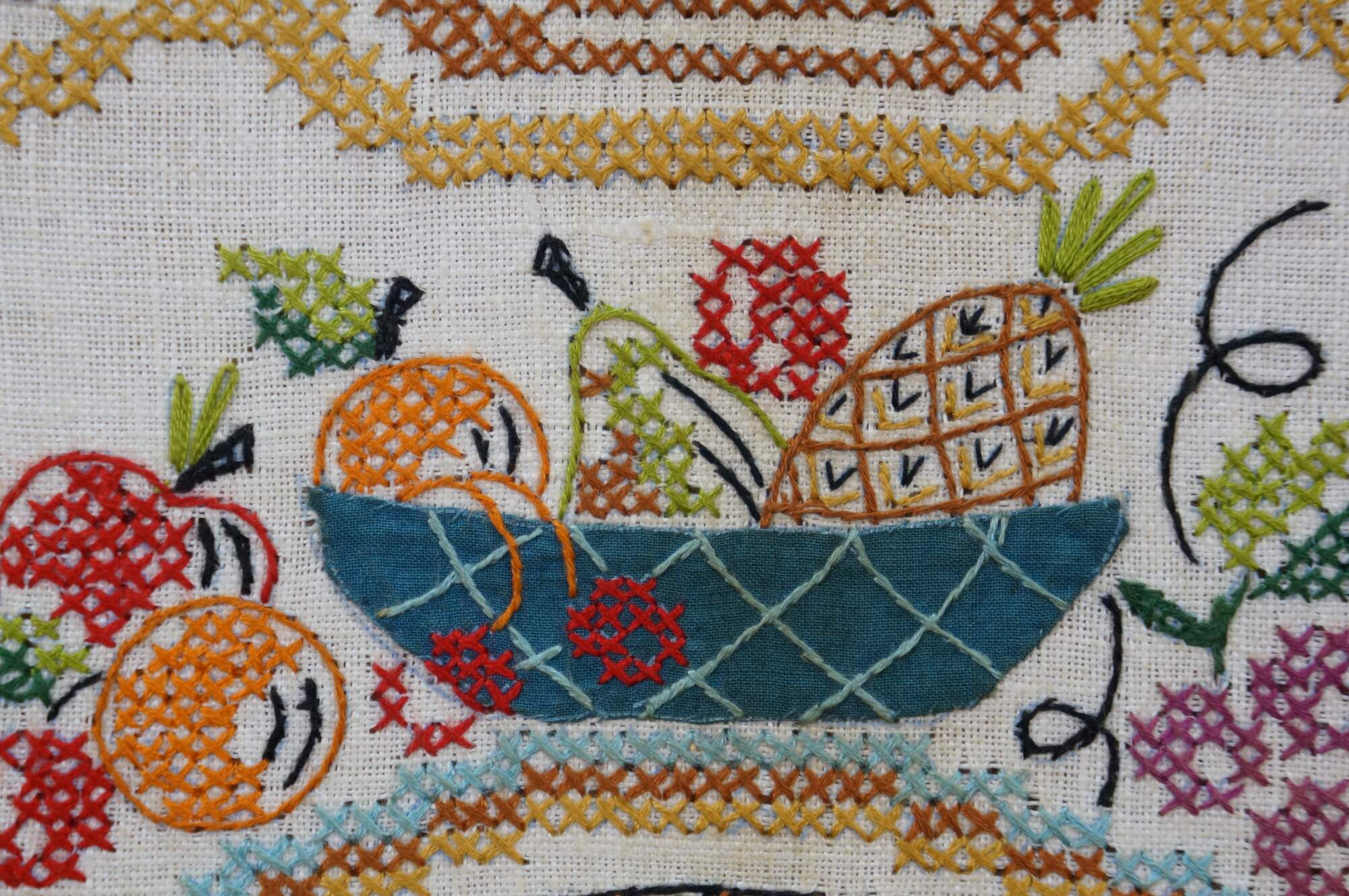 Mid 20th century Telechron electric wall clock in wooden shadowbox case with cross stitch / needlepoint face featuring scroling vines and a variety of fruit; brown Roman numerals. Black metal hands. Telechron Movement 6101-602 - 115v 60c 2w - Made in USA. 2-CA-3842. Made Expressly for the American Home by Paragon Needlecraft.
