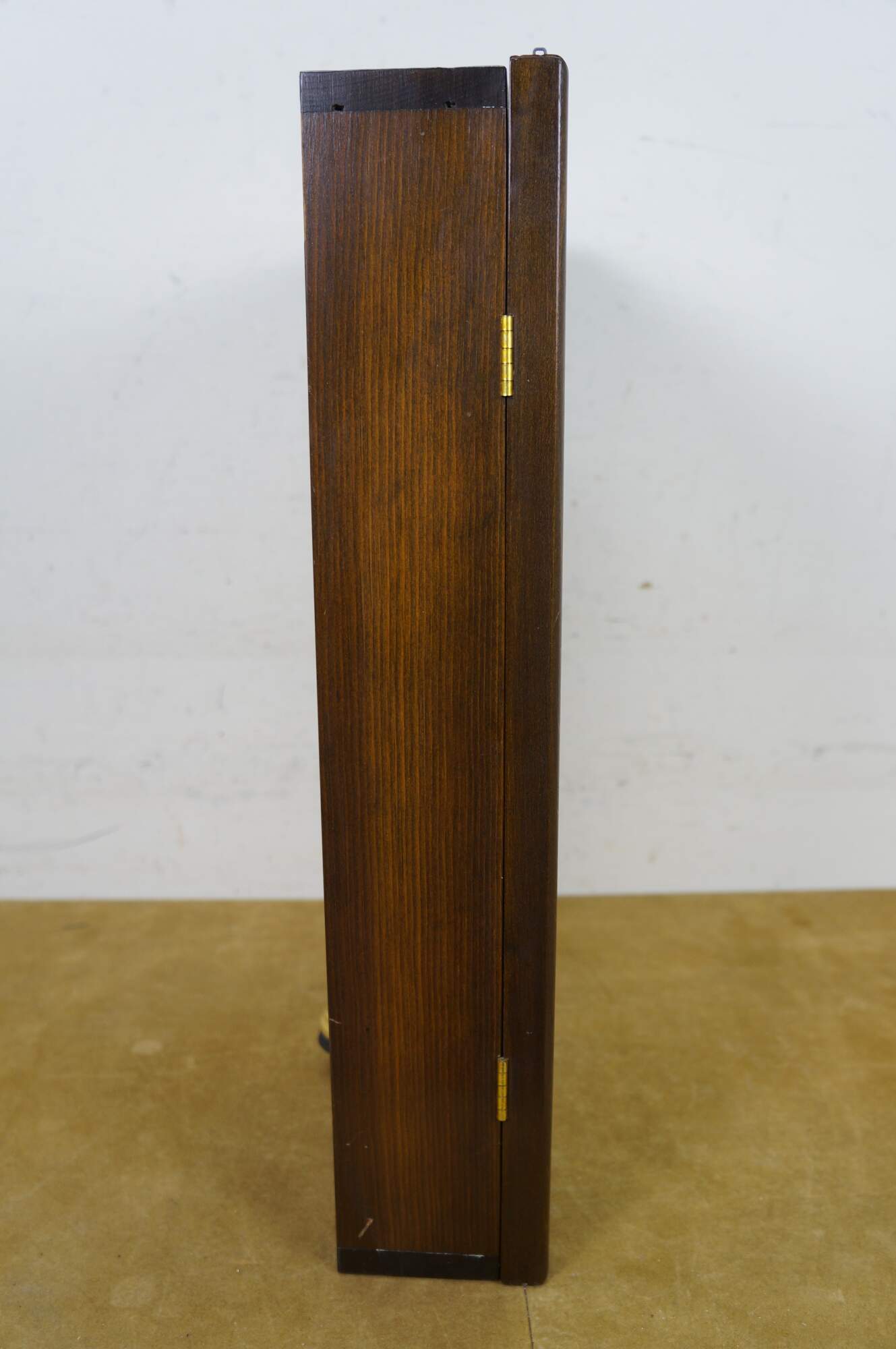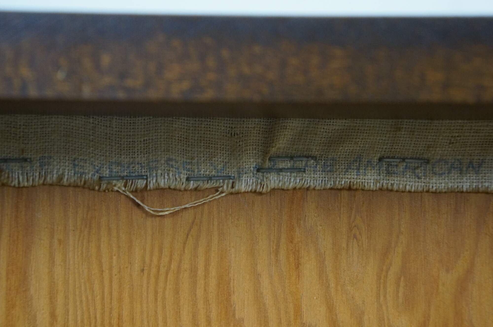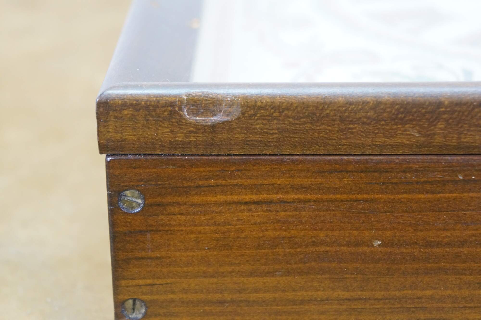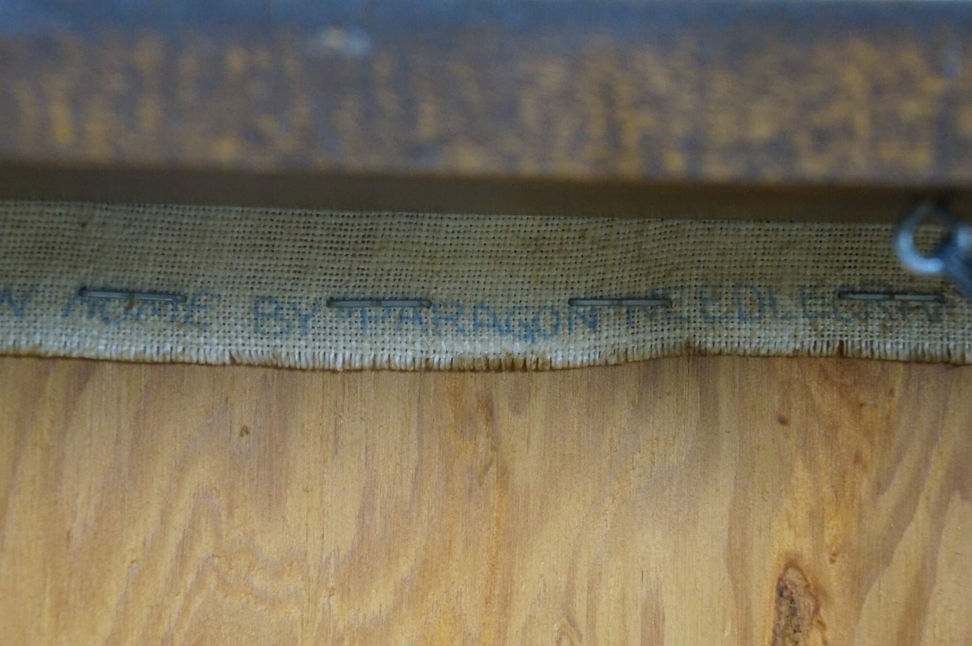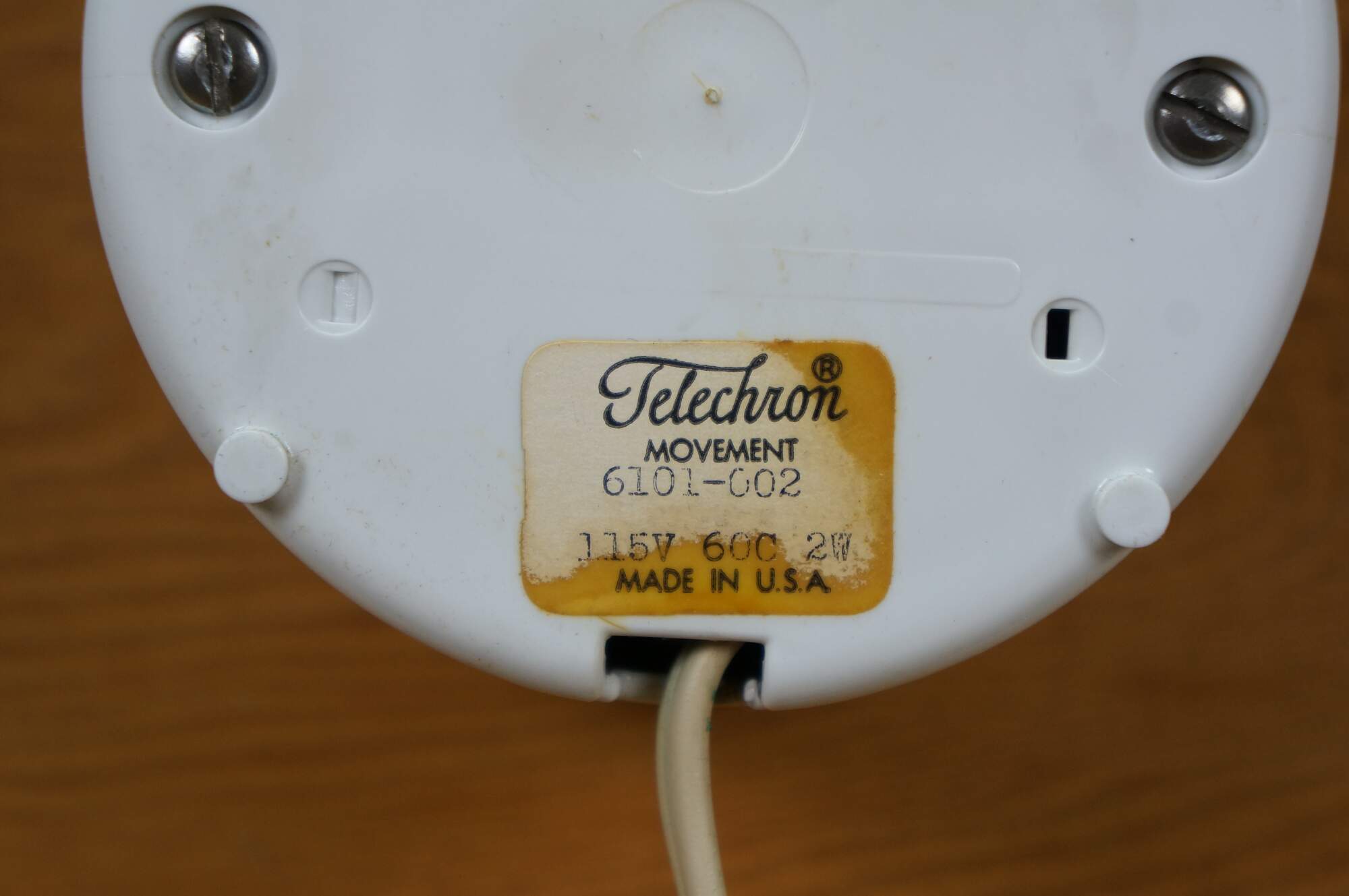 Mid 20th century Telechron electric wall clock in wooden shadowbox case with cross stitch / needlepoint face featuring scroling vines and a variety of fruit; brown Roman numerals. Black metal hands. Telechron Movement 6101-602 - 115v 60c 2w - Made in USA. 2-CA-3842. Made Expressly for the American Home by Paragon Needlecraft.