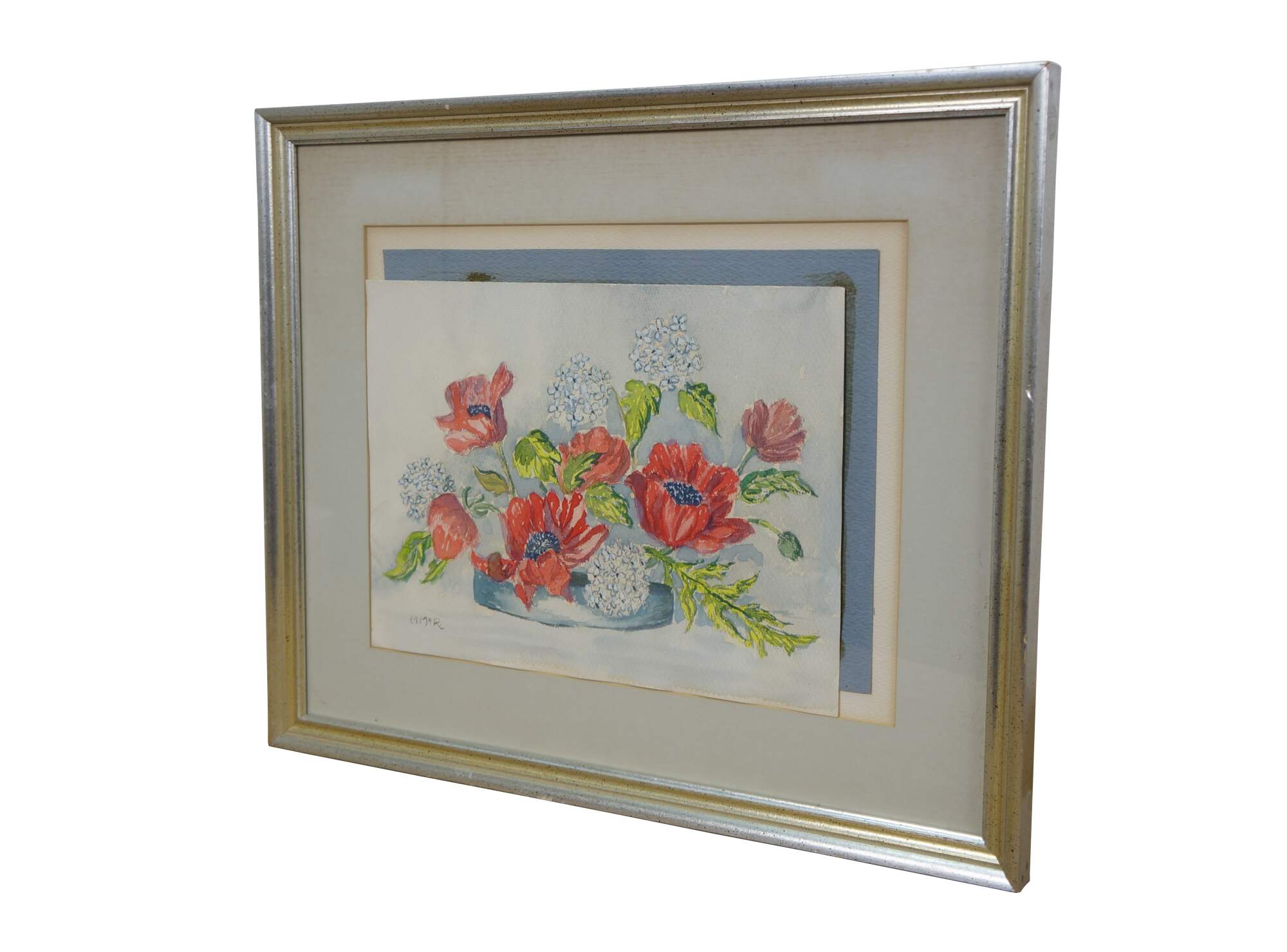 Vintage 20th century watercolor on paper still life painting of red and white flowers in a low dish. Signed H. McR in lower left.