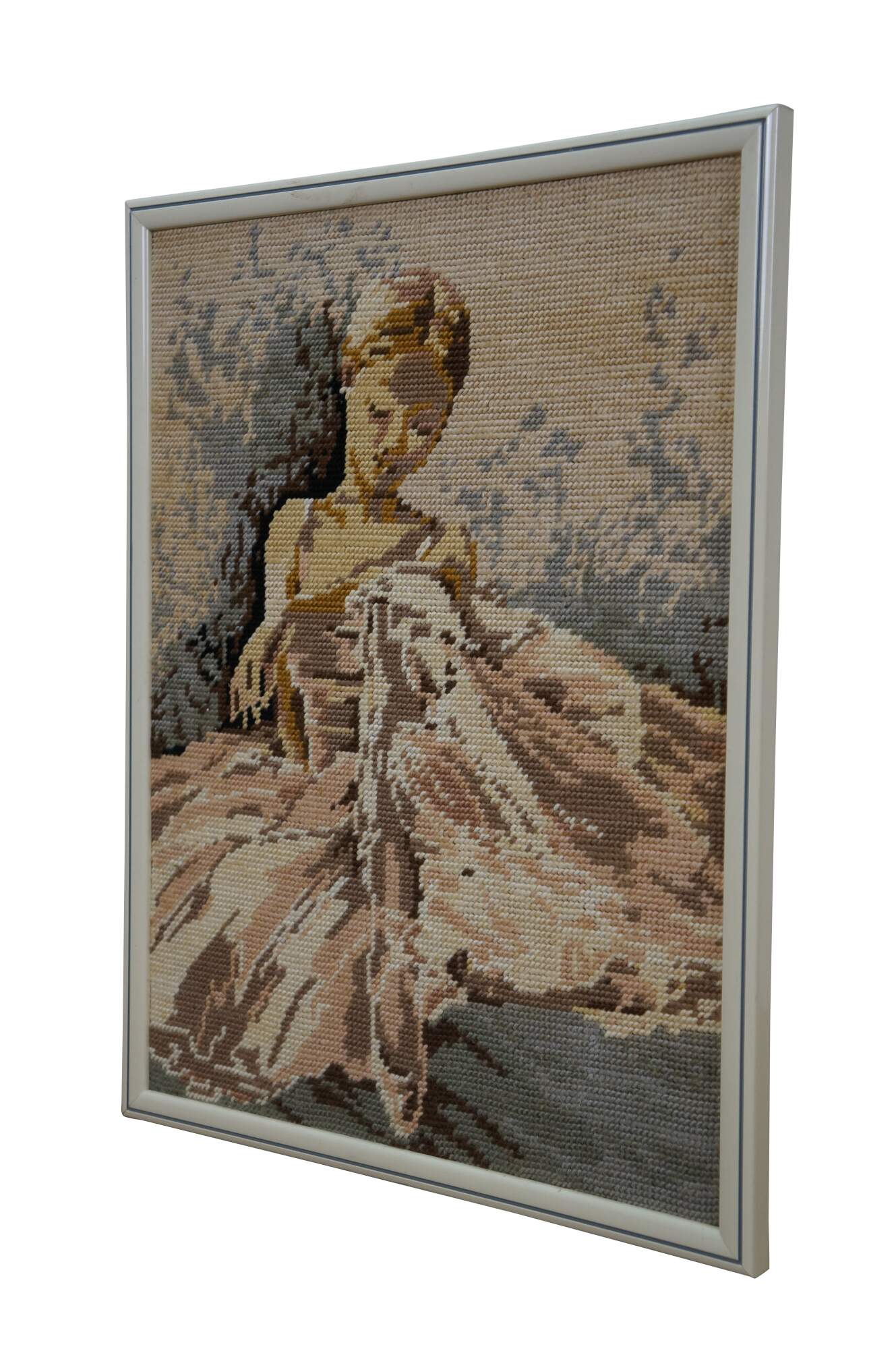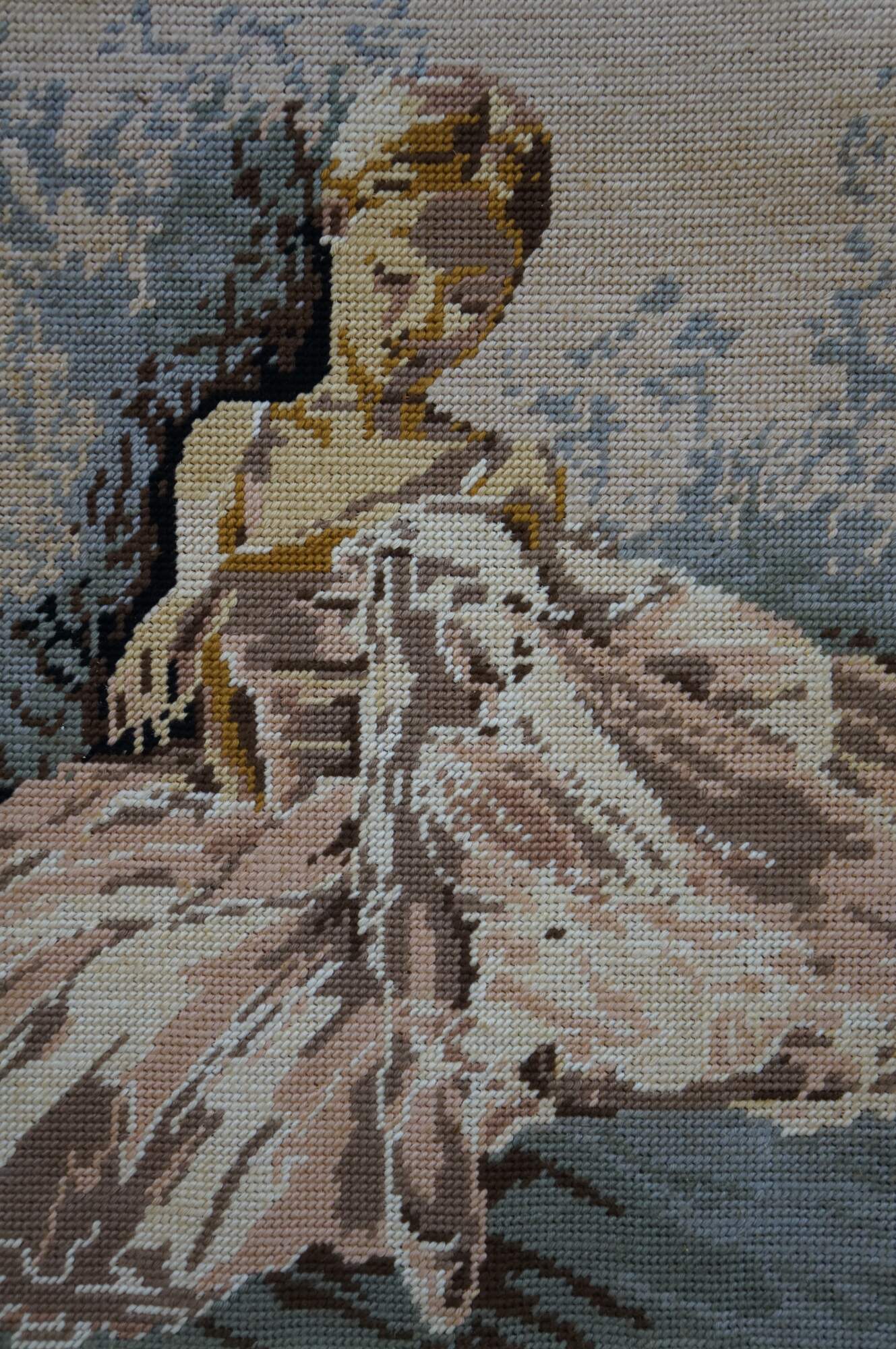 Vintage 20th century framed completed needlepoint tapestry titled Danseuse (Dancer), a printed canvas cross stitch pattern produced by SEG de Paris. This hand stitched work of textile art depicts a seated ballerina in large pink skirt on a blue and beige background. Beveled white painted frame.
