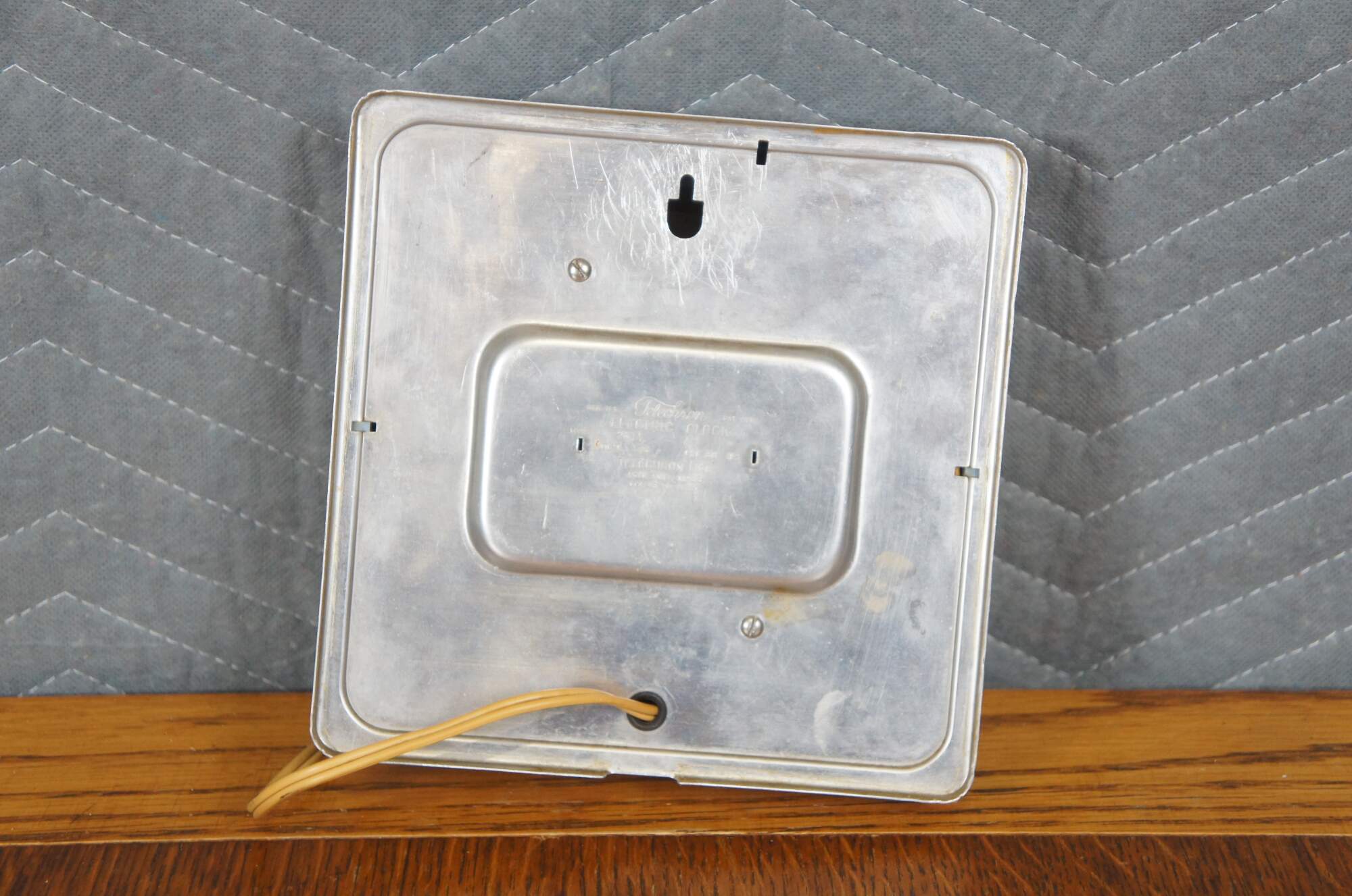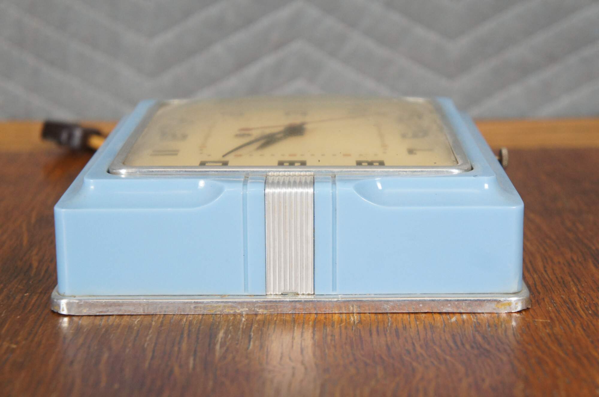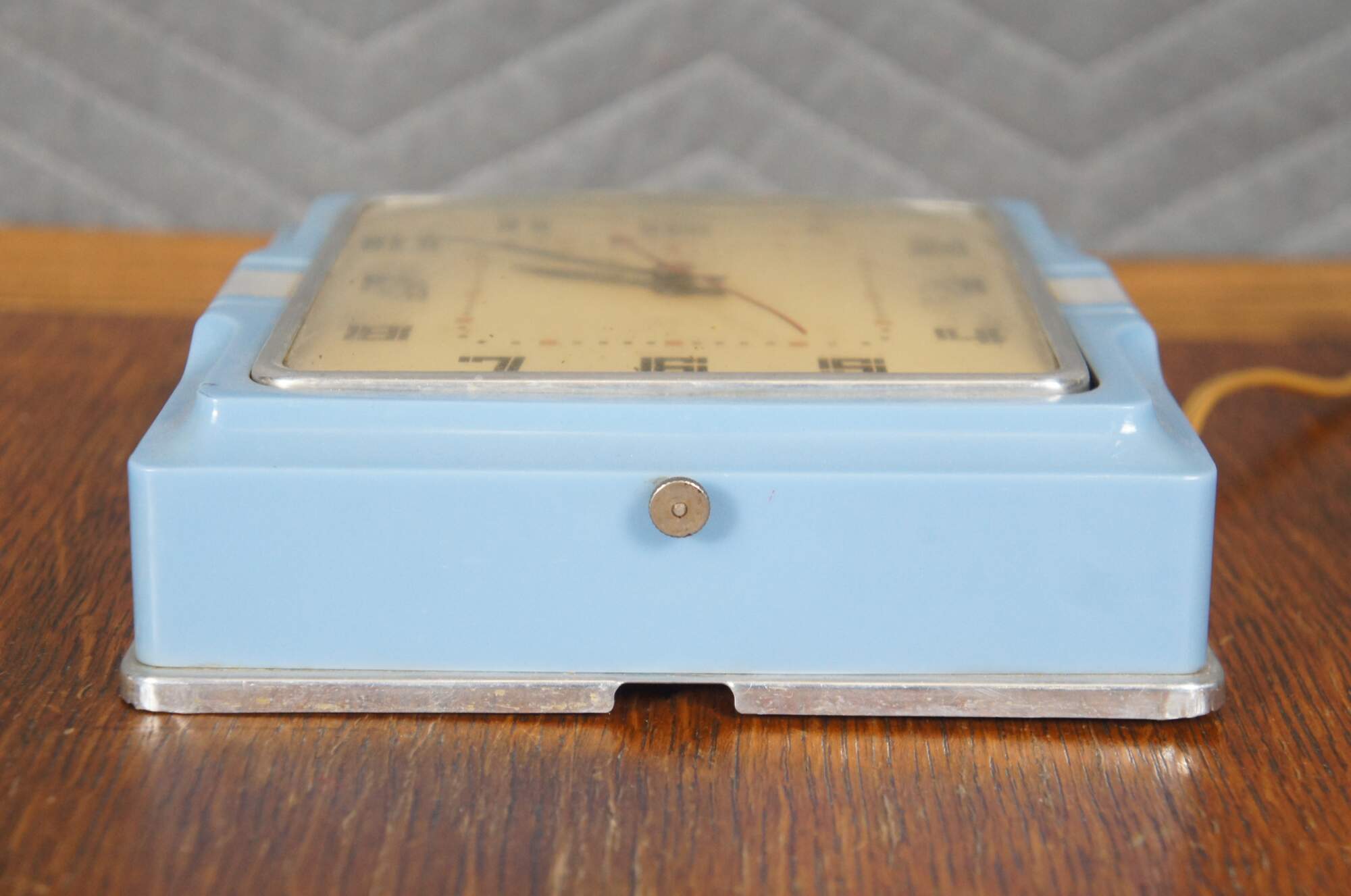 Vintage mid 20th century Telechron electric wall clock, Model 2H11, featuring the rare baby blue Bakelite case with silver accents and art deco styling. Yellowed face with black stylized art deco Arabic numerals and hands; black and orange minute marks. Volts 115 Cyc 60 W2 - Telechron Inc, Ashland, Mass, USA. Works.