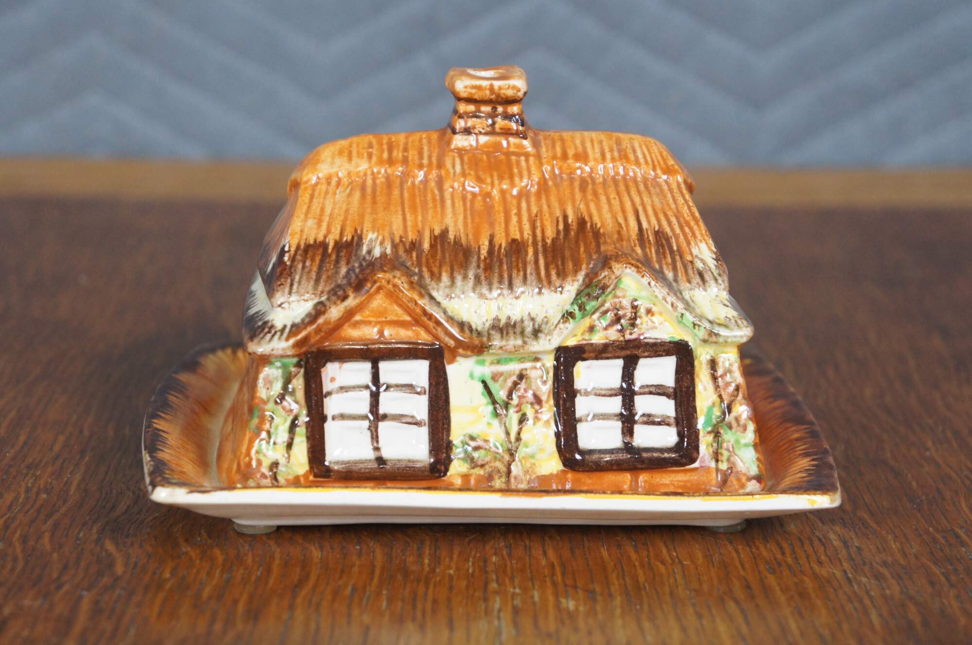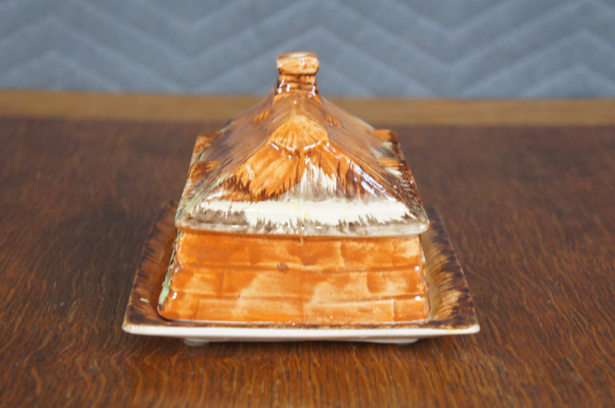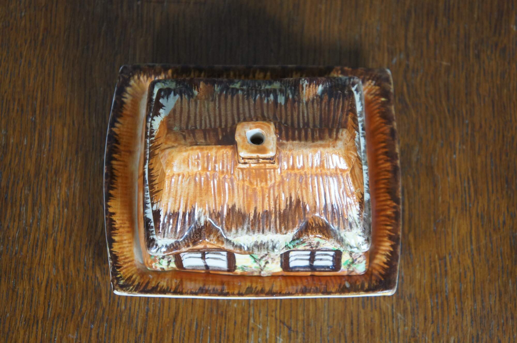Mid 20th century Price Bros Cottage Ware porcelain butter / cheese dish. Rectangular underplate painted as if made of thatch with a thatched cottage shaped dome / lid. Made in England.