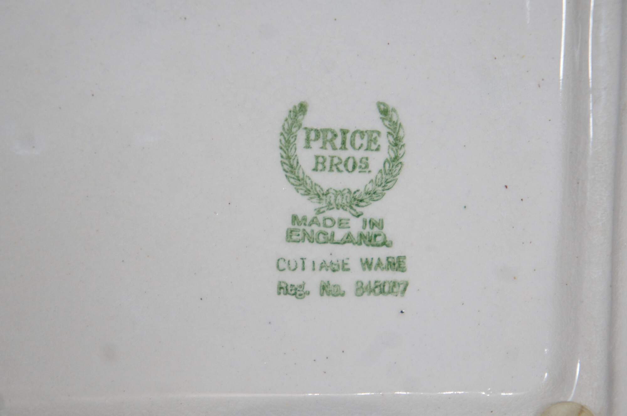 "Originally formed in 1896 as Price Brothers. In 1903 renamed as Price Bros (Burslem) Ltd at the Albion Works, Navigation Road, Burslem. By 1912 they had moved to the Top Bridge Pottery, Longport, Burslem. In 1934 the company was unable to meet its financial obligations and entered into voluntary liquidation. Following this the Arthur Wood Group acquired Price Bros (Burslem) Ltd who continued to operated under their own name. In 1941, under the Wartime Concentration Scheme, Price Bros (Burslem) Ltd were designated as a Nucleus Firm. Kensington Pottery Ltd (a sister company) was concentrated with them at Top Bridge Pottery. Products of Price Bros and Kensington Pottery were made at Top Bridge Pottery as separate entities. Closed and concentrated companies were allowed to reopen from August 1945. n 1951 the company offices were recorded as: Managing Director - Gerald F. Wood; Sales Manager - A. O. Evans; Decorating Manager - A. C. Rowley (these 3 were the same as Kensington Potteries); Works Manager - J. W. Wood. Price Bros had agents in 24 countries. In December 1961 Price Brothers (Burslem) and Kensington Pottery were amalgamated as Price & Kensington Potteries Ltd." (Source: The Potteries)