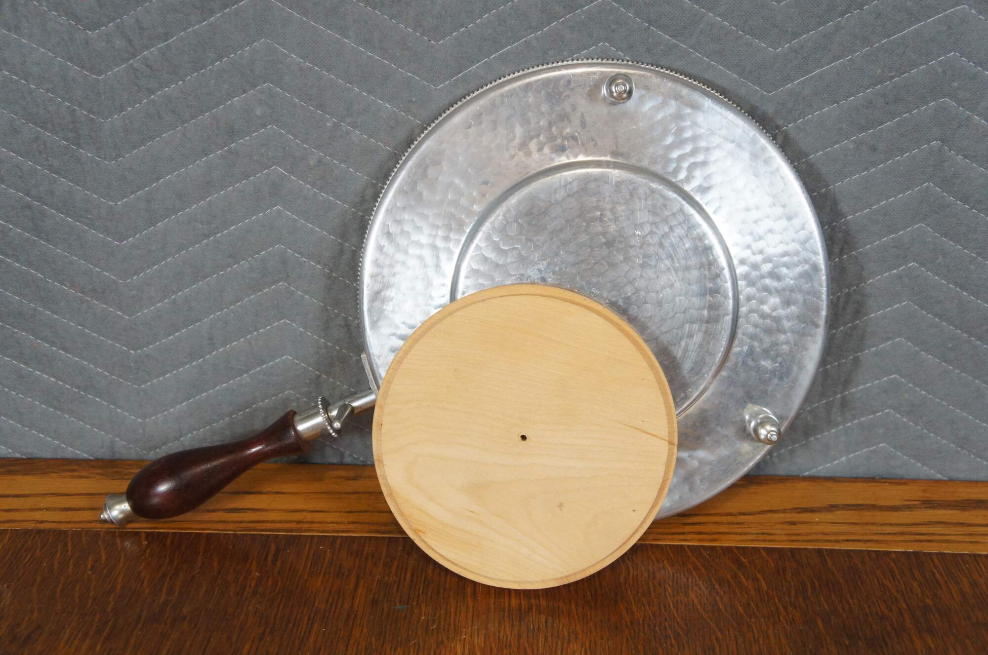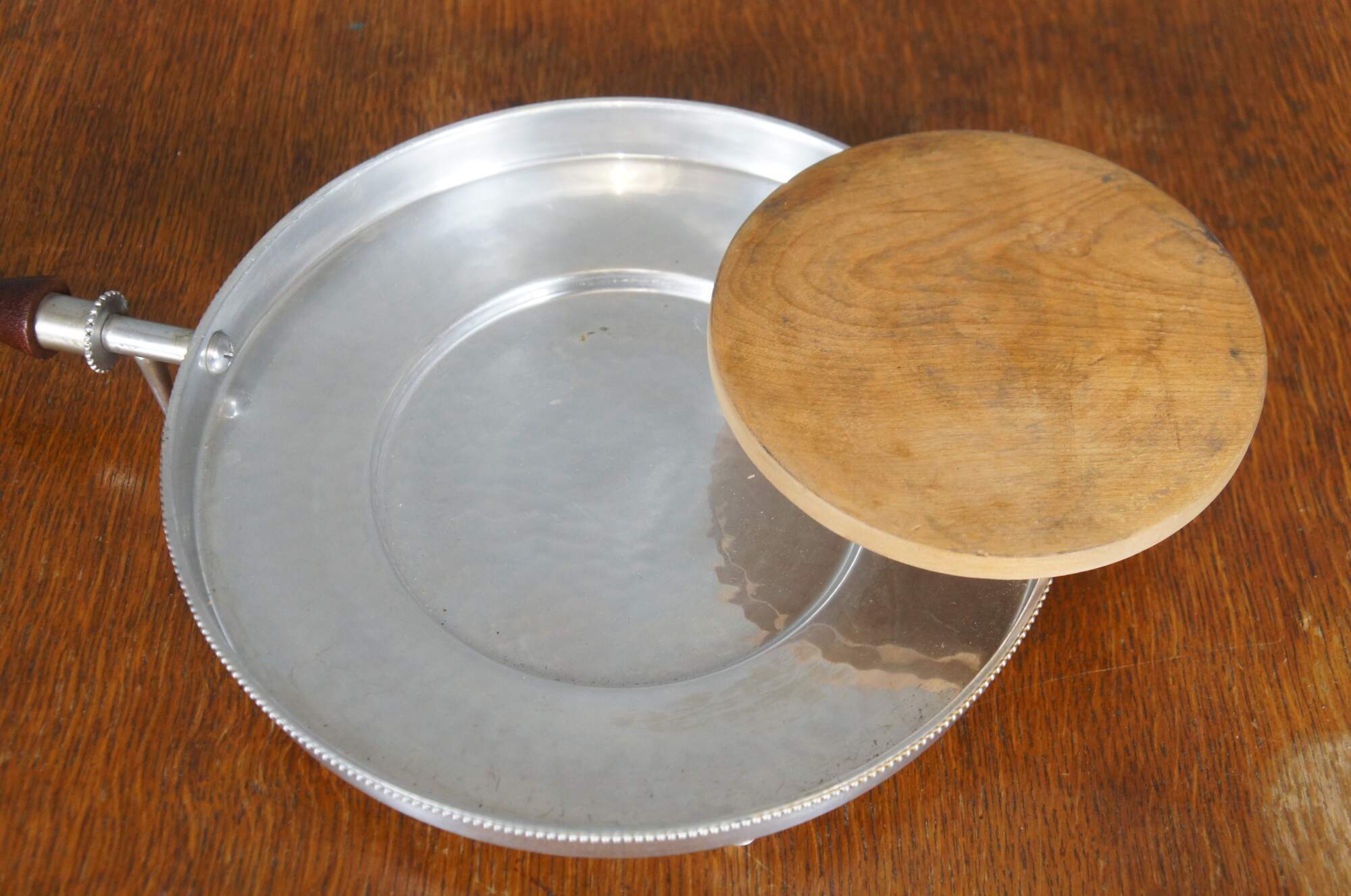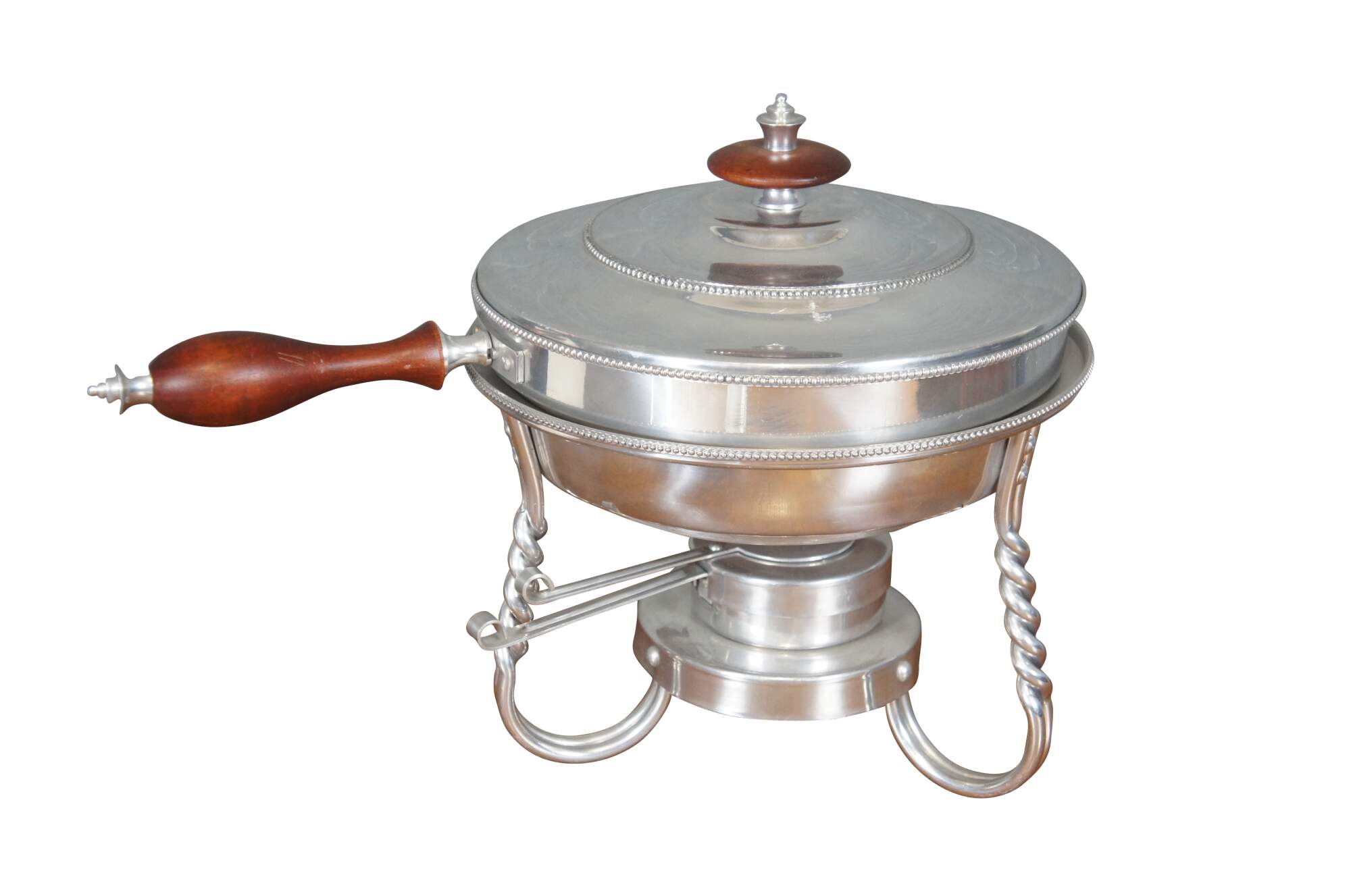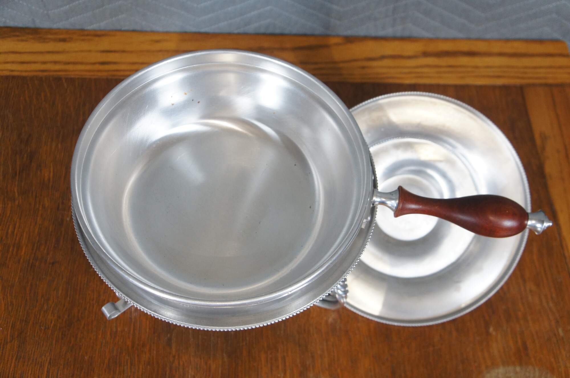 Vintage seven piece mid 20th century Buenilum hammered aluminum chafing dish set including: chafing stand with burner; double boiler pot with lid and wood handles; and low footed pan with wood insert / trivet and handle.