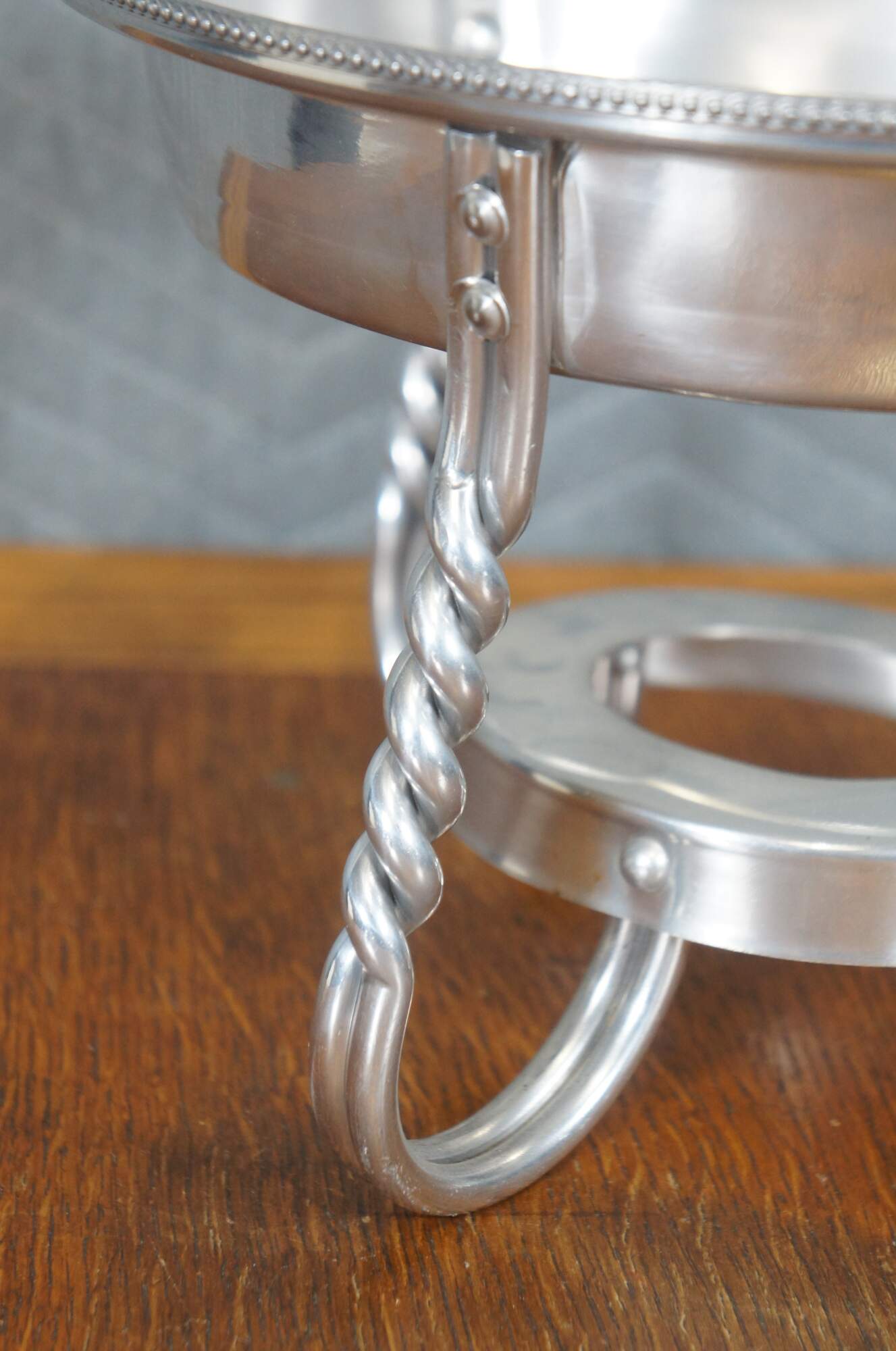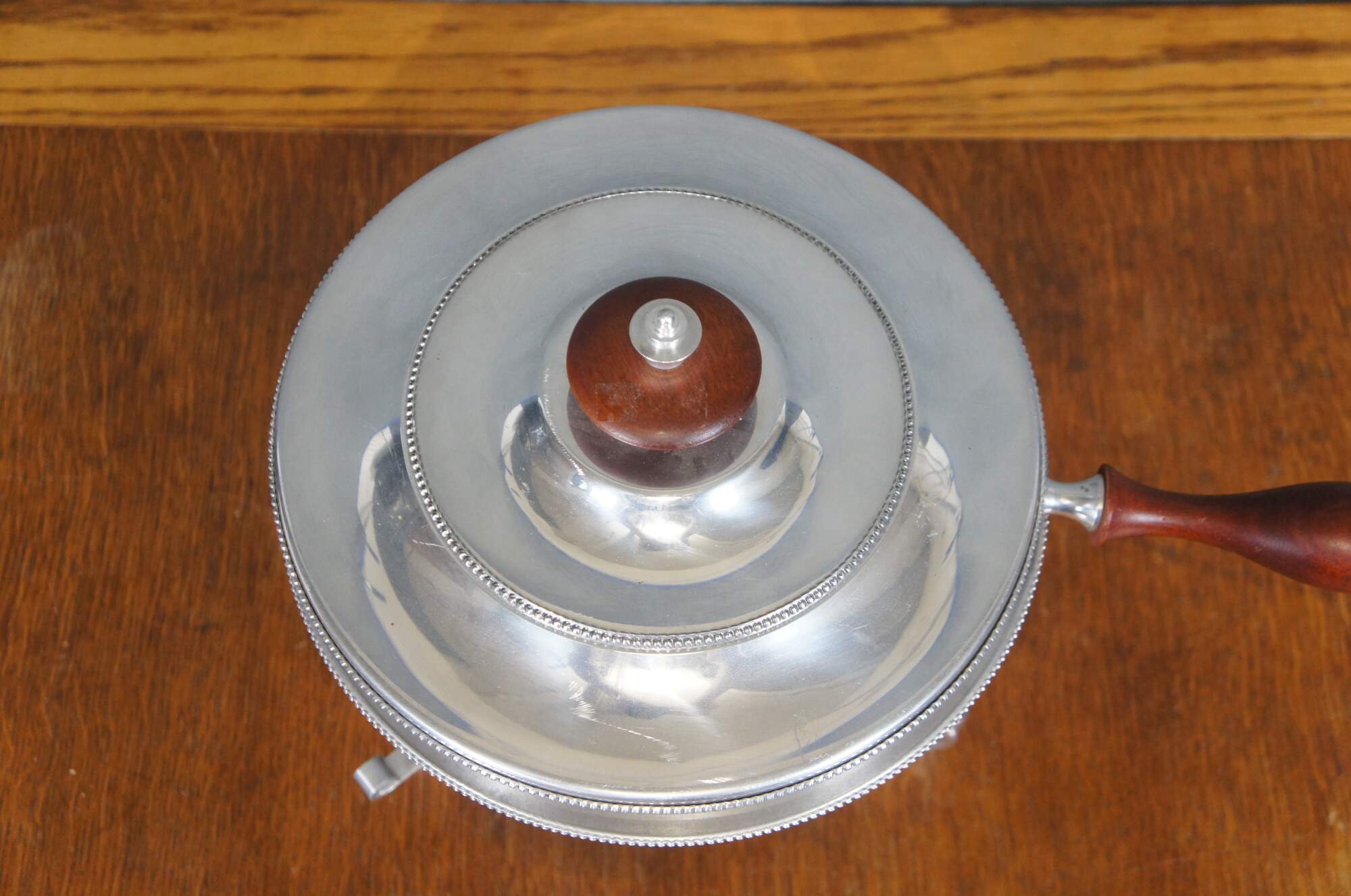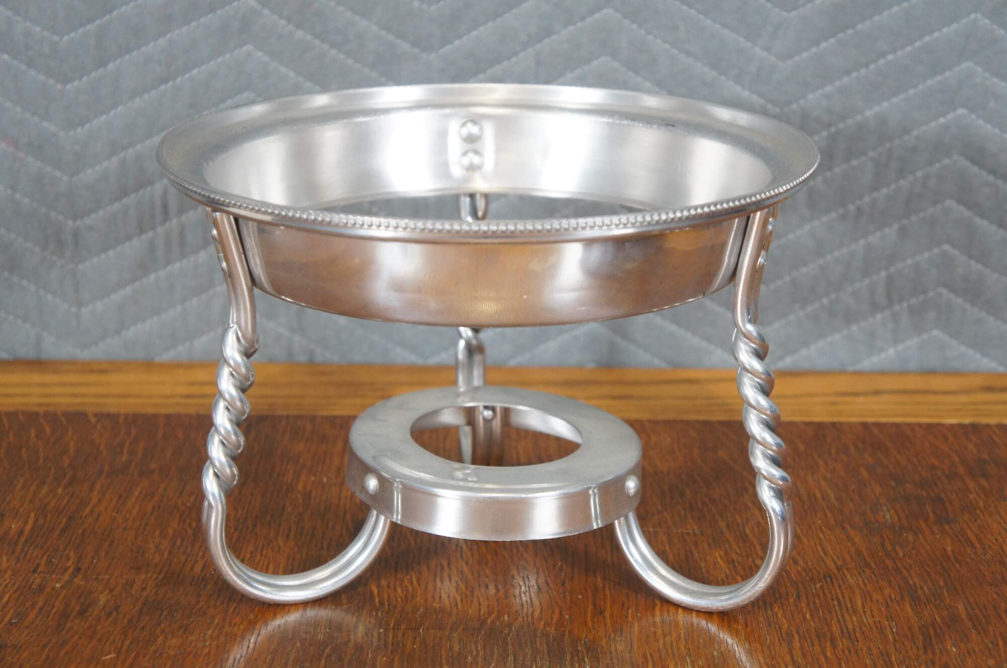 Vintage seven piece mid 20th century Buenilum hammered aluminum chafing dish set including: chafing stand with burner; double boiler pot with lid and wood handles; and low footed pan with wood insert / trivet and handle.