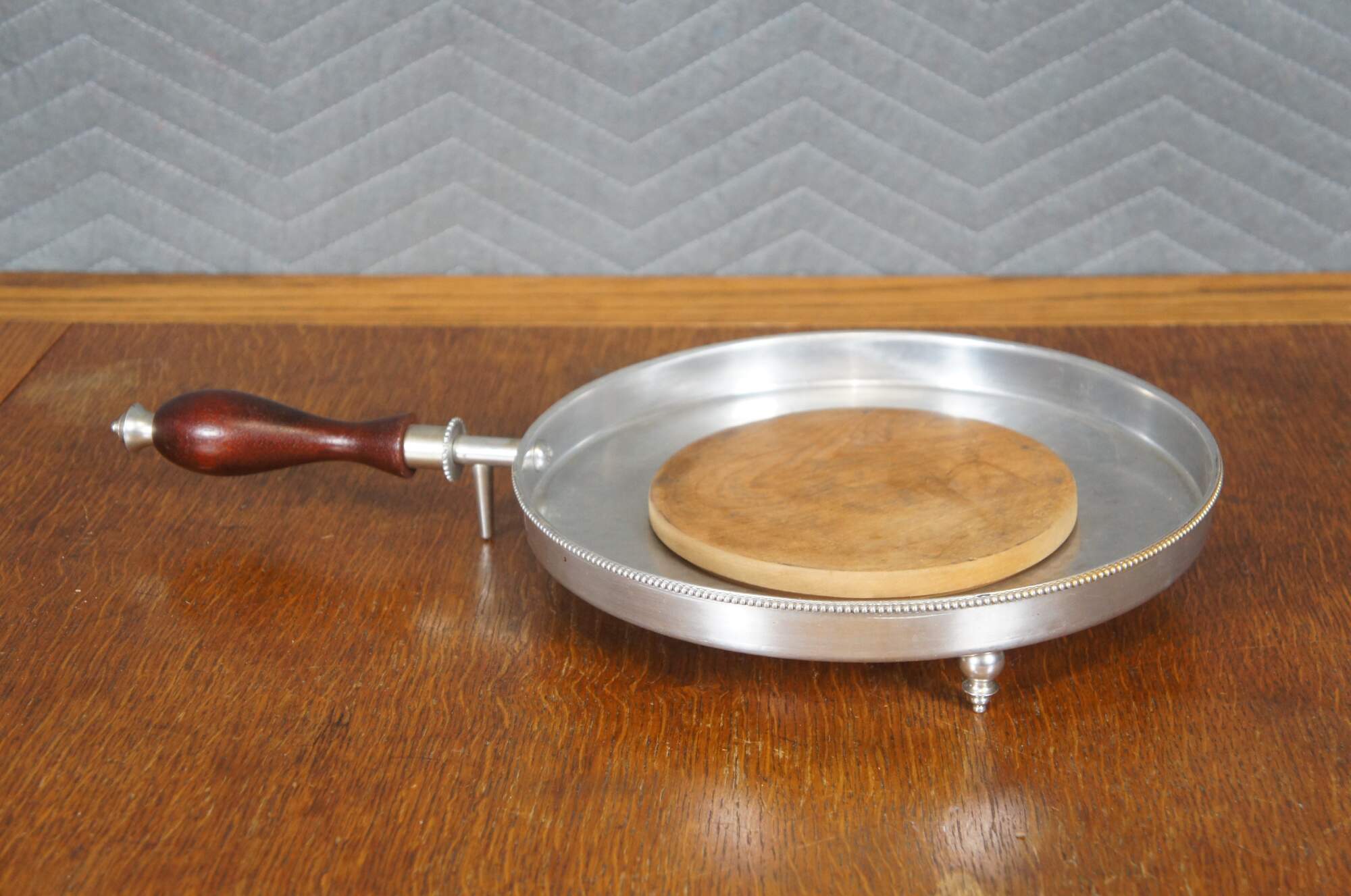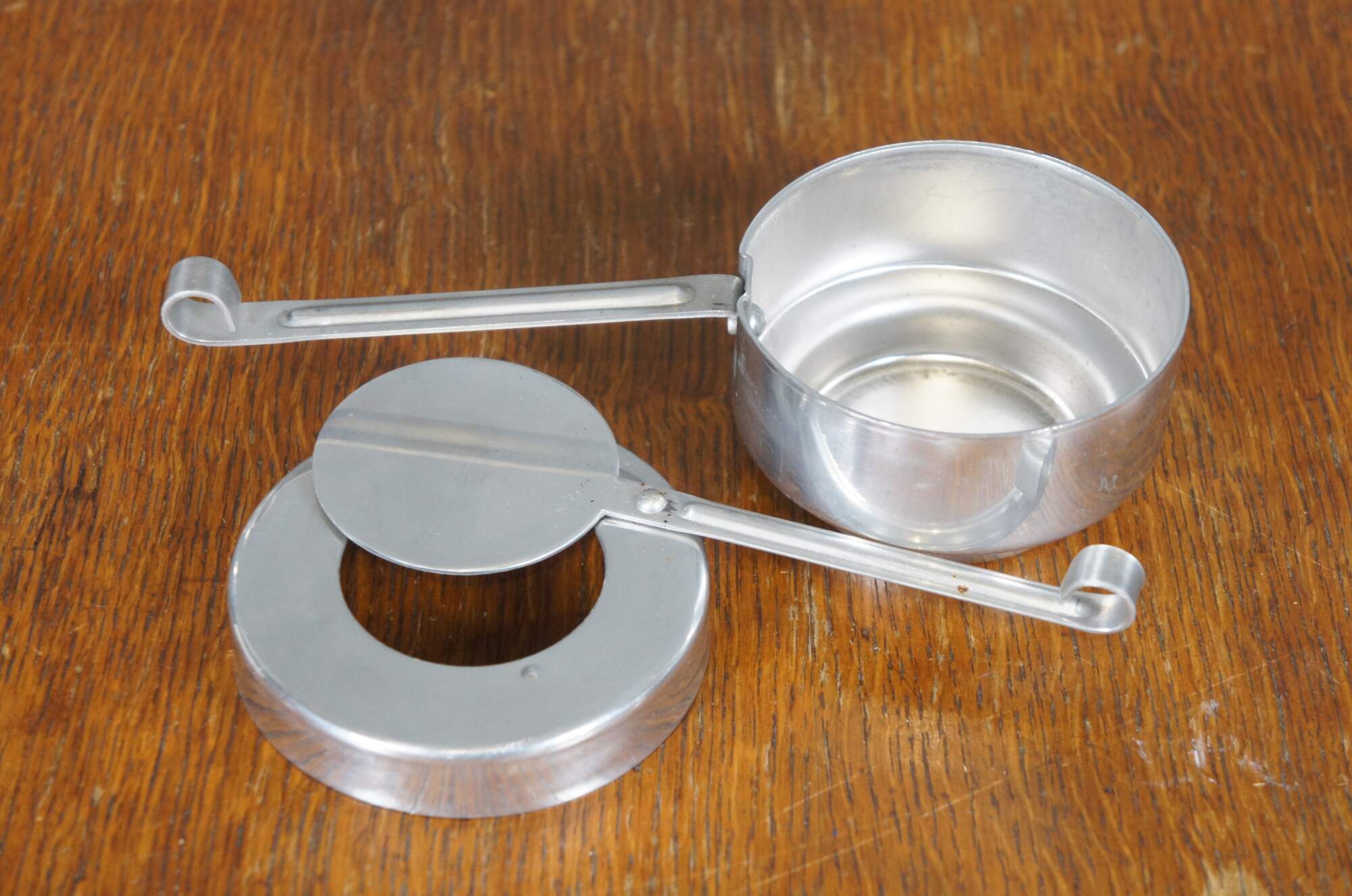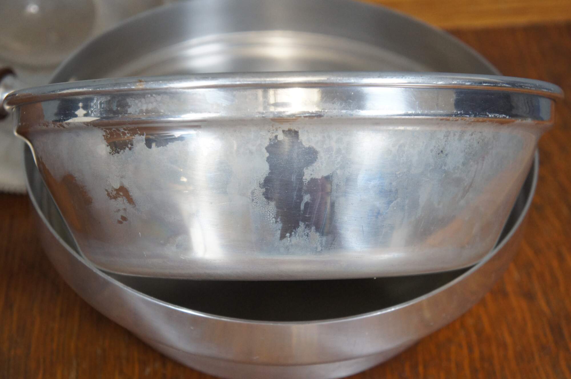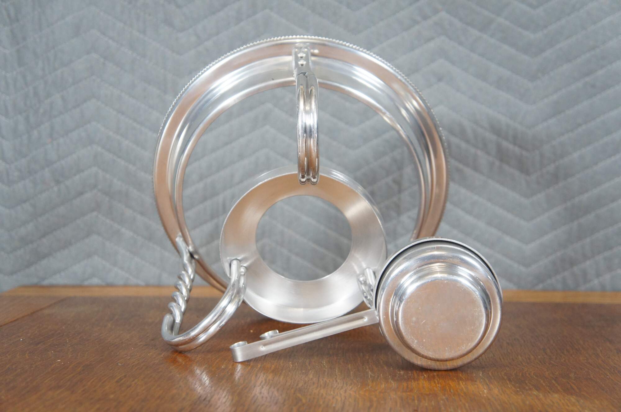 Vintage seven piece mid 20th century Buenilum hammered aluminum chafing dish set including: chafing stand with burner; double boiler pot with lid and wood handles; and low footed pan with wood insert / trivet and handle.
