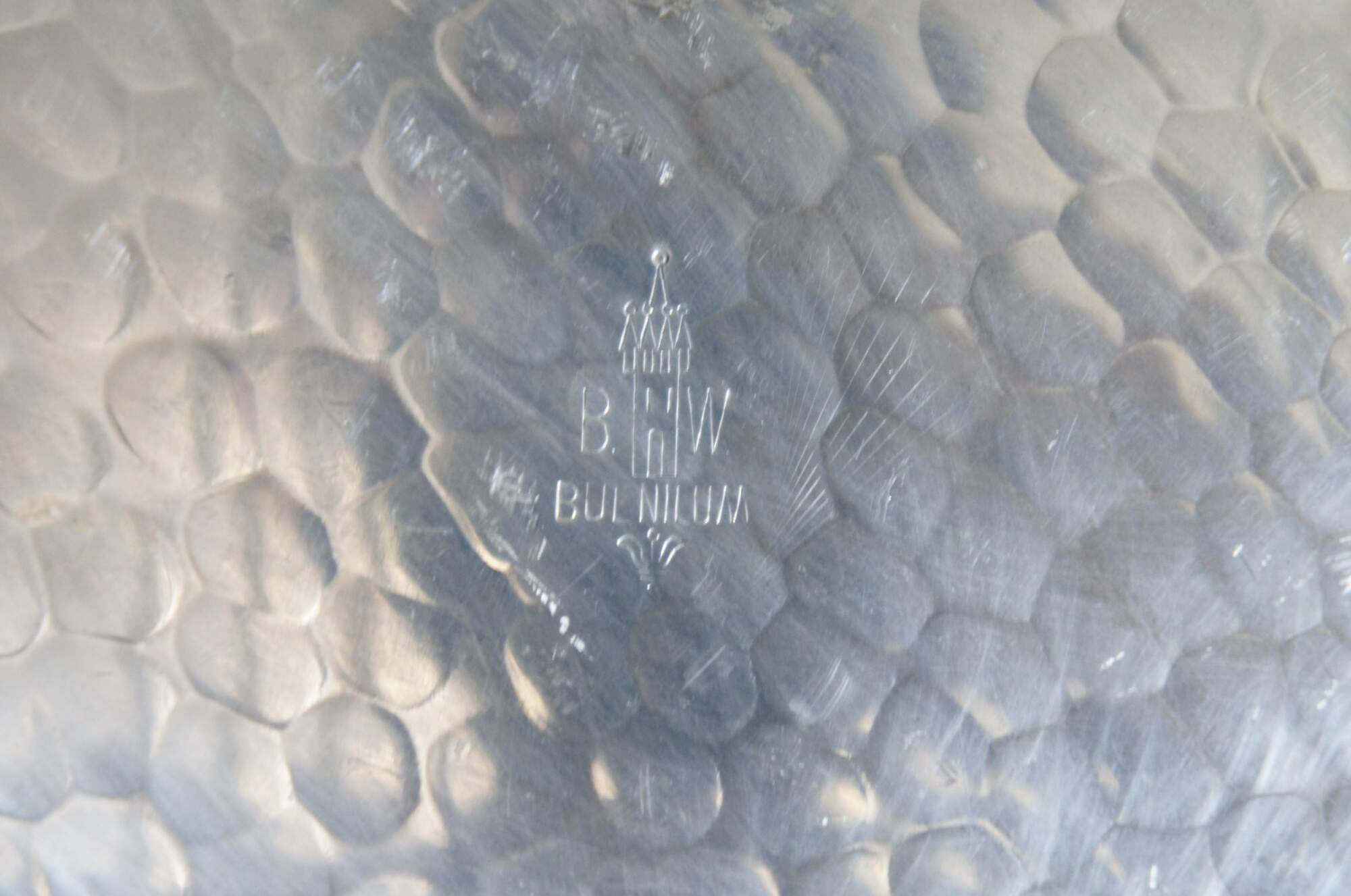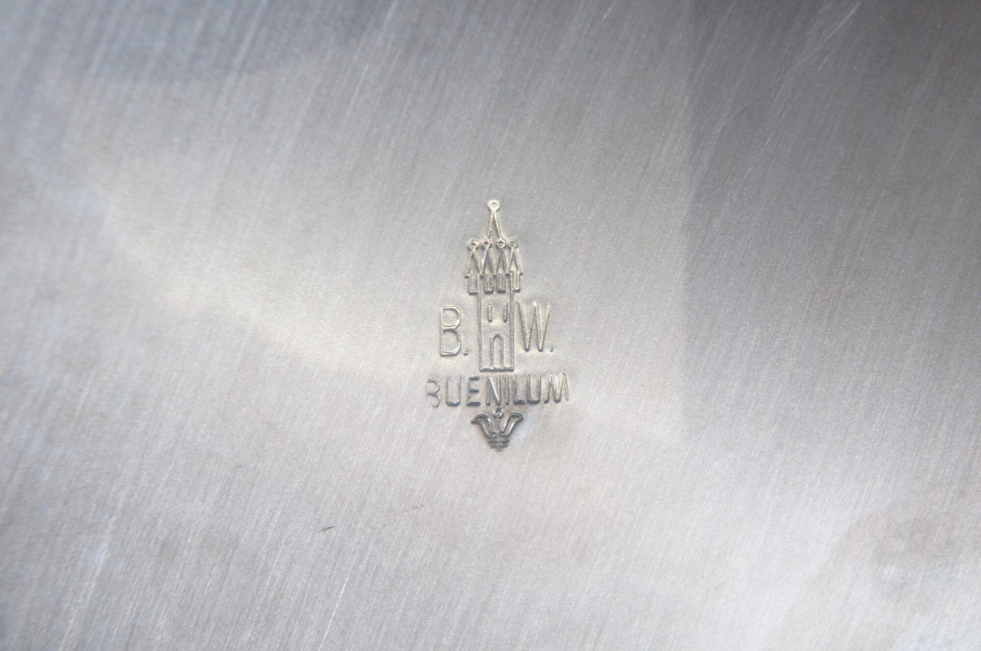 "The Buenilum Aluminum company was founded as Buehner-Wanner by metalsmith and industrial designer Frederick Buehner and his business partner, Franz Wanner, in Norwalk, Conn. in 1944. Buehner emigrated from Germany to the United States in 1929. He developed a unique formula for using hammered aluminum, which he trademarked in 1933 as Buenilum, a cross between Buehner and aluminum. The Buehner-Wanner company produced Buenilum pieces throughout the 1930s, ’40s, ’50s and ’60s, making mid-century modern decorative, kitchenware and food service items such as serving trays, lazy Susans, relish dishes, bowls, pots and pans. The company was sold to the Pfaltzgraff company in 1969, which continued to make Buenilum pieces until closing the line in 1979. Frederick Buehner was born in 1908 and died in 1971. Before coming to America, Buehner studied at the Deutscher Werkbund, or Work Federation, a German association of craftsmen, artists, architects and industrial designers, under the influential architect, furniture designer and cartoonist Bruno Paul. Vintage hammered Buenilum pieces with the initials BW flanking an image of a castle turret on the back, along with an imprint of the name Buenilum, are considered valuable antiques as of 2014. They are known for their workmanship and design; some are even found in museums." (Source: Reference)