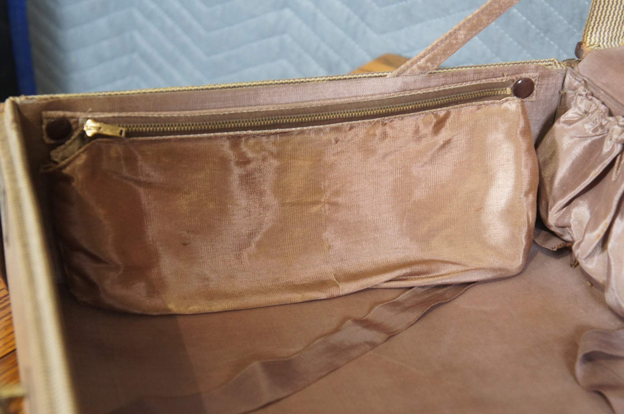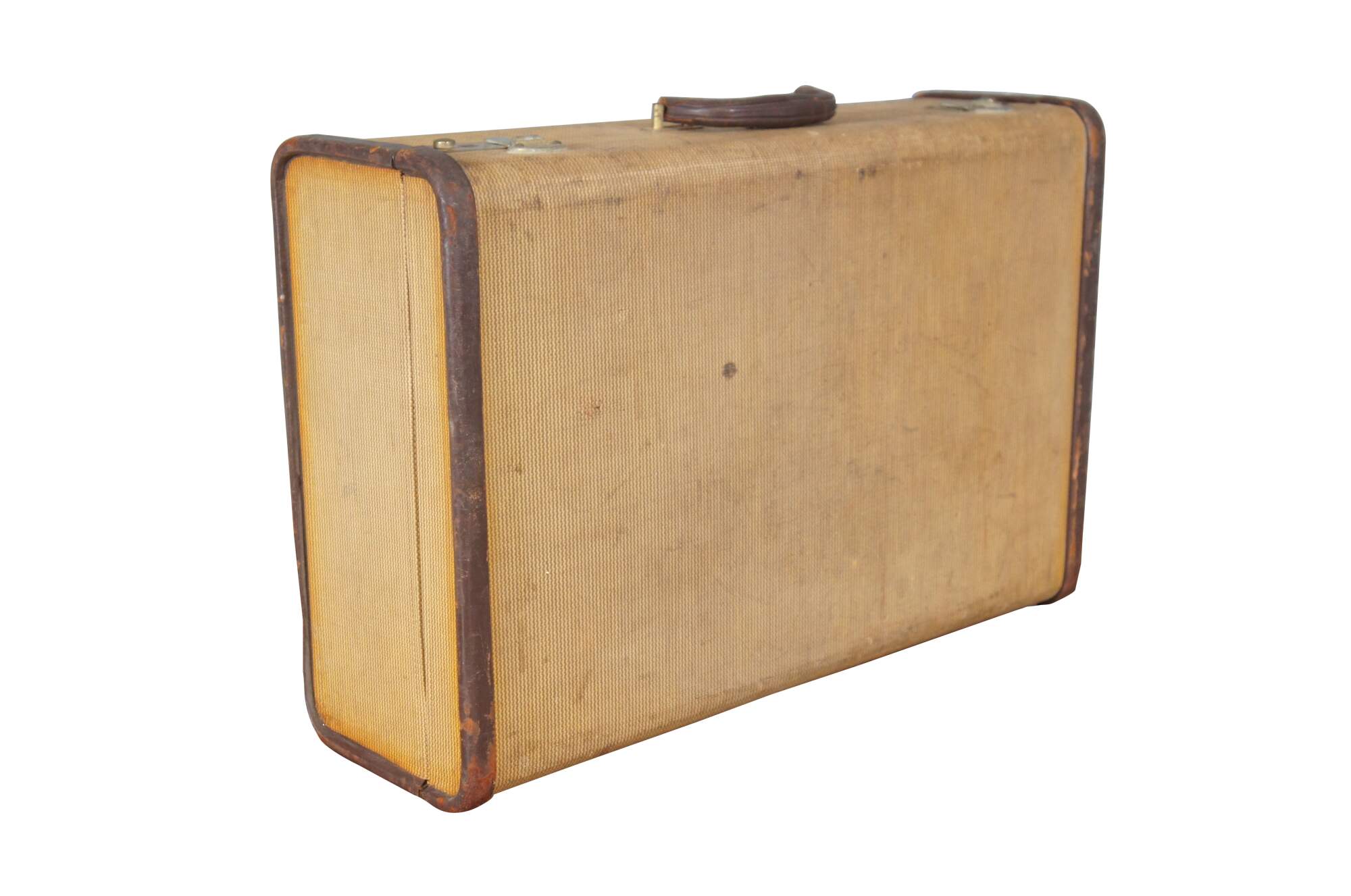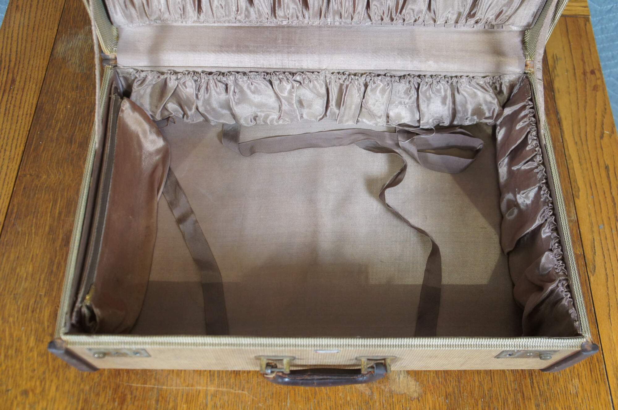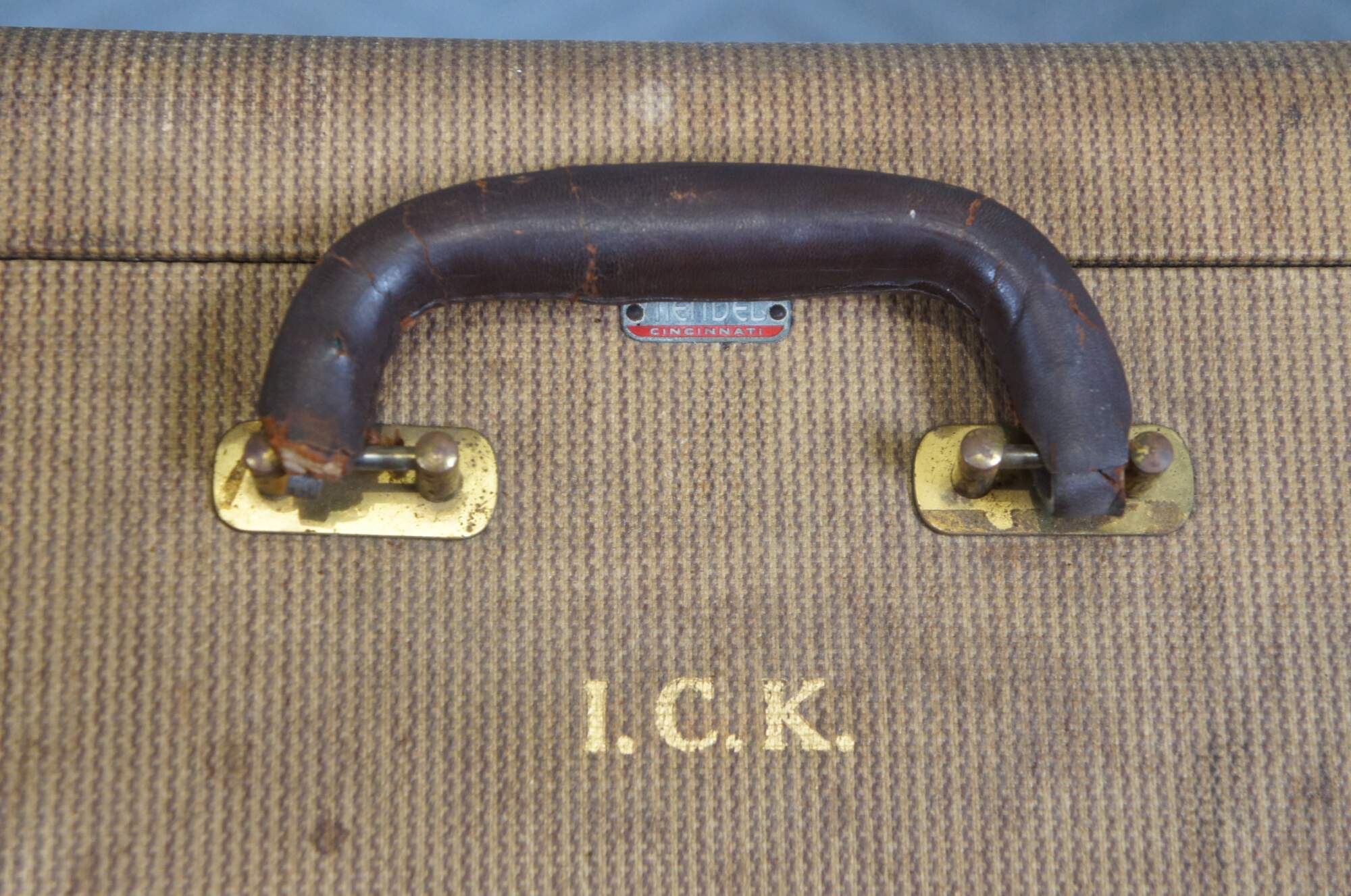 Early to mid 20th century hard sided suitcase by the Mendel Company of Cincinnati, Ohio. Light brown with dark brown leather trim and handle. Two lockable sliding latches (no key). Stamped with the initials / monogram I.C.K. in gold. Beige satin lining with two elasticized pockets in the lid and two sides of the base, plus one zippered pocket in the base.