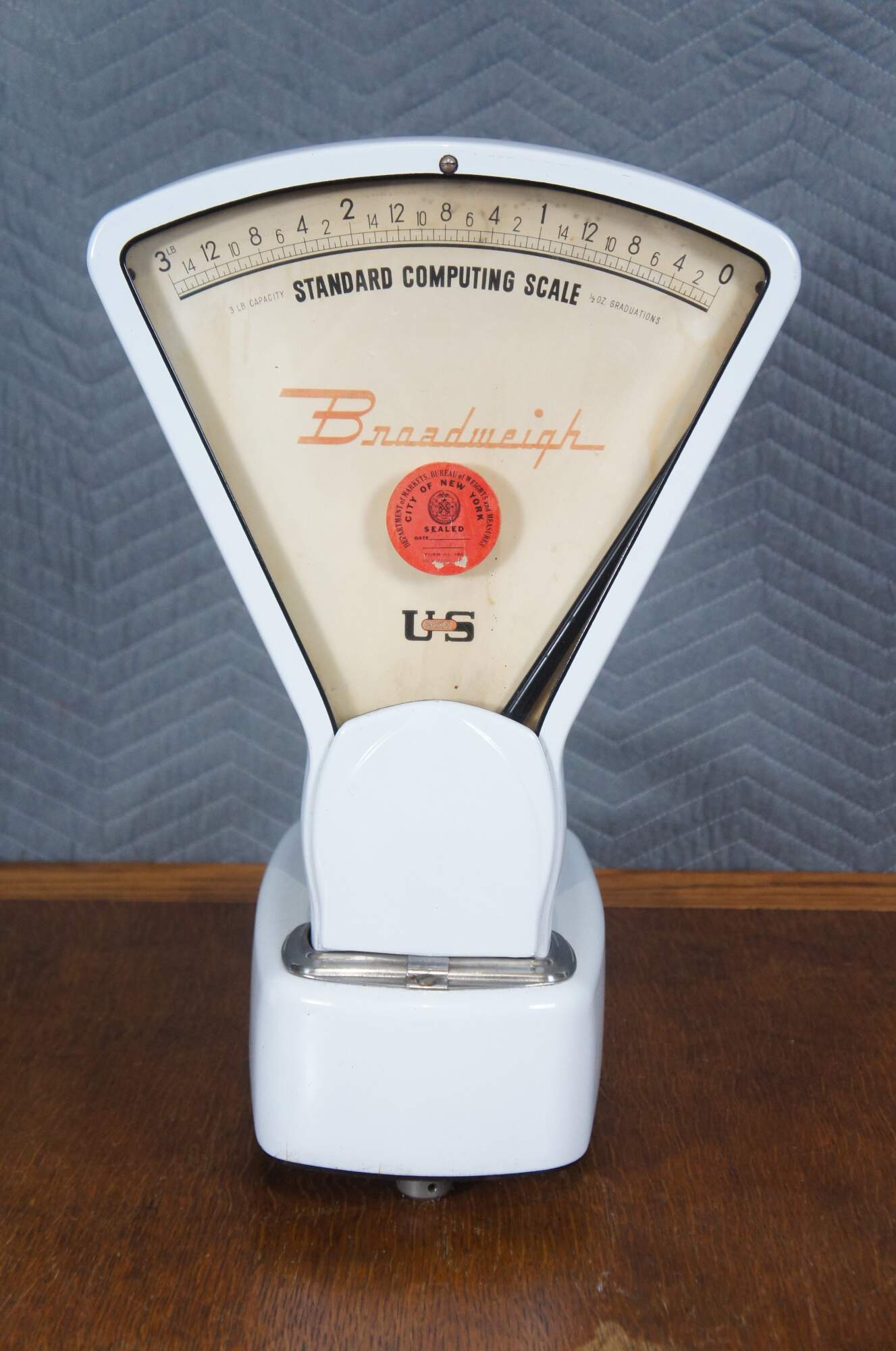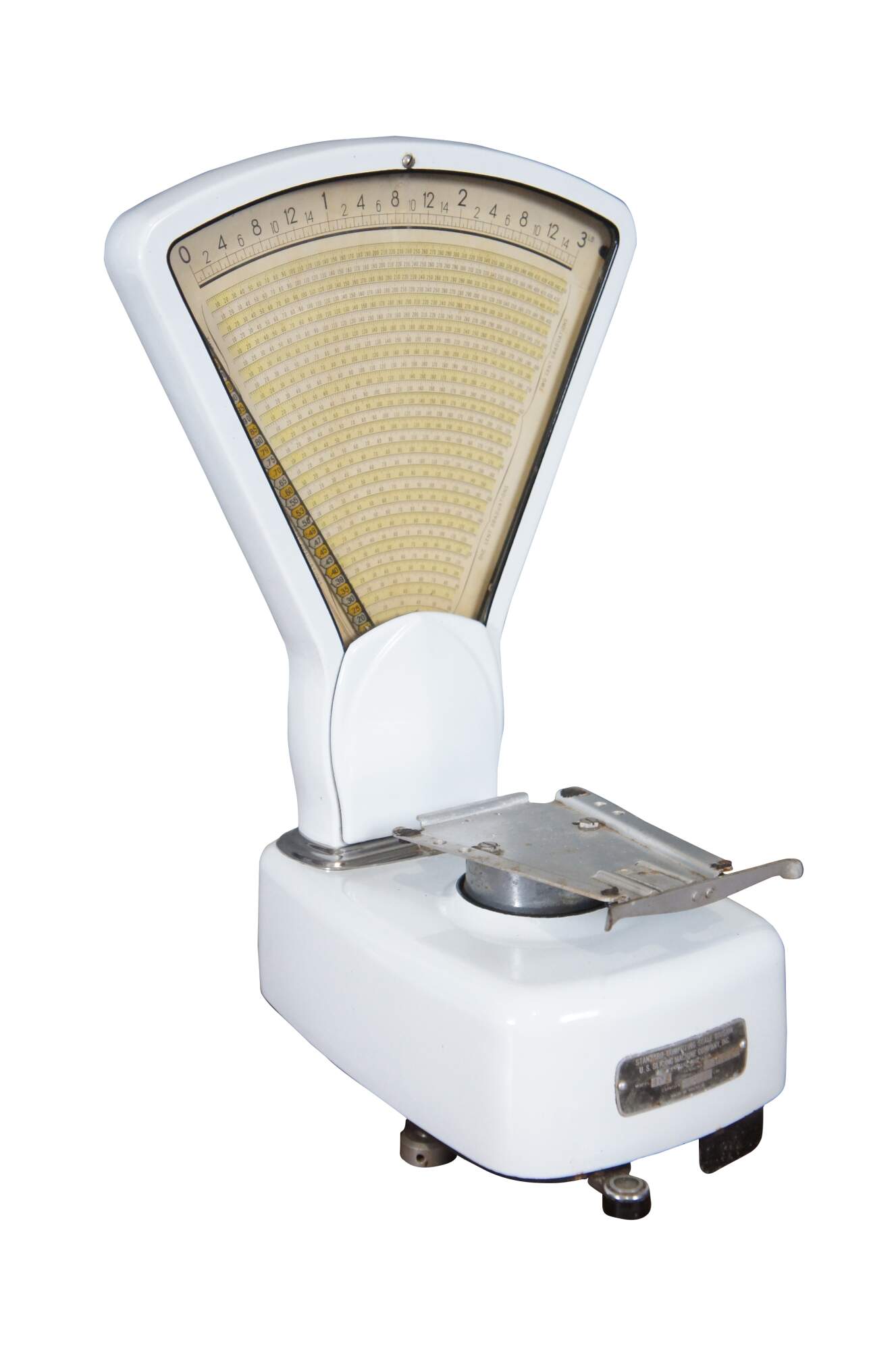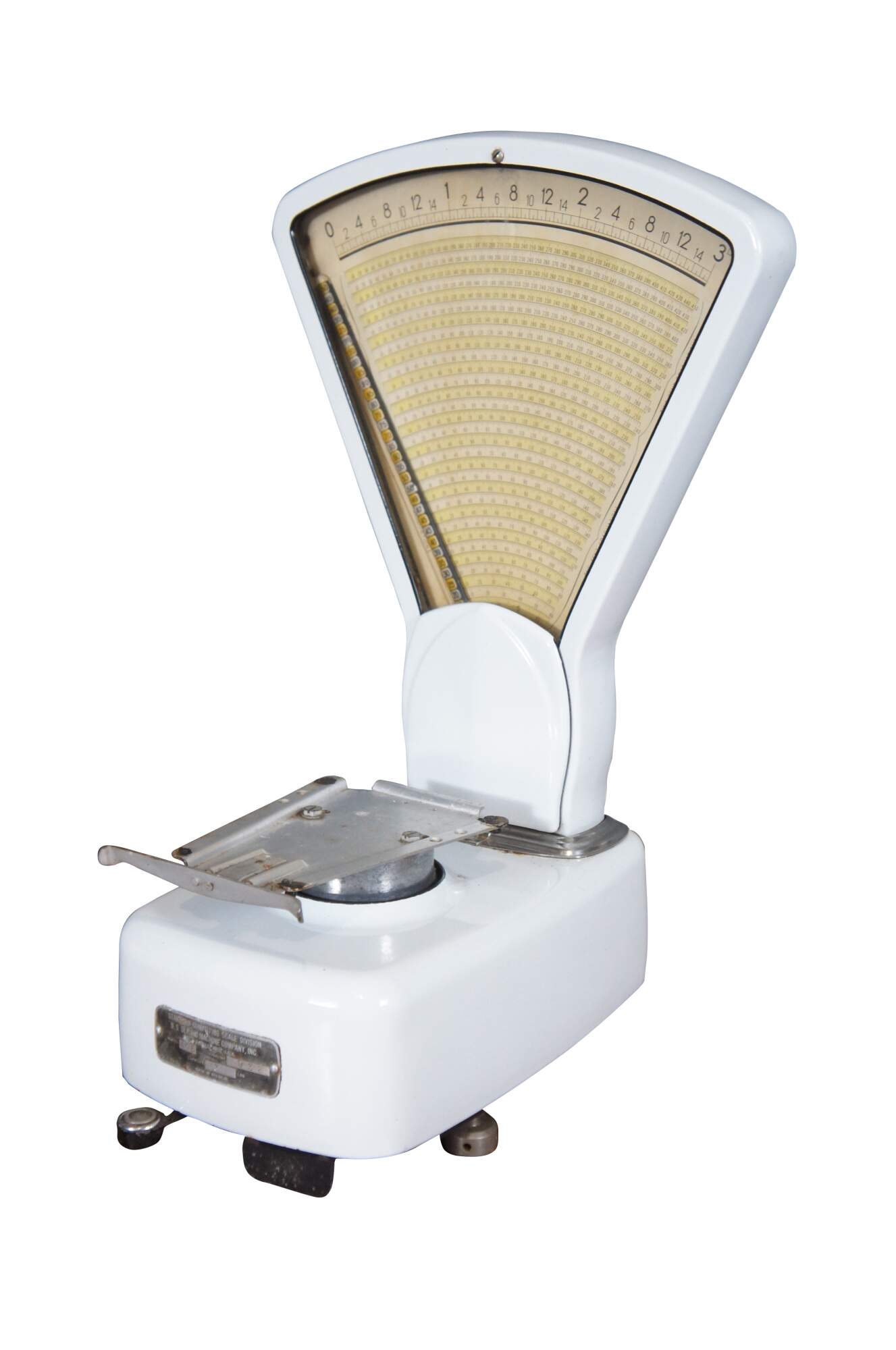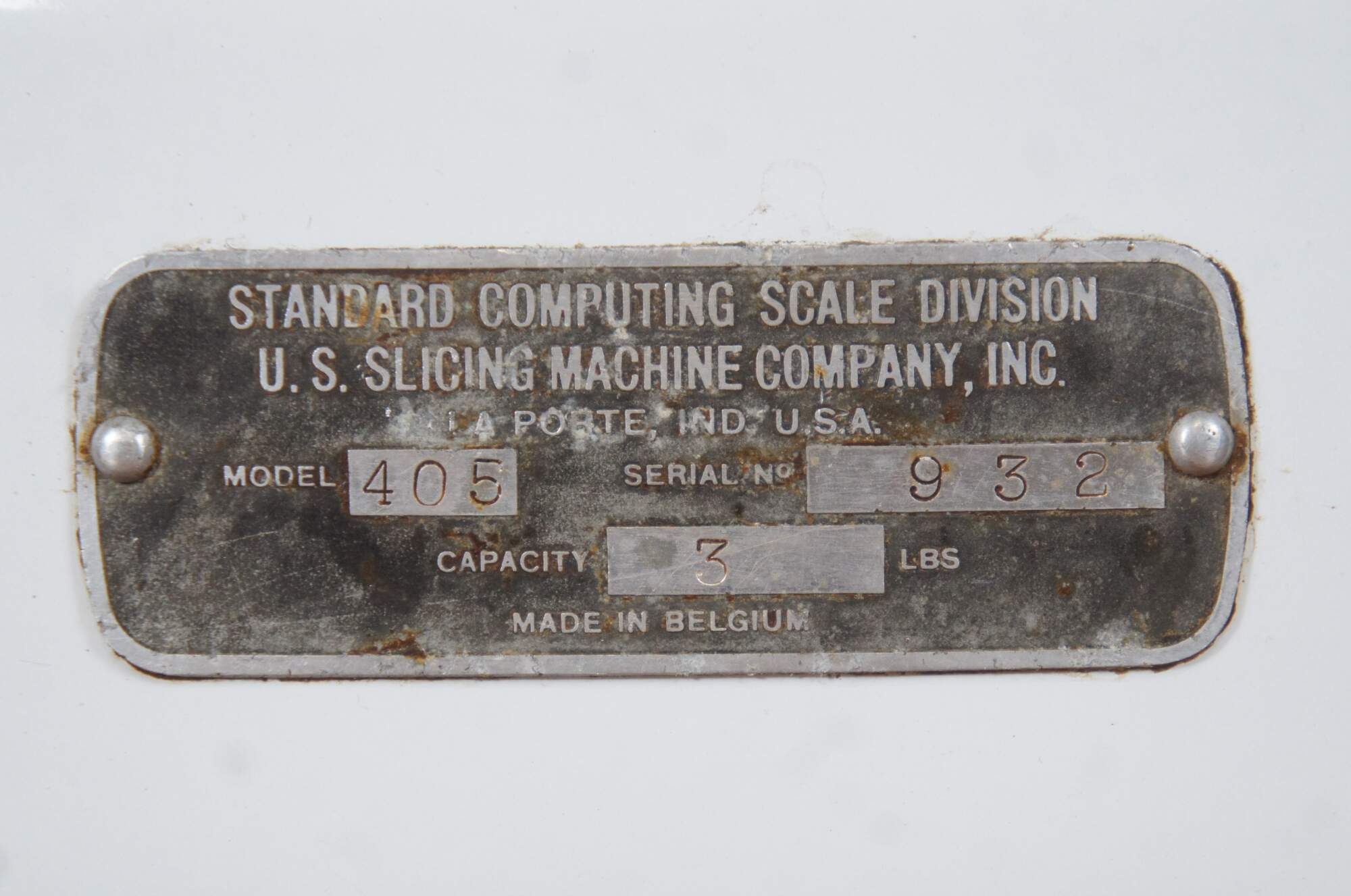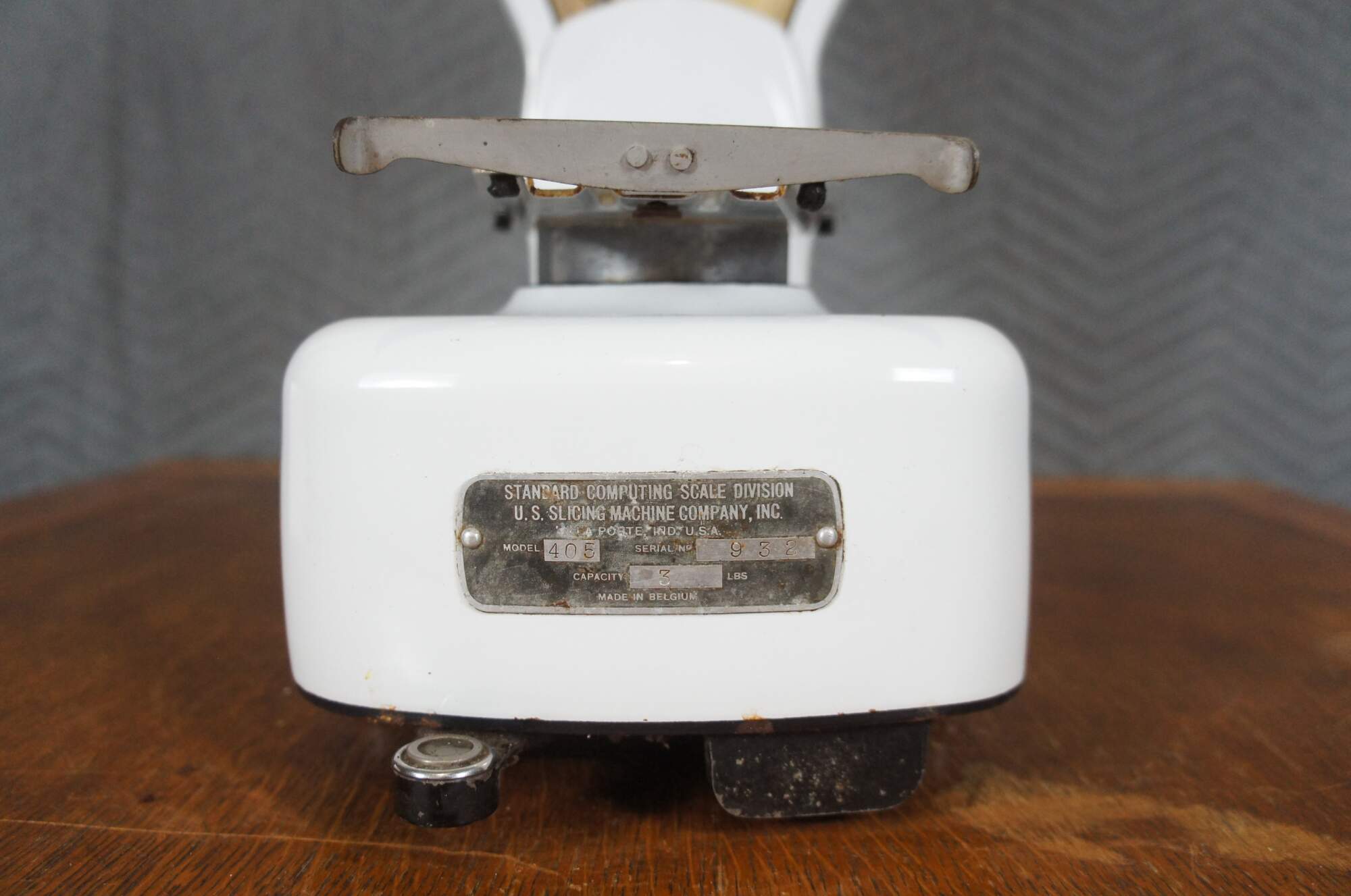 Mid to early 20th century US Berkel Broadweigh Standard Computing Scale. White enameled iron with fan-shaped visual scale with 3 lbs capacity divided into 1/2 oz graduations. Standard Computing Scale Division - U.S. Slicing Machine Company Inc - La Porte, Ind., USA - Model 405 - Serial No. 932 - Capacity 3 lbs - Made in Belgium.