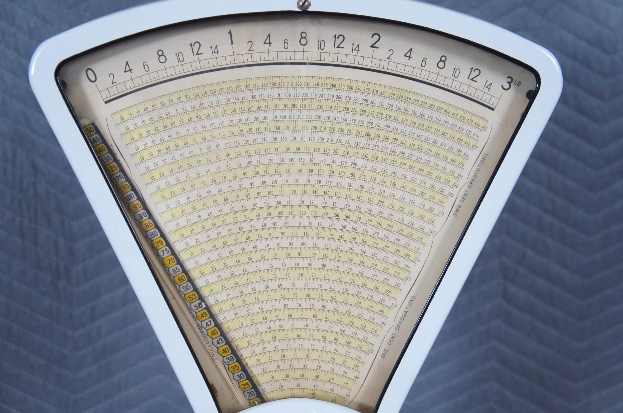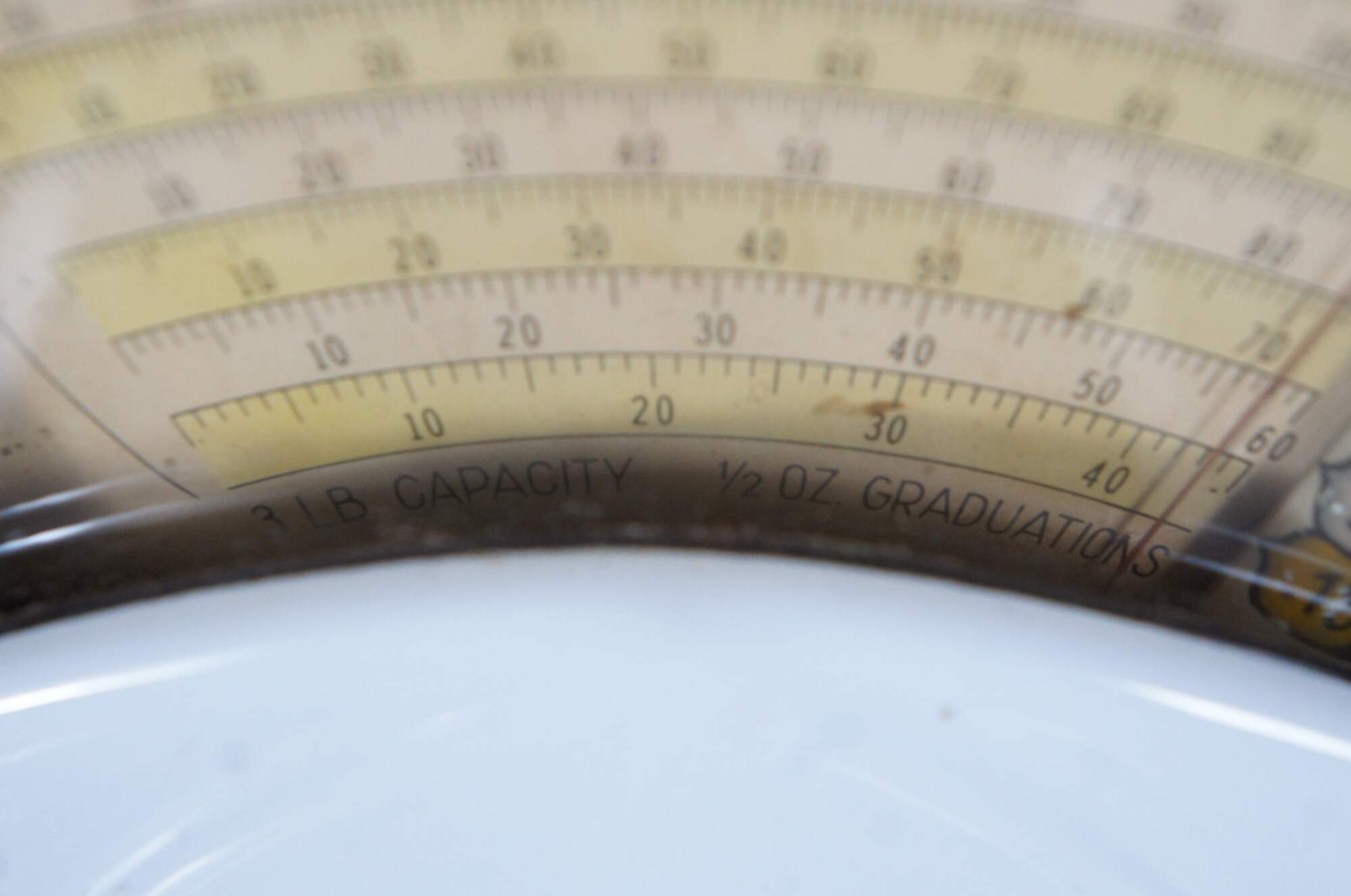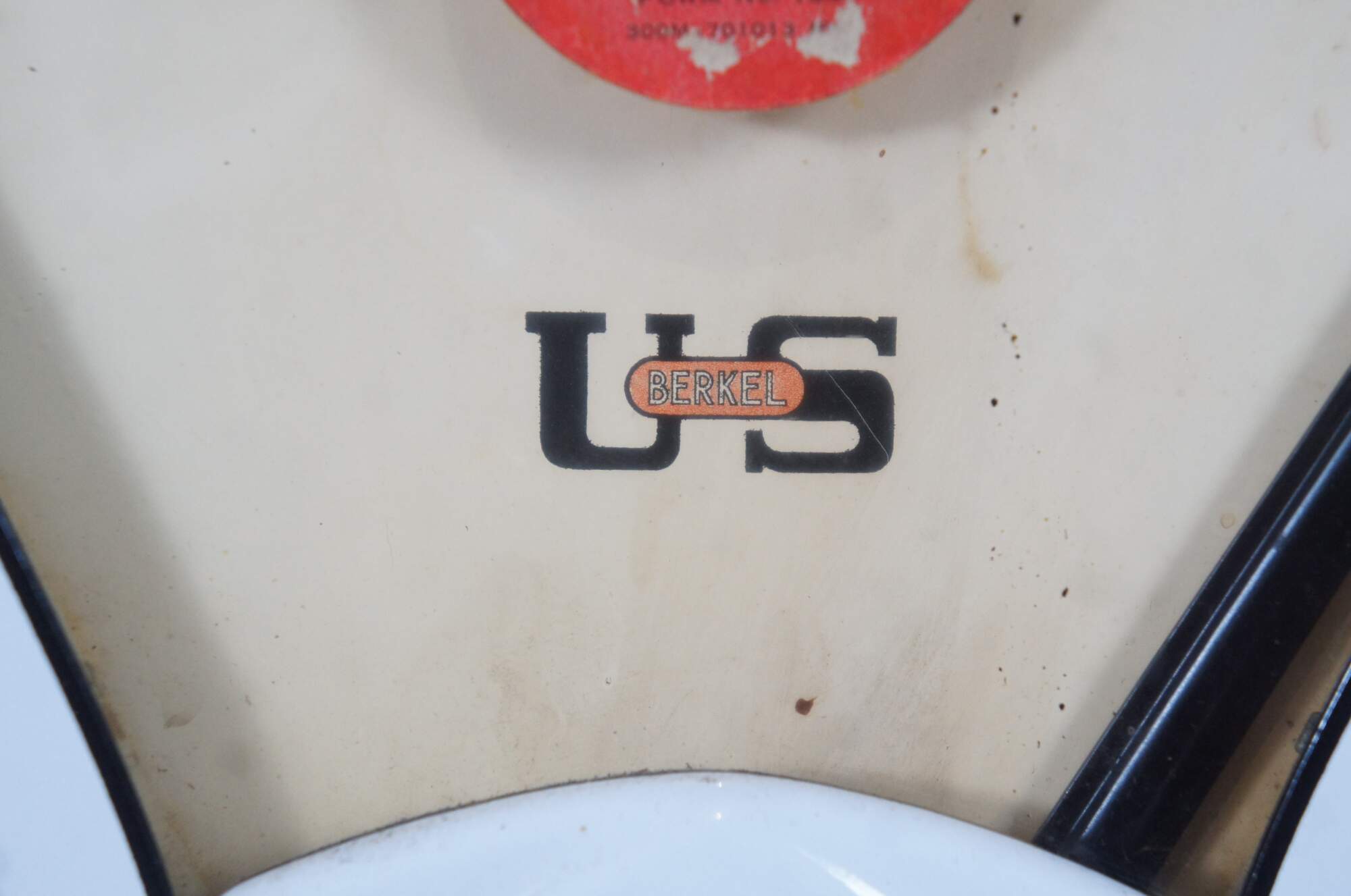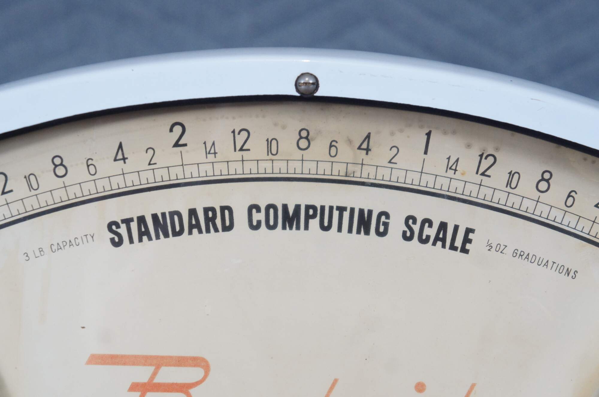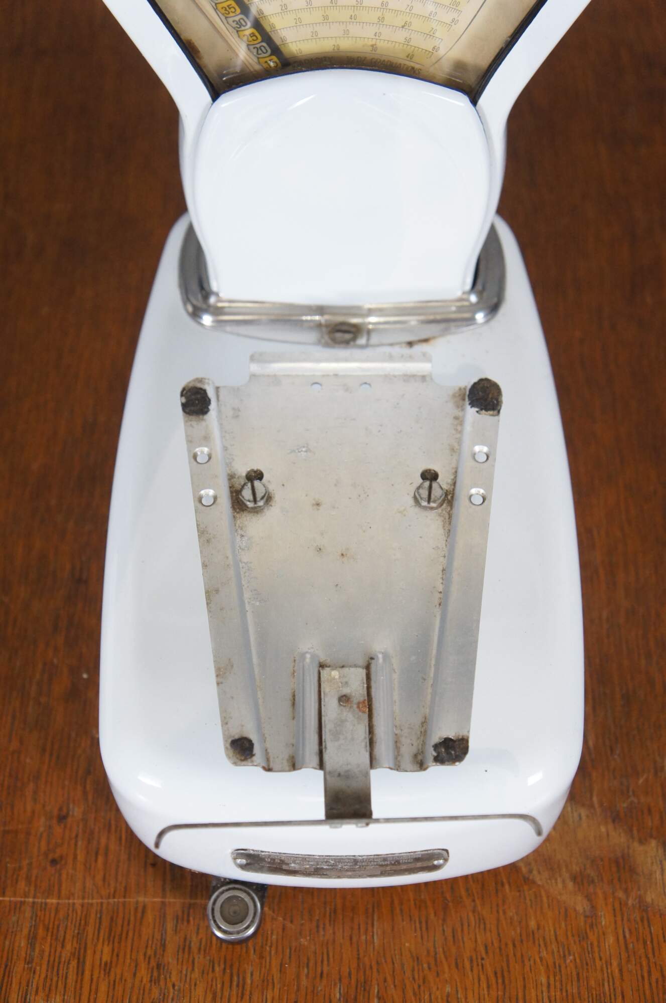 Mid to early 20th century US Berkel Broadweigh Standard Computing Scale. White enameled iron with fan-shaped visual scale with 3 lbs capacity divided into 1/2 oz graduations. Standard Computing Scale Division - U.S. Slicing Machine Company Inc - La Porte, Ind., USA - Model 405 - Serial No. 932 - Capacity 3 lbs - Made in Belgium.