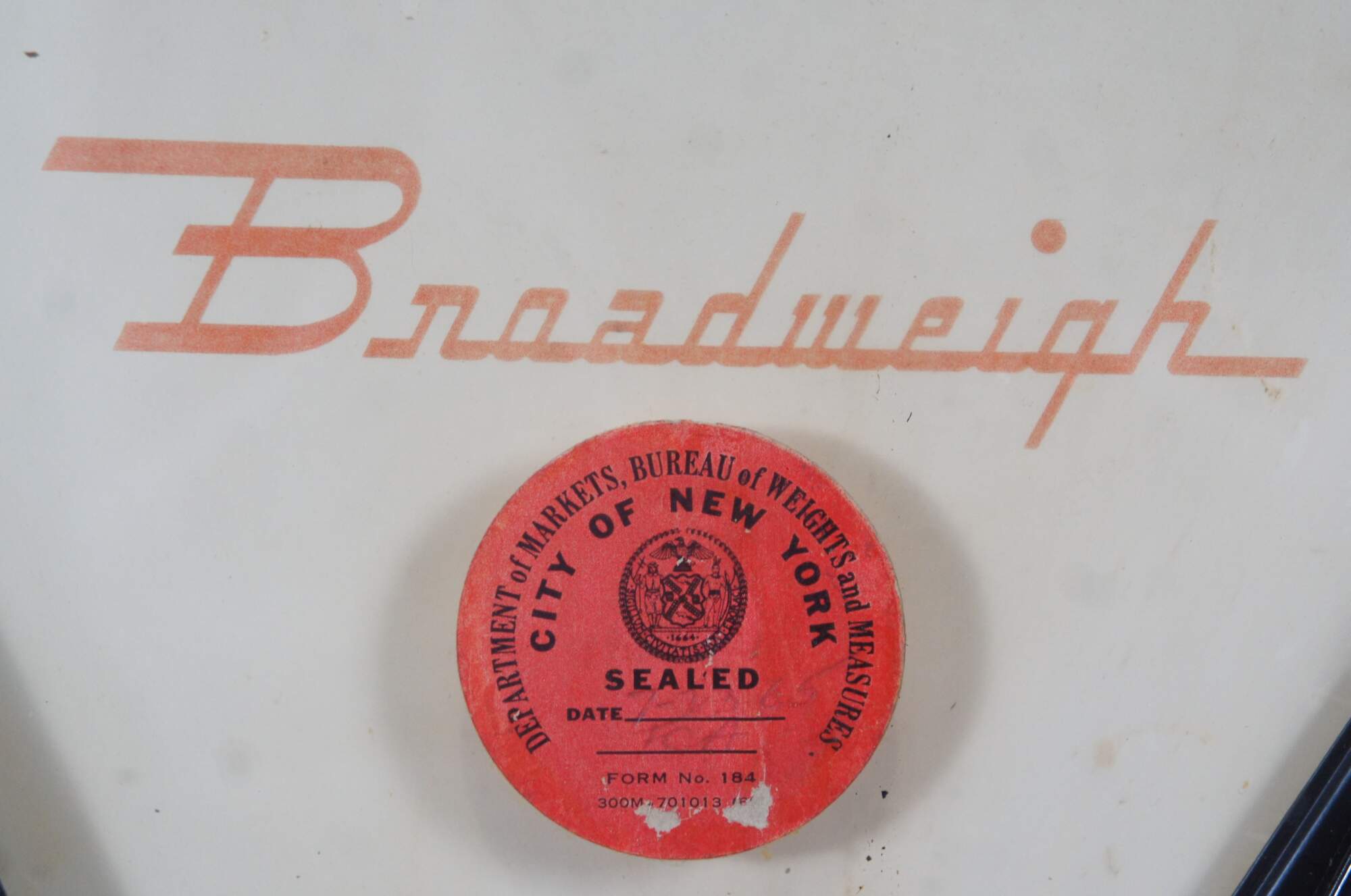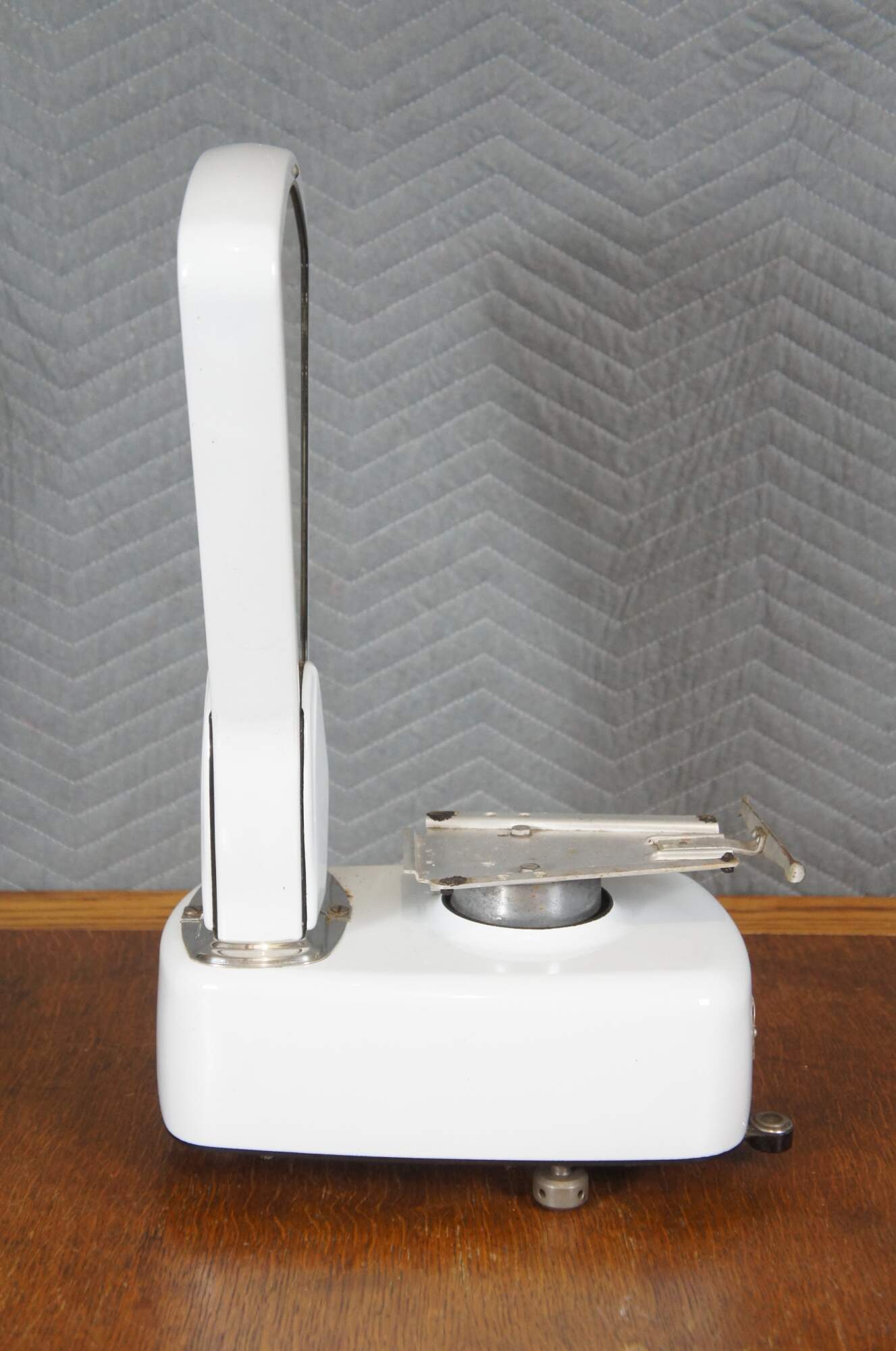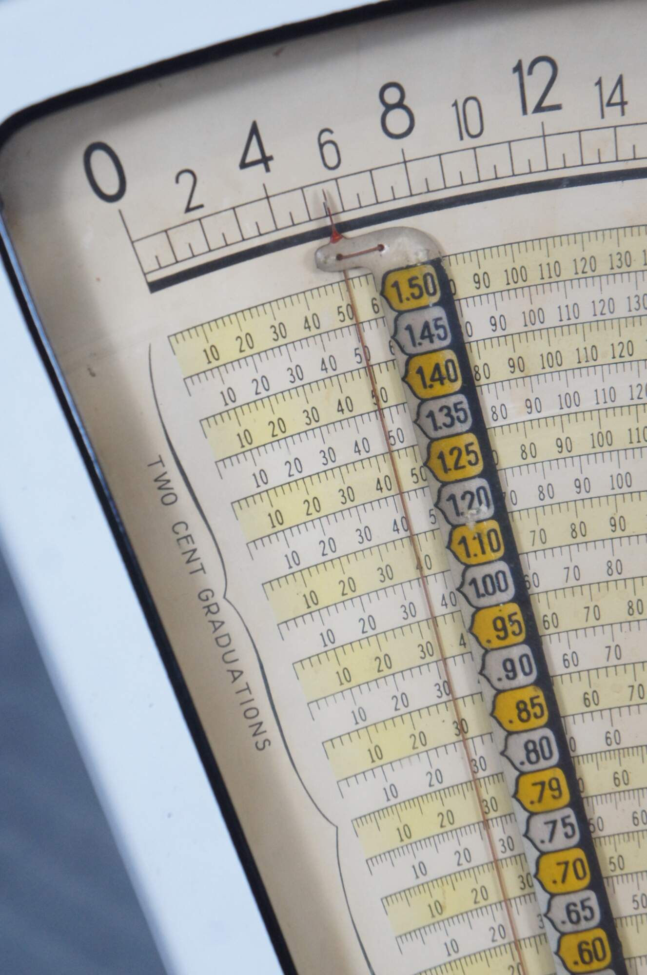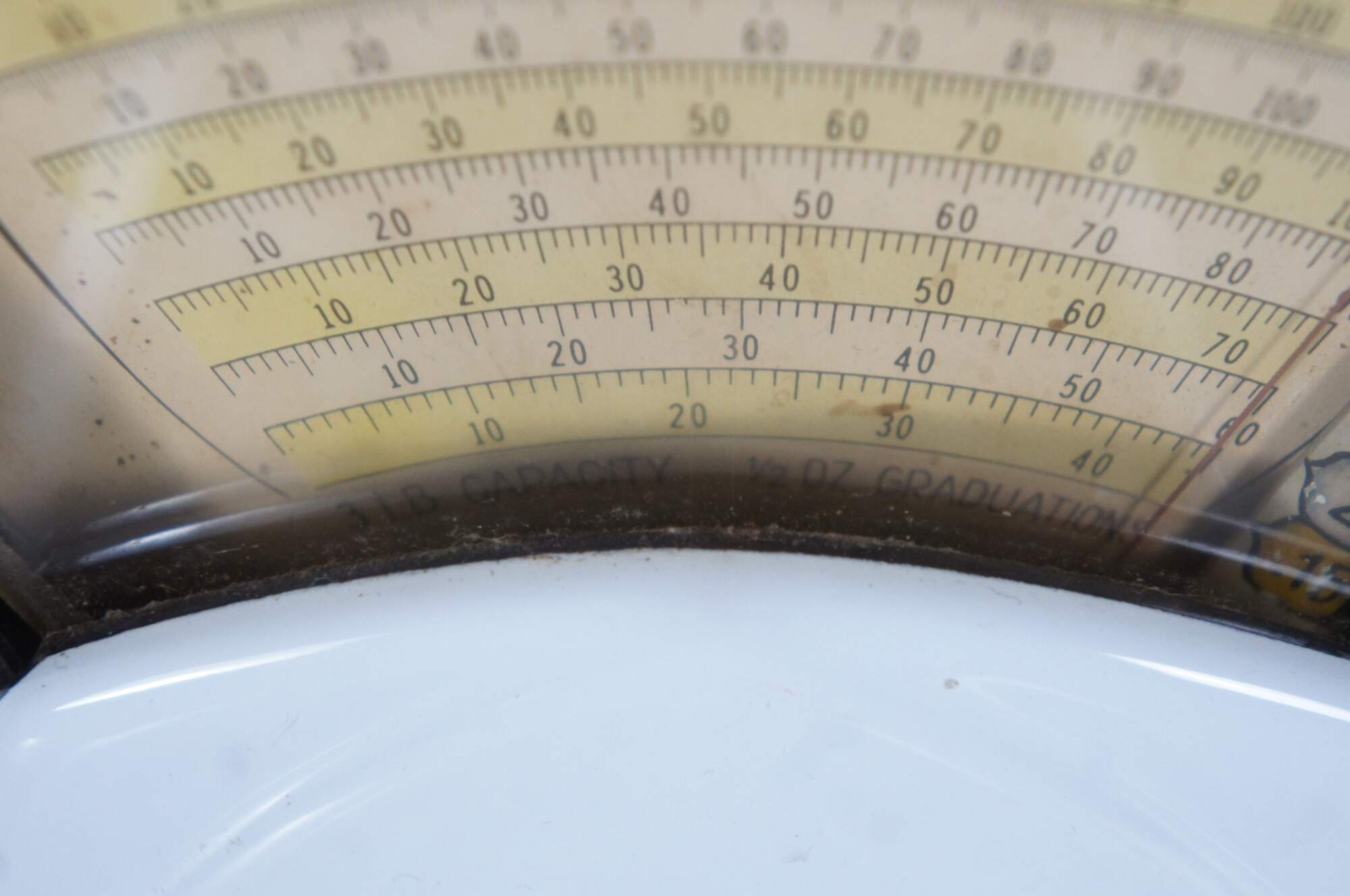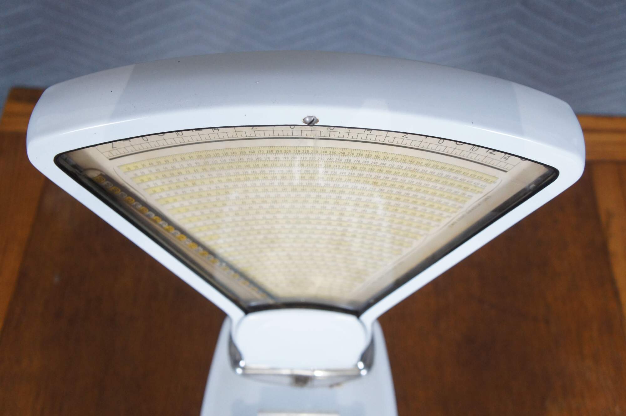 Mid to early 20th century US Berkel Broadweigh Standard Computing Scale. White enameled iron with fan-shaped visual scale with 3 lbs capacity divided into 1/2 oz graduations. Standard Computing Scale Division - U.S. Slicing Machine Company Inc - La Porte, Ind., USA - Model 405 - Serial No. 932 - Capacity 3 lbs - Made in Belgium.