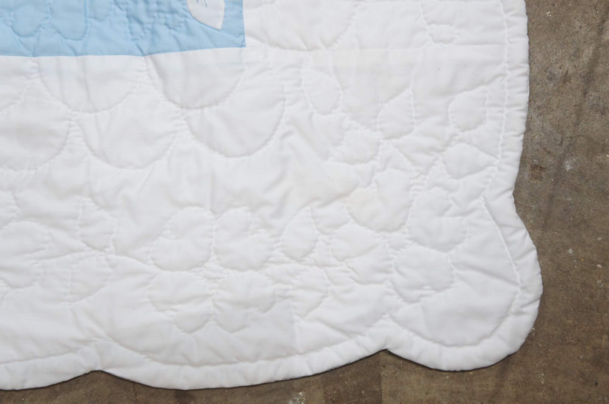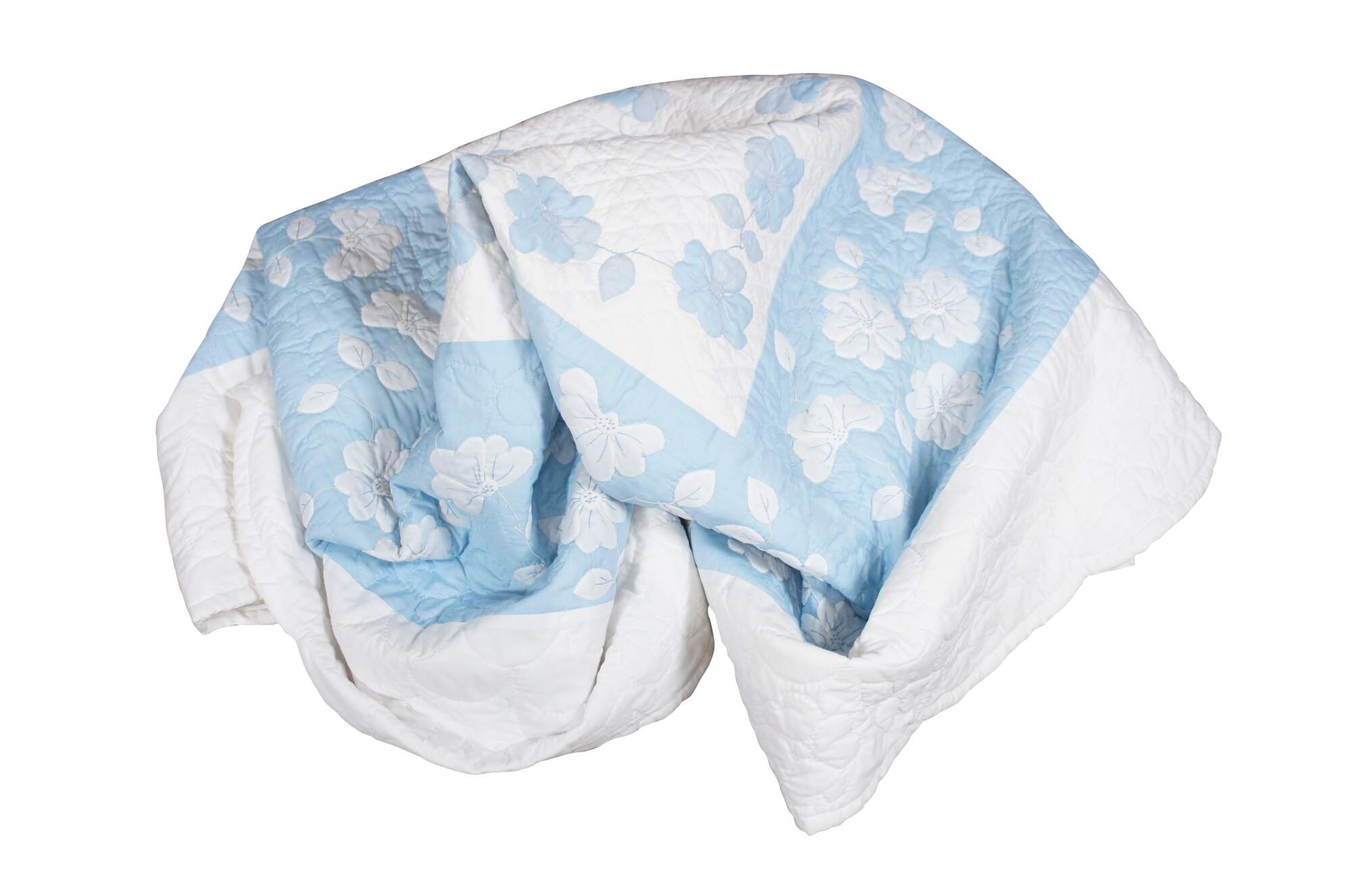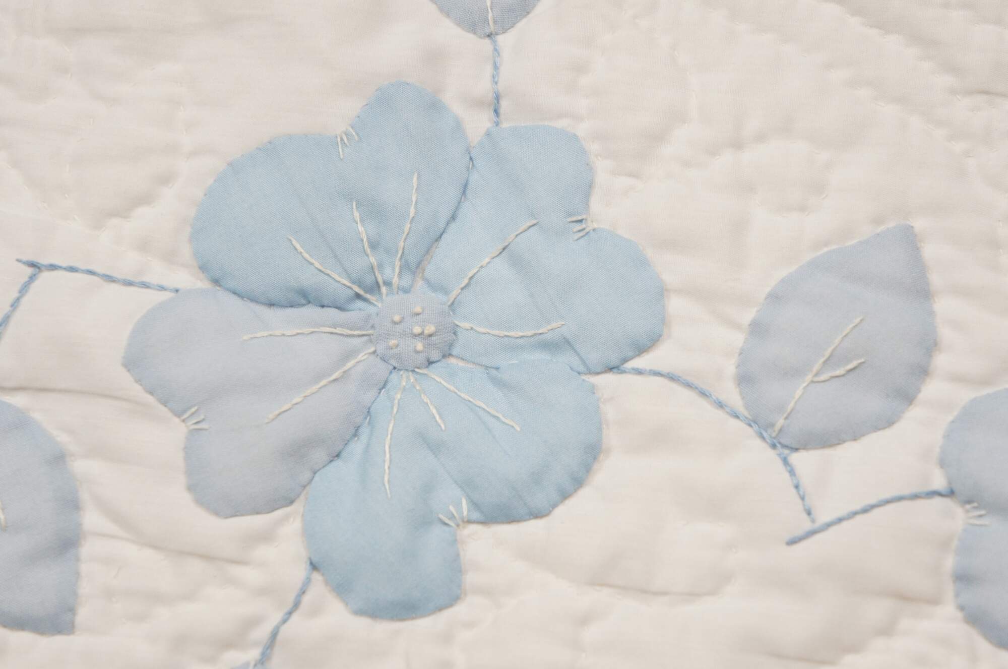 Pair of vintage 20th century blue and white cotton quilts / throw blankets / bedspreads , crafted from the Wedgwood Dogwood Blossom kit number 0119. Scalloped edge white and light blue blanket with applique dogwood blossoms, beautifully quilted with matching blossom shapes. Pale blue dots on the surface of the cotton showed the person using the kit where to quilt / embroider.