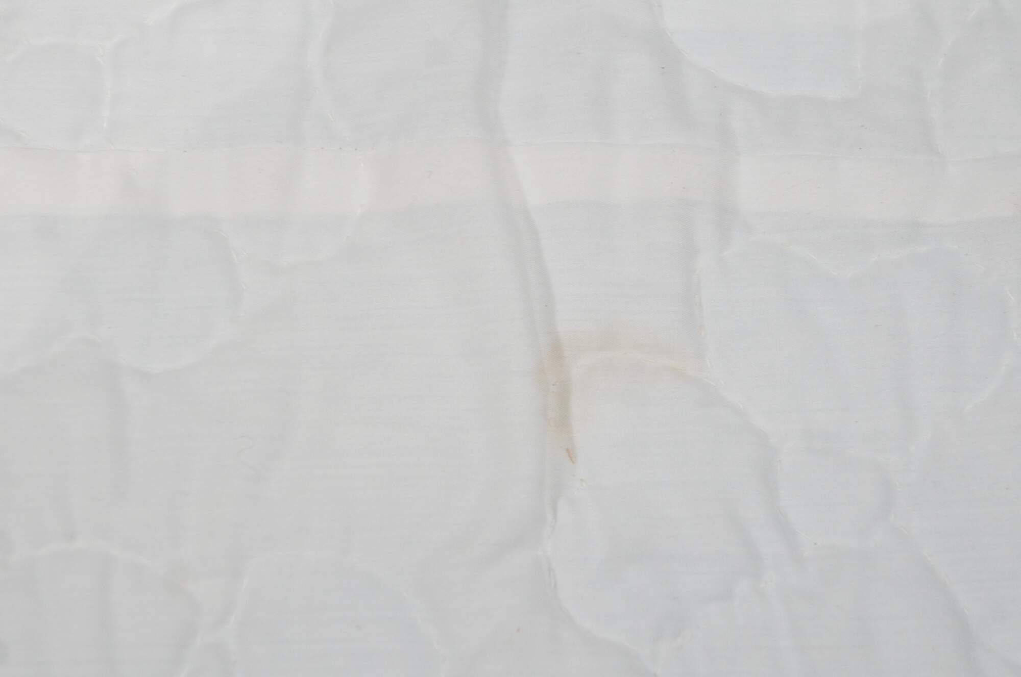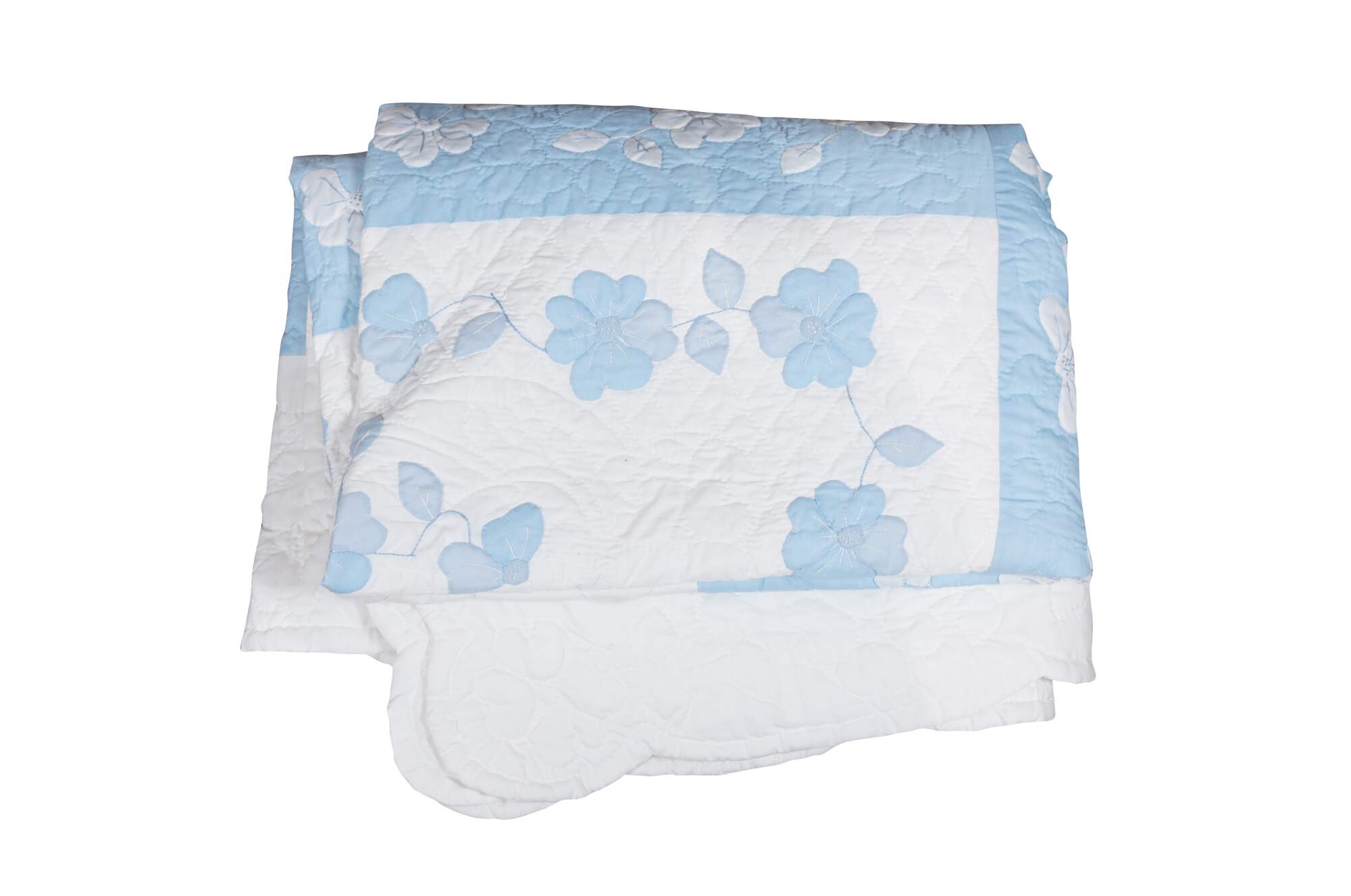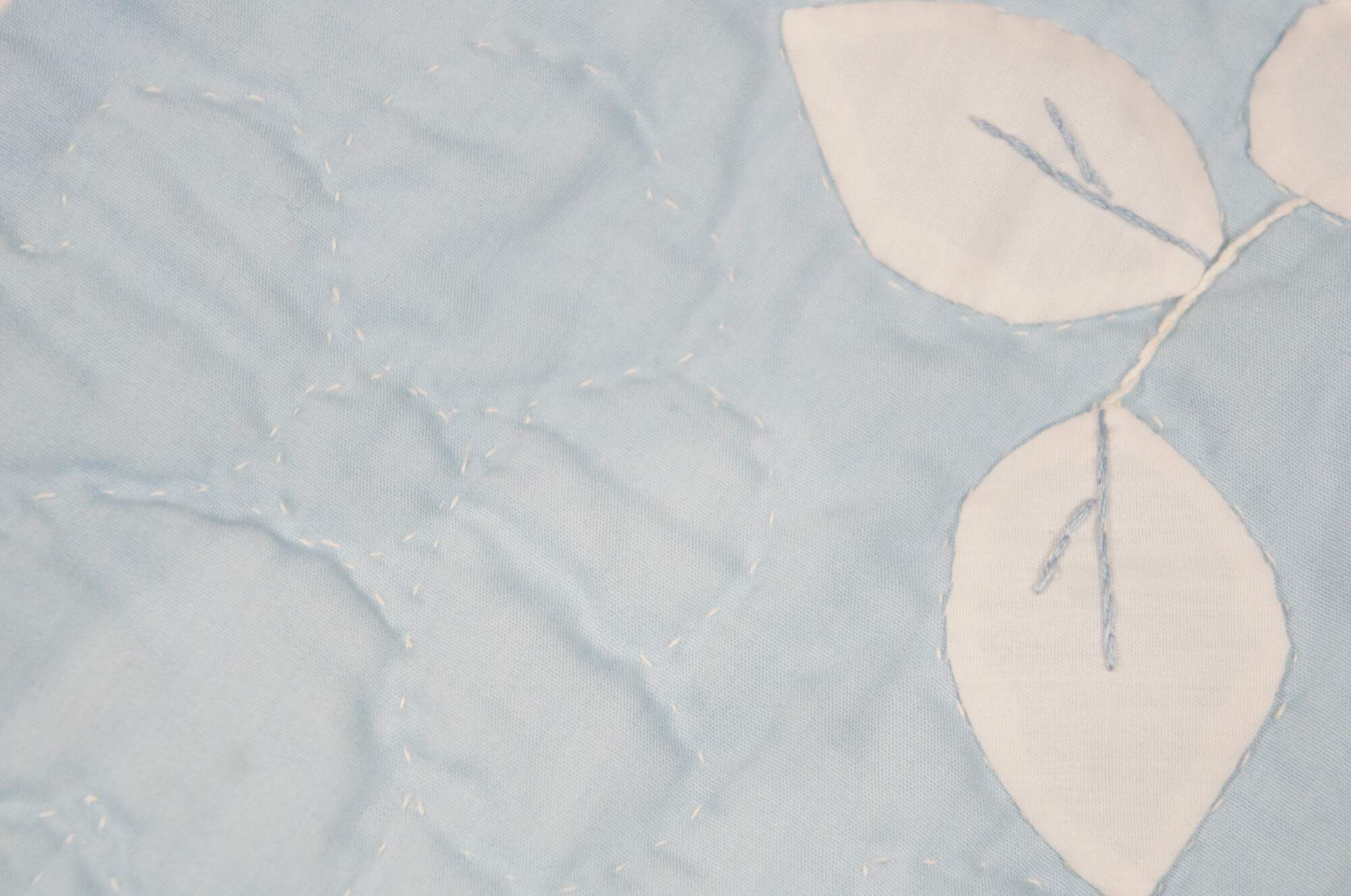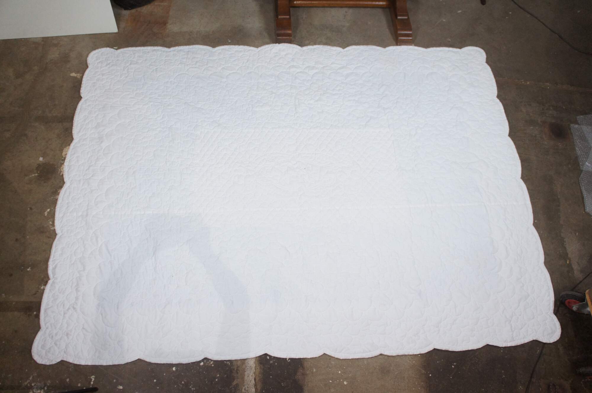 Pair of vintage 20th century blue and white cotton quilts / throw blankets / bedspreads , crafted from the Wedgwood Dogwood Blossom kit number 0119. Scalloped edge white and light blue blanket with applique dogwood blossoms, beautifully quilted with matching blossom shapes. Pale blue dots on the surface of the cotton showed the person using the kit where to quilt / embroider.