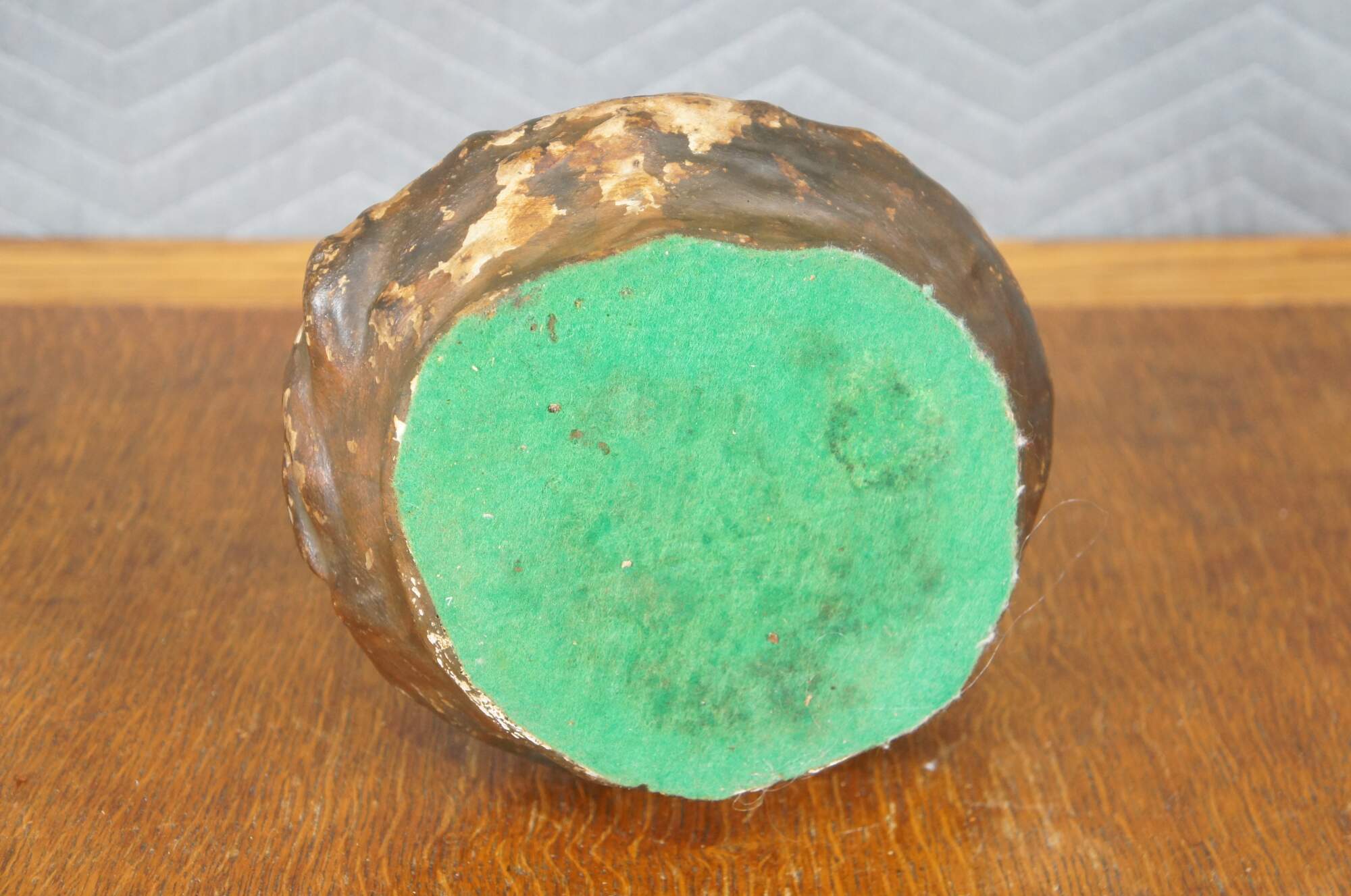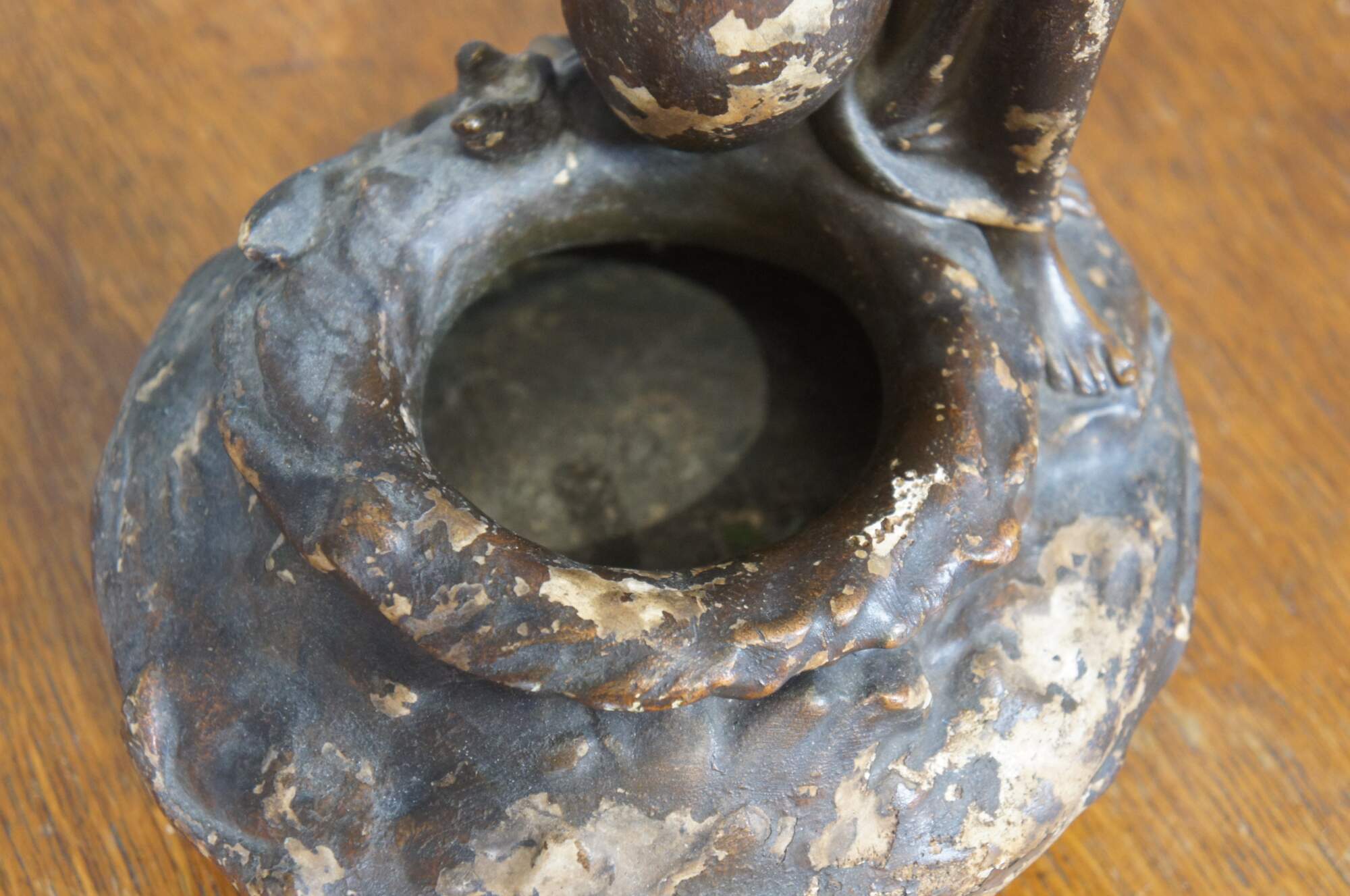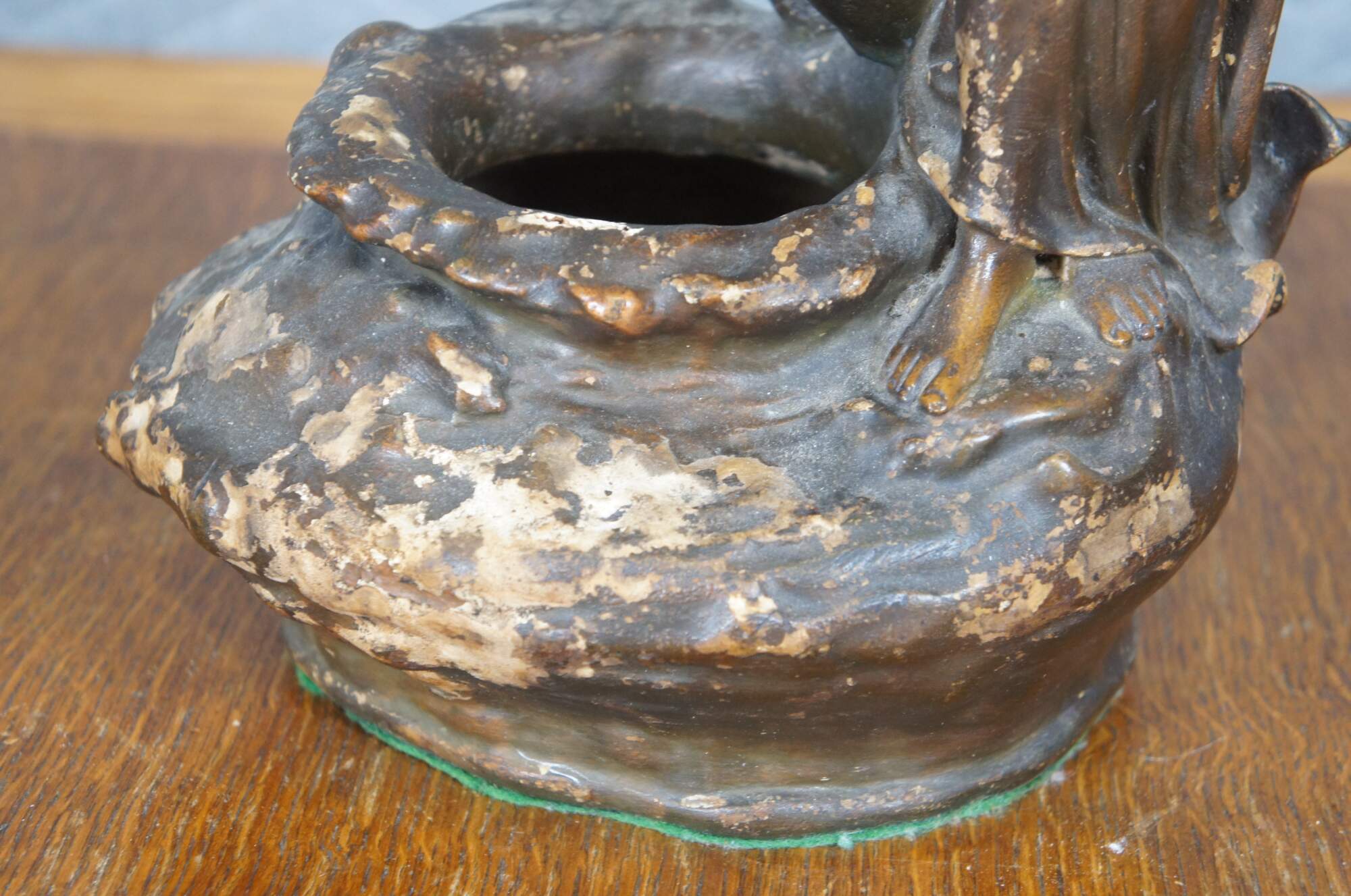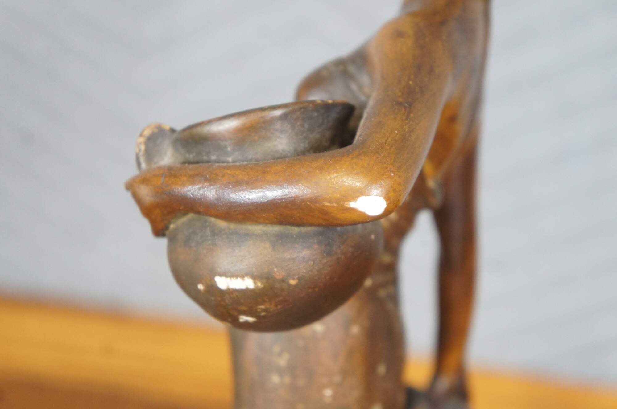 Mid to early 20th century brown painted chalkware figurine / short vase in the shape of tall neoclassical / art nouveau styled woman carrying water jugs at the edge of a well.