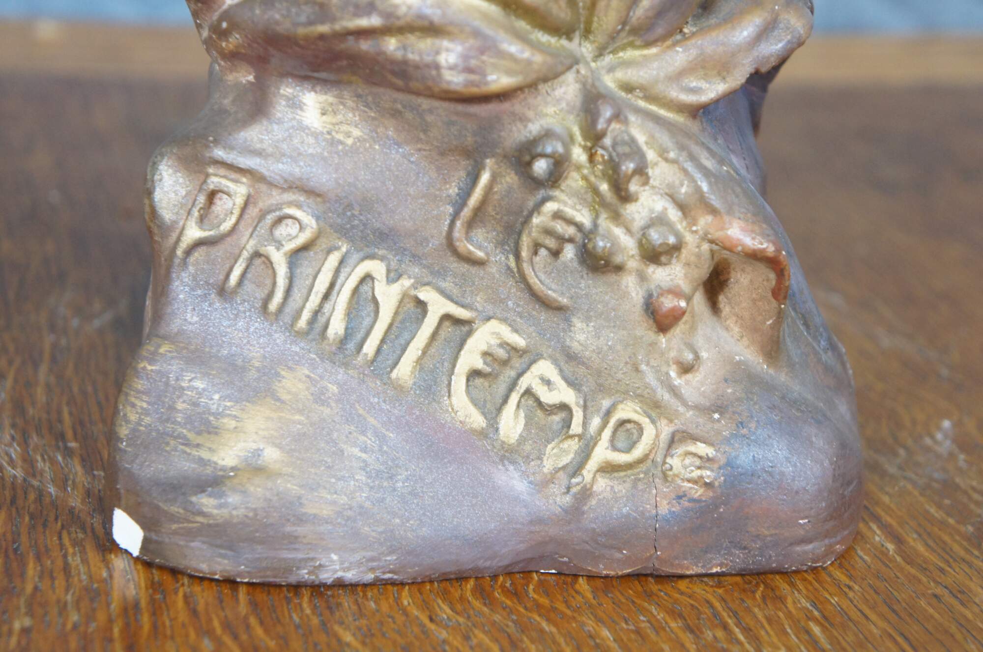Large mid to early 20th century Art Nouveau style painted chalkware bust titled Le Printemps (Spring) after H. L. Bläsche (active circa 1900-1950). Depicts the personification of spring as a nude young woman with flowing hair trimmed with flowers.